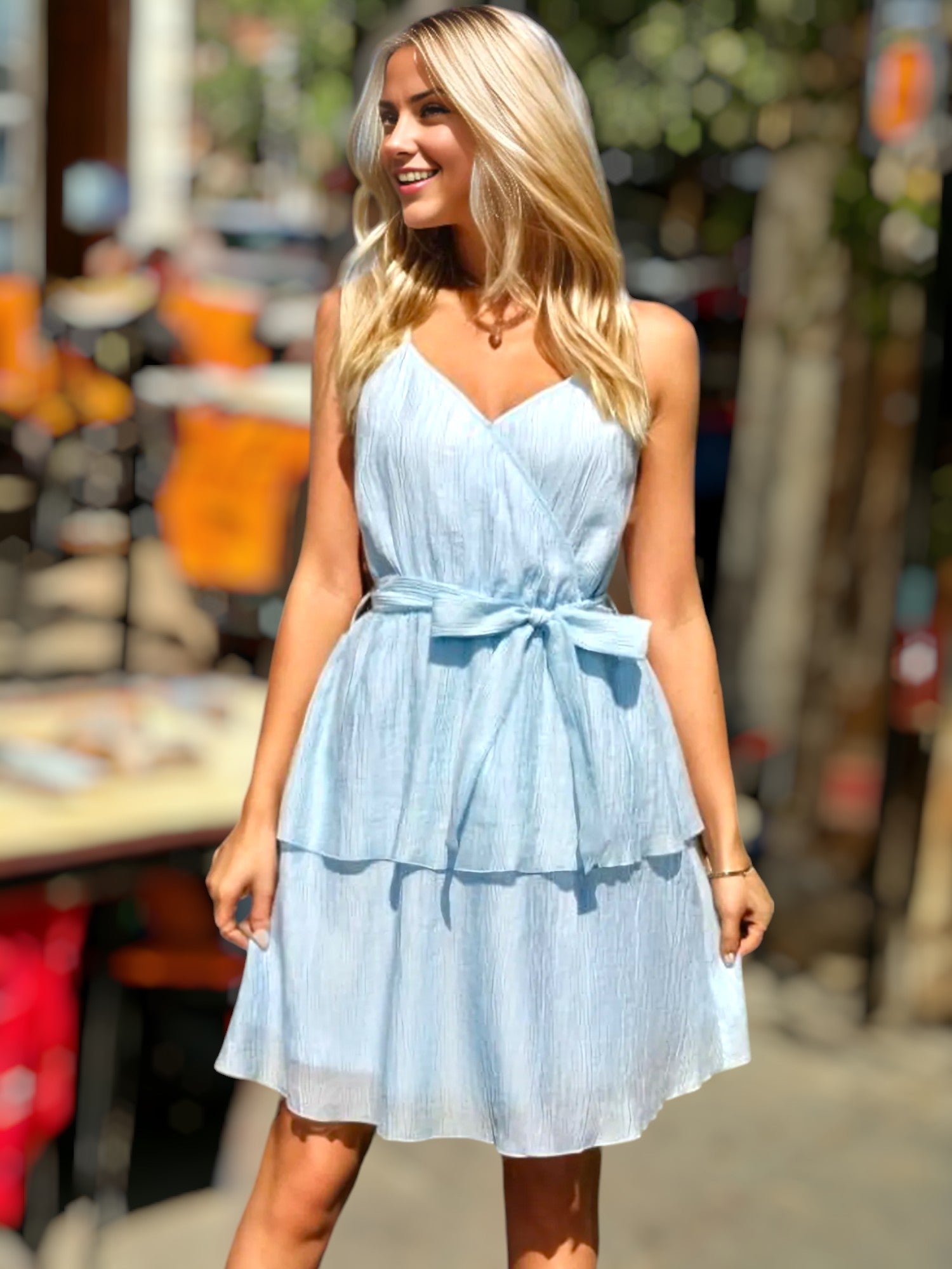 El vestido Anna-Kaci está elaborado con un hermoso material texturizado. Tiene un color liso, escote cruzado, tirantes finos, detalle de lazo en la cintura, falda escalonada y largo por encima de la rodilla. Combínalo con aretes de perlas y tacones para lograr un look deslumbrante.