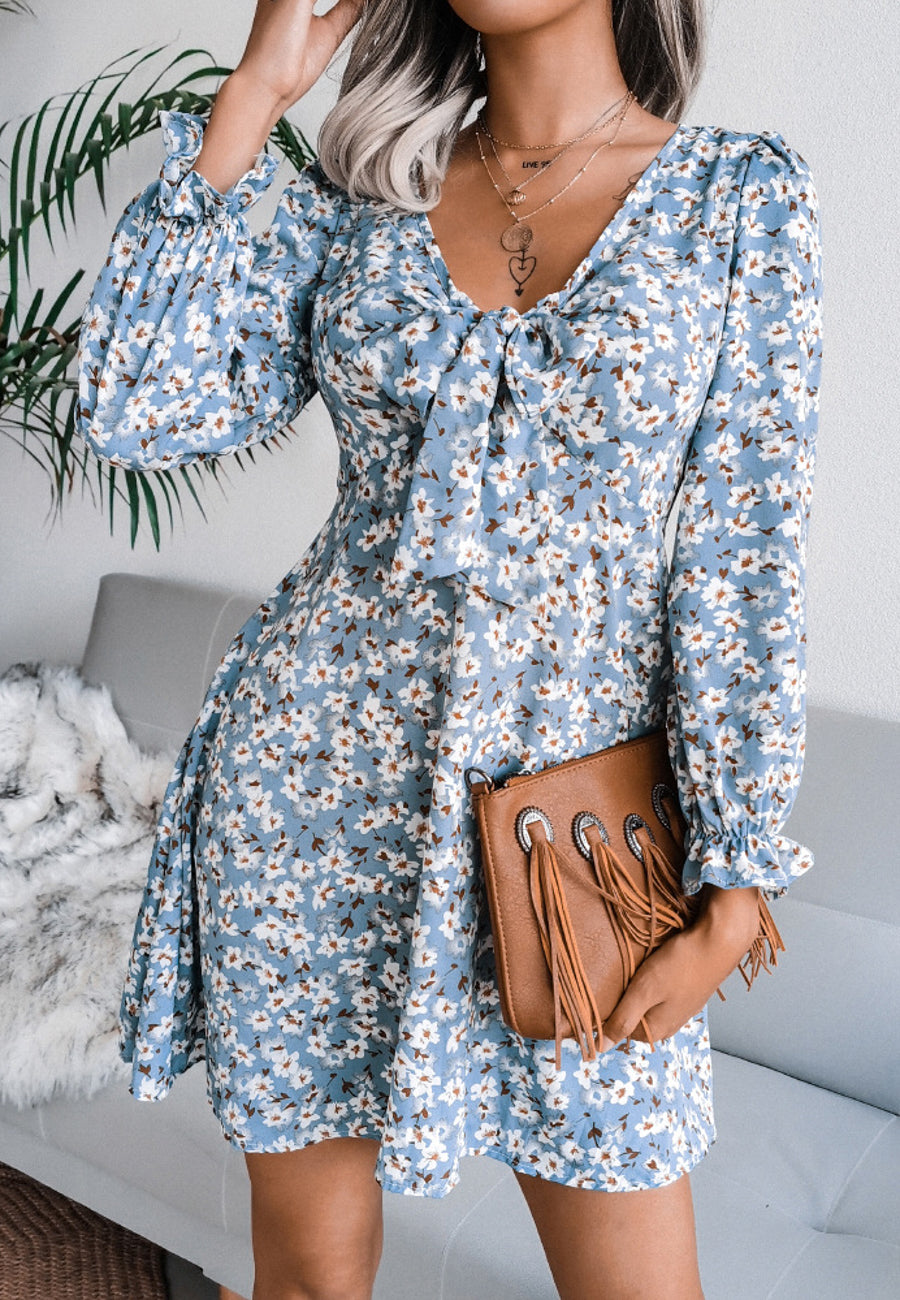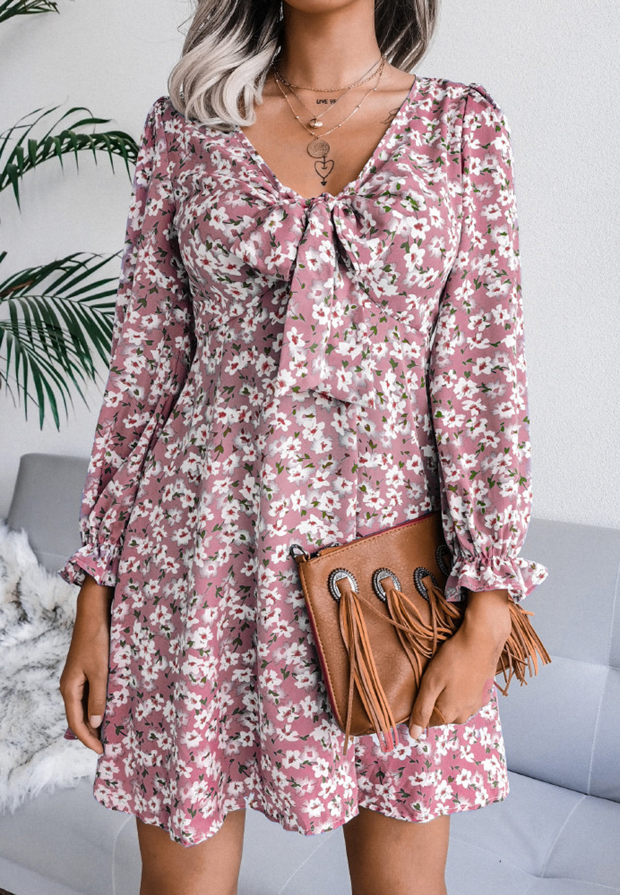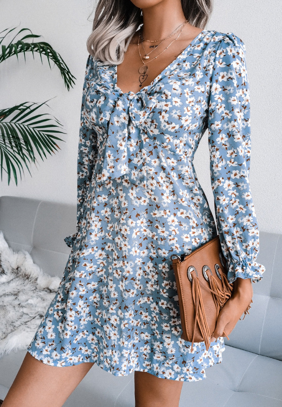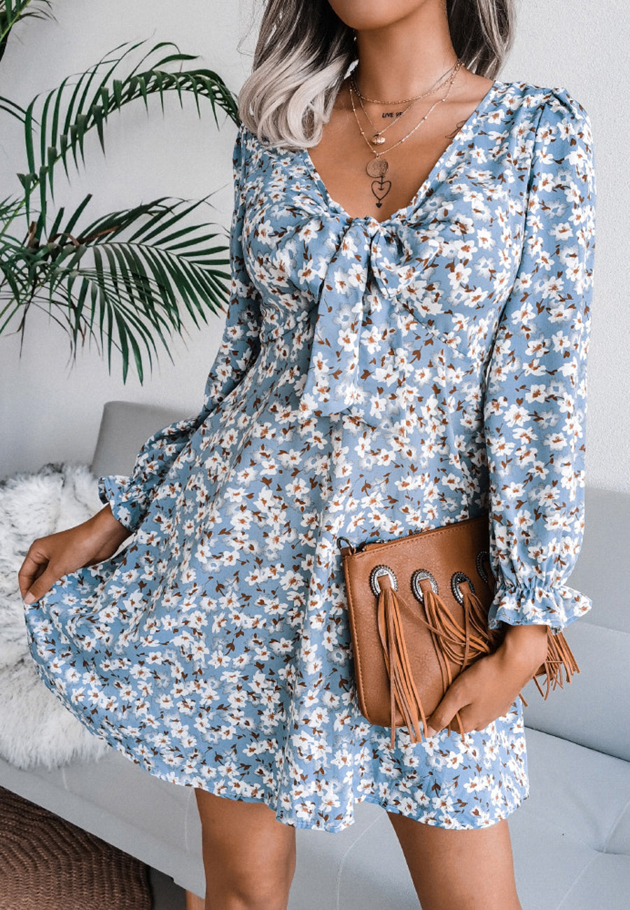 Vestido floral con escote en V y lazo en la parte delantera