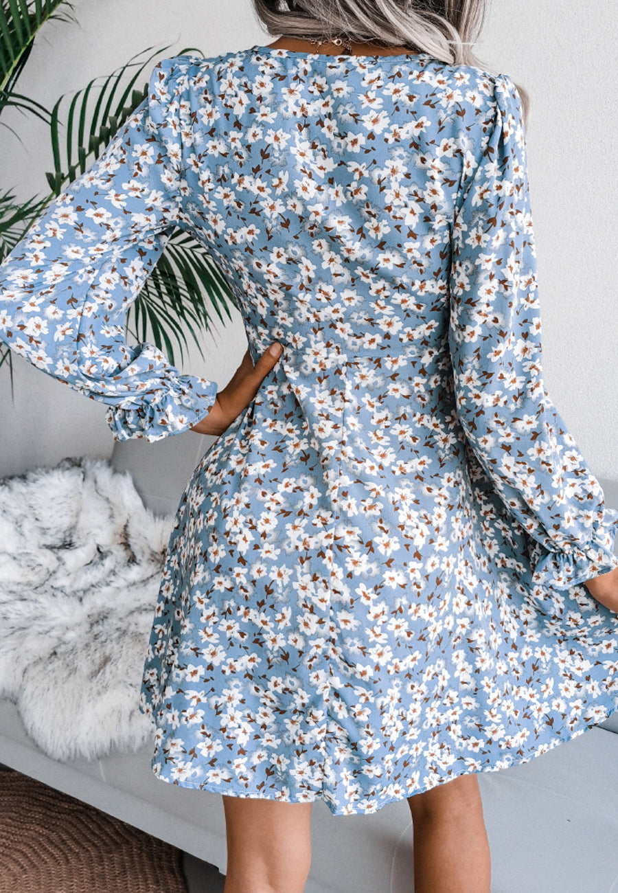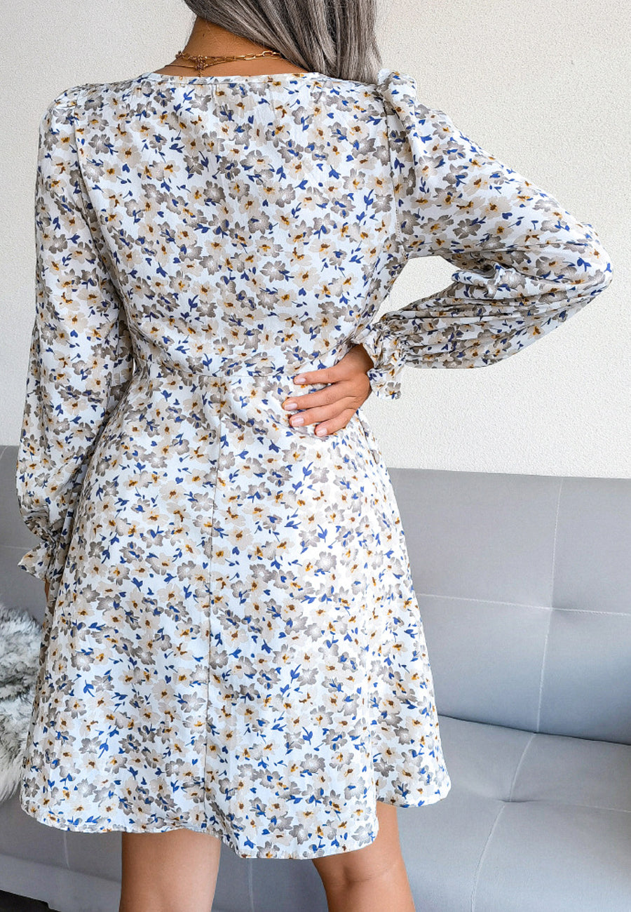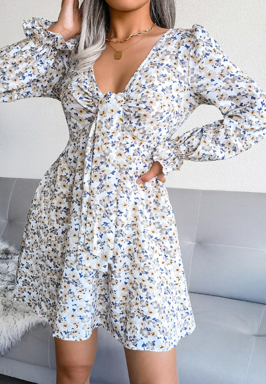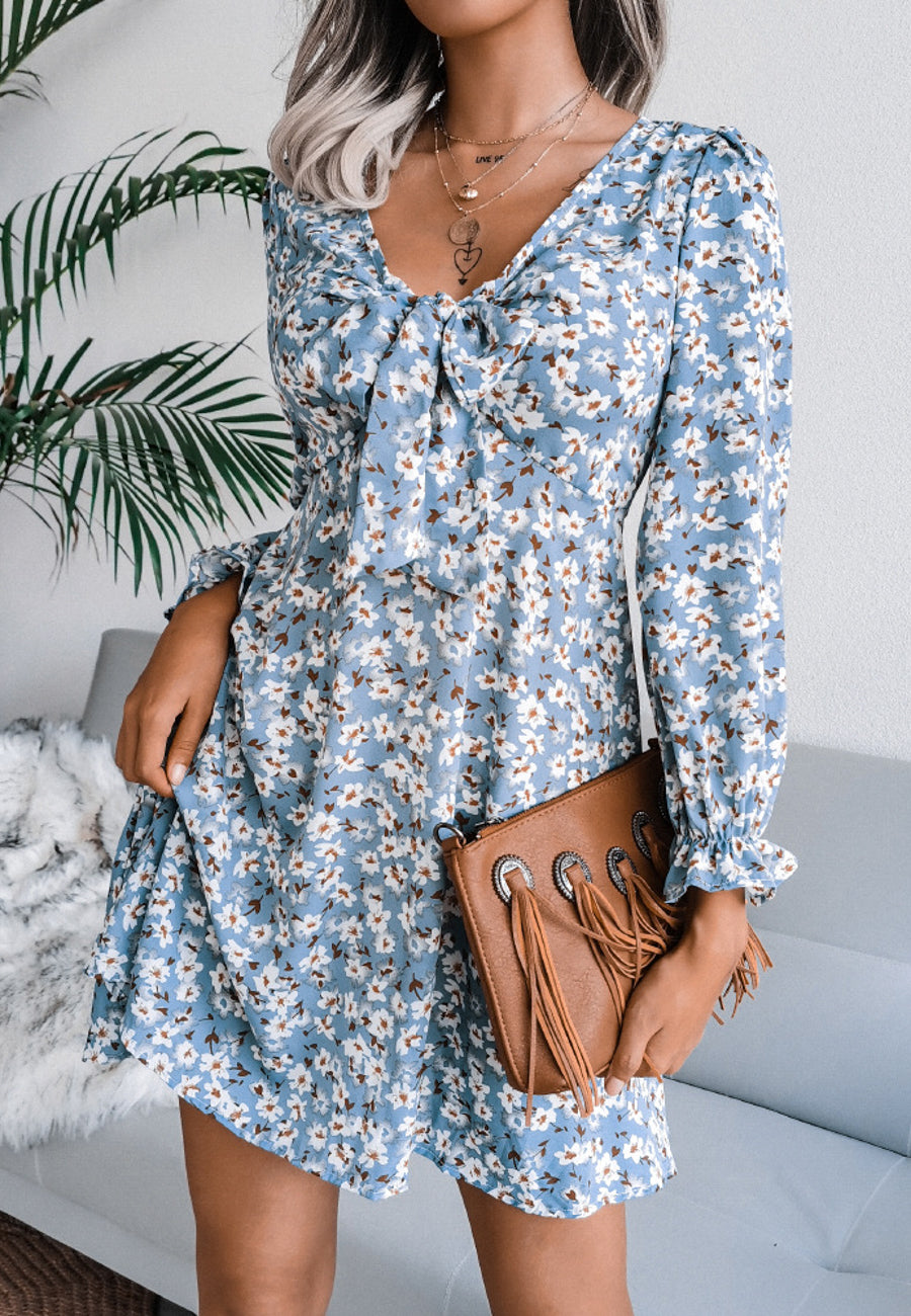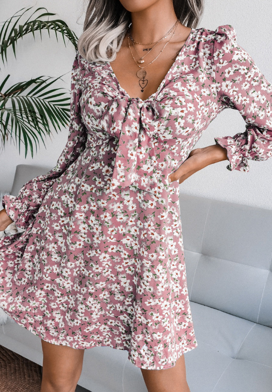 Vestido floral con escote en V y lazo en la parte delantera