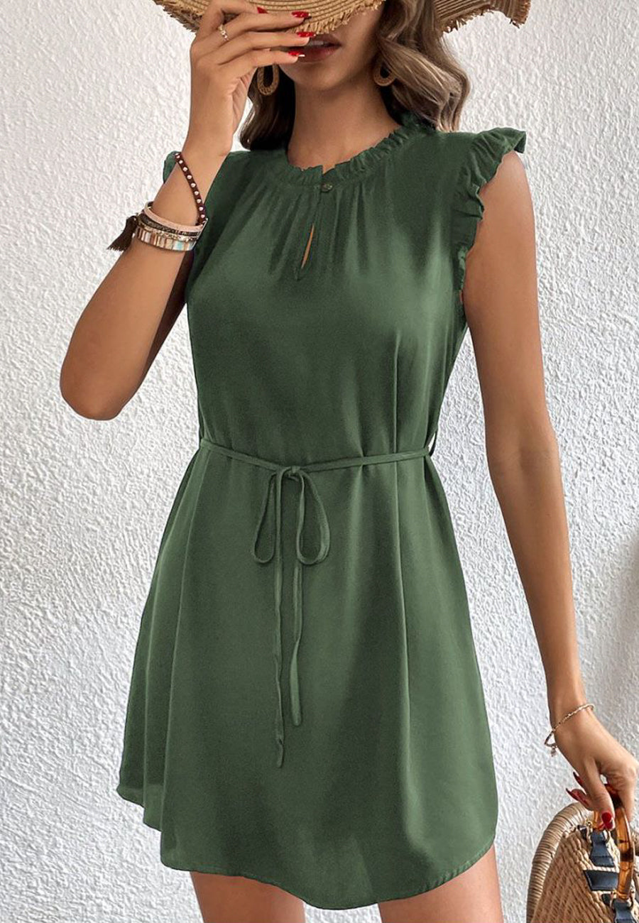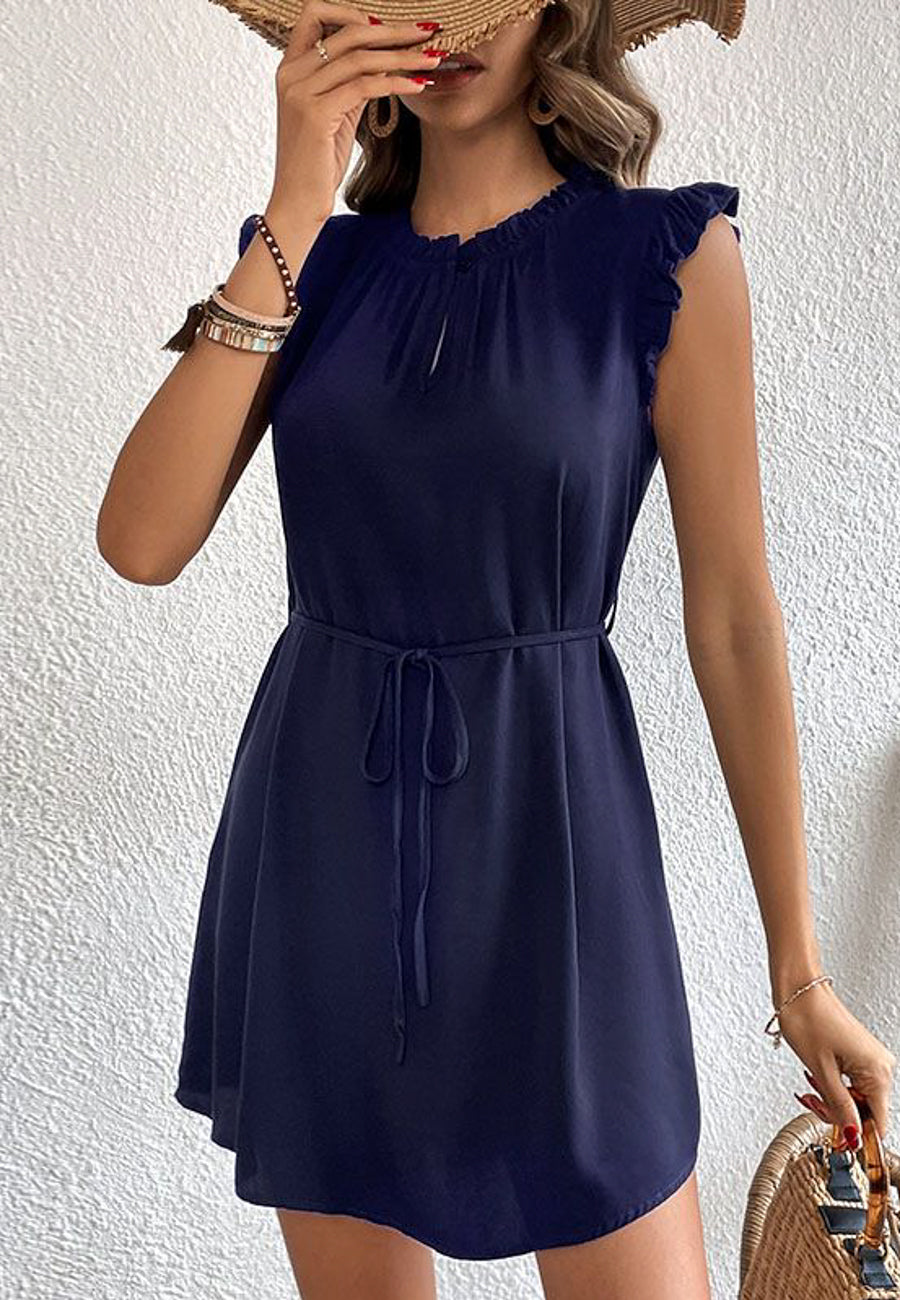 El vestido Anna-Kaci tiene un diseño de abertura frontal muy coqueto. Tiene un color liso, escote redondo, detalle de lazo en la cintura, hombros con volados, sin mangas, falda suelta y largo por encima de la rodilla. Combínalo con un sombrero para el sol y sandalias para lograr un look increíble.