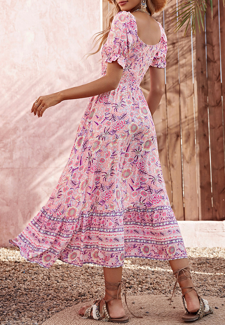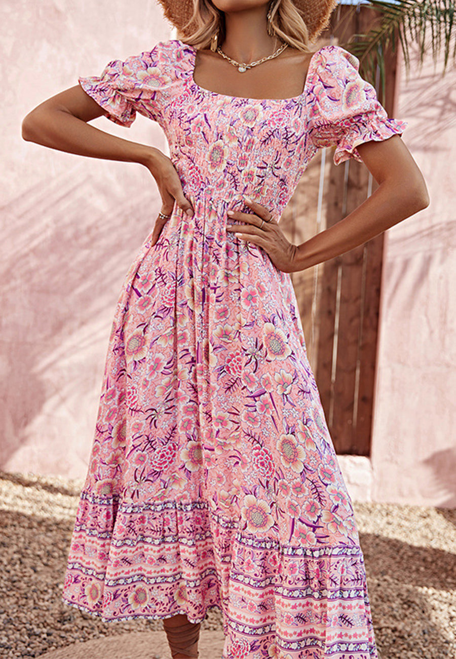 El vestido Anna-Kaci tiene un escote cuadrado clásico, un estampado floral, mangas abullonadas, una falda vaporosa y un largo hasta la mitad de la pantorrilla. Combínalo con un collar y tacones para lograr un look espectacular.