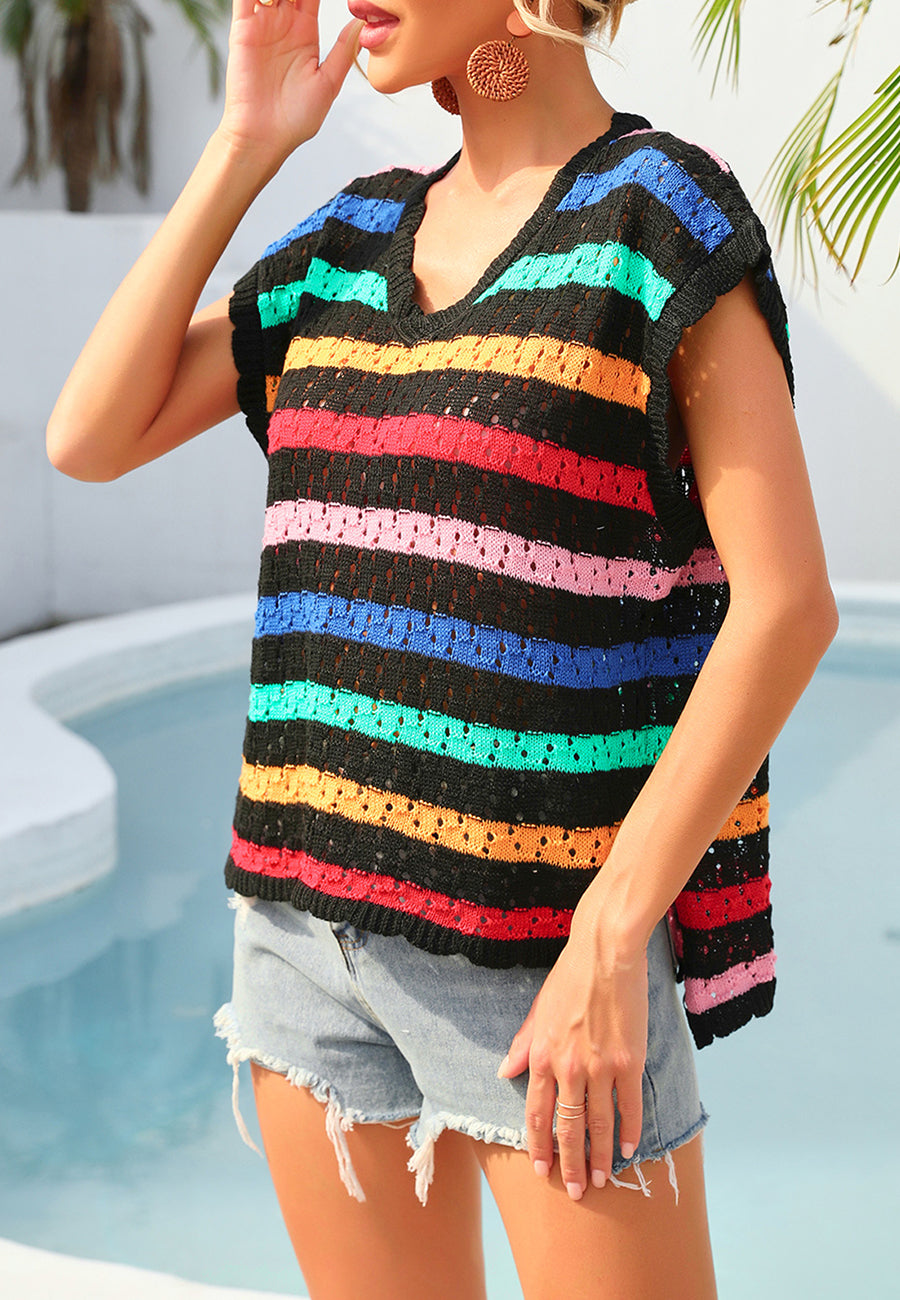 El chaleco Anna-Kaci tiene un borde festoneado divertido. Tiene escote en V, patrón de rayas multicolor y corte holgado. Combínalo con pantalones cortos deshilachados y botas militares para lograr un estilo moderno.