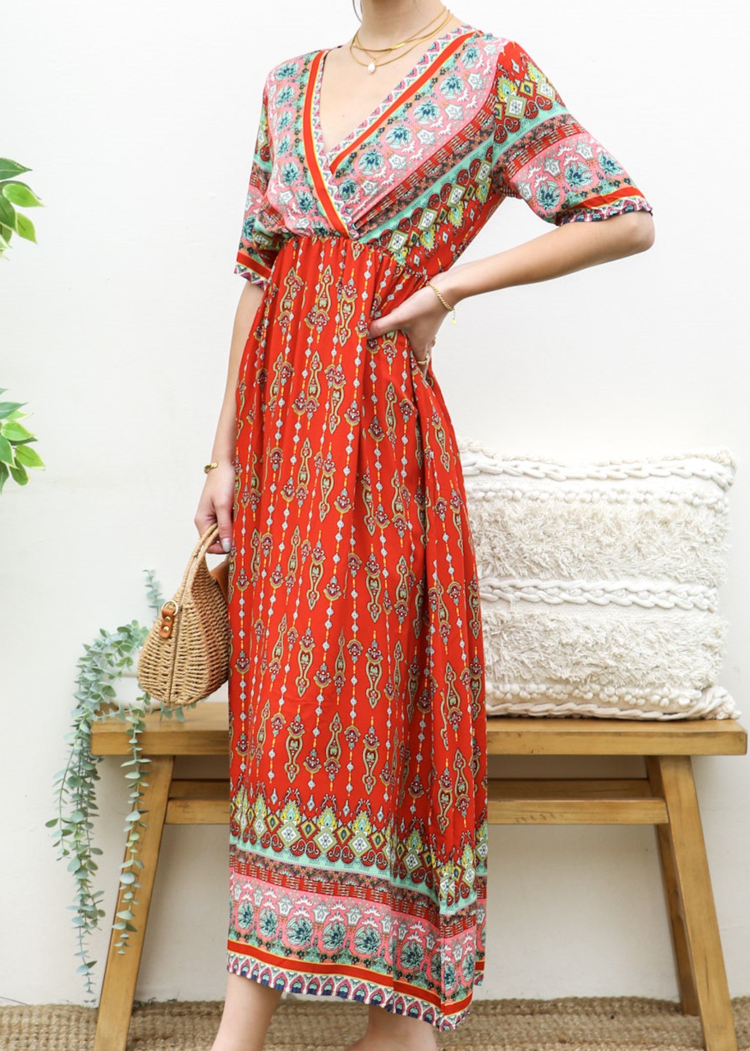 El vestido Anna-Kaci tiene un escote cruzado clásico, un estampado bohemio, mangas hasta el codo, falda vaporosa y largo por encima del tobillo. Combínalo con gafas de sol y sandalias para lograr un look encantador.