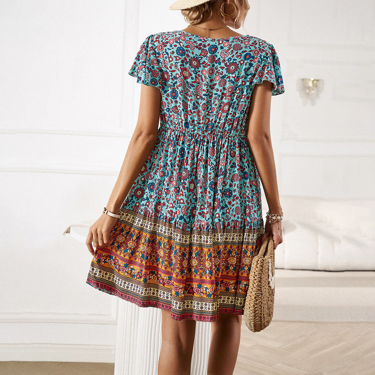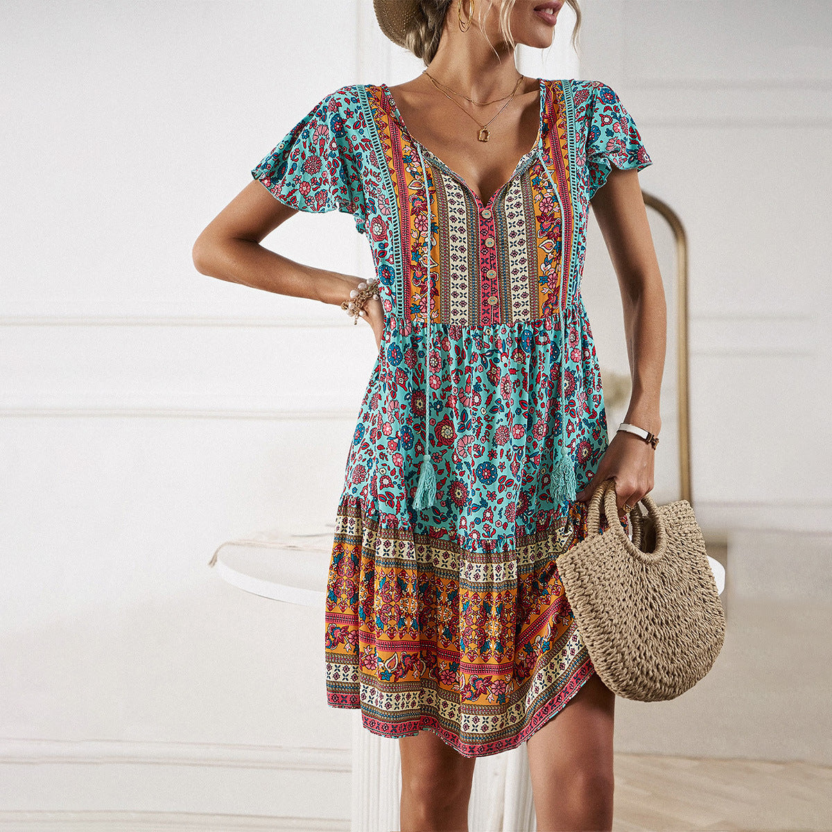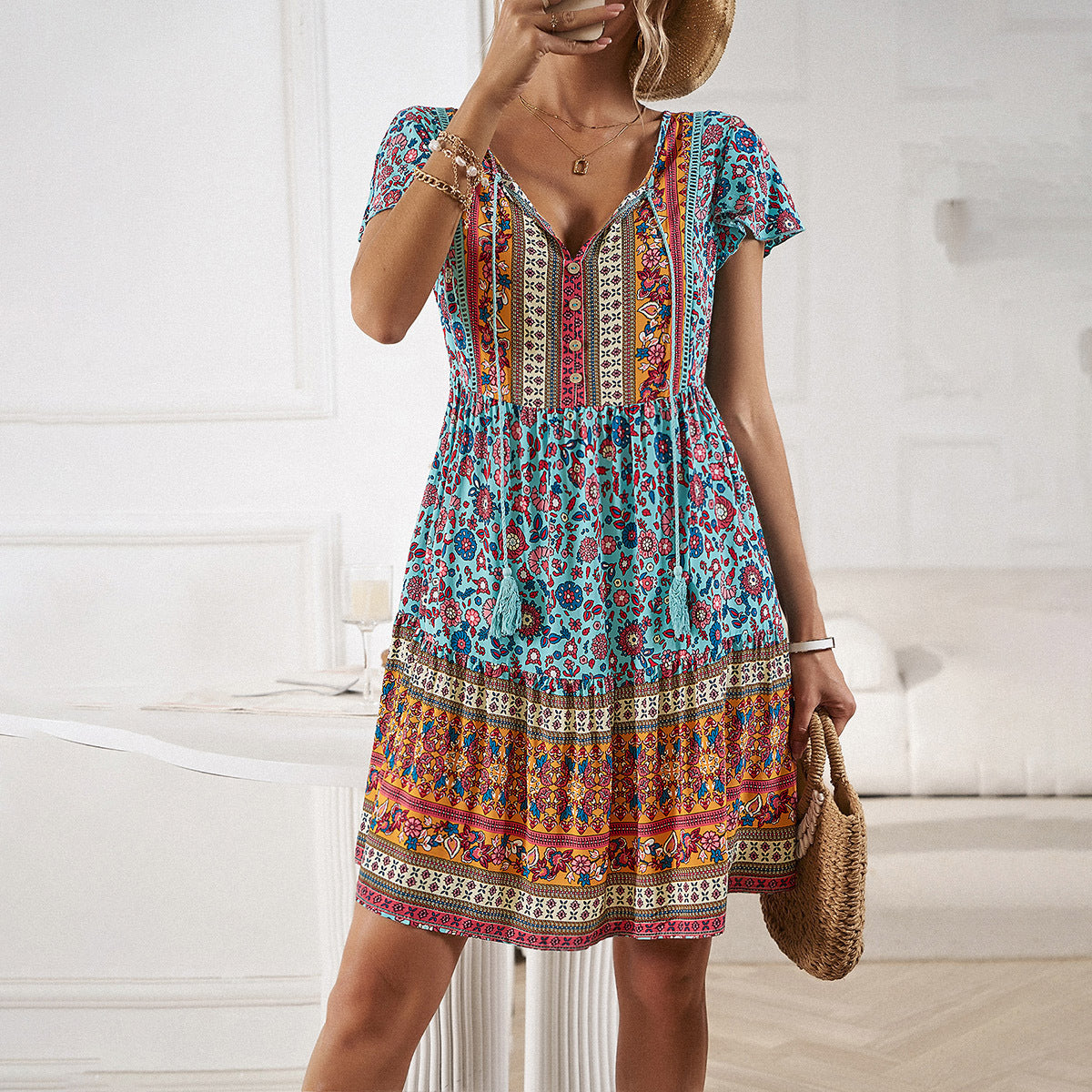 El vestido Anna-Kaci tiene un bonito detalle de borlas en el cuello. Tiene un estampado bohemio, botones en el frente, mangas cortas, falda vaporosa y largo por encima de la rodilla. Combínalo con un sombrero fedora y botas para lograr un look fabuloso.