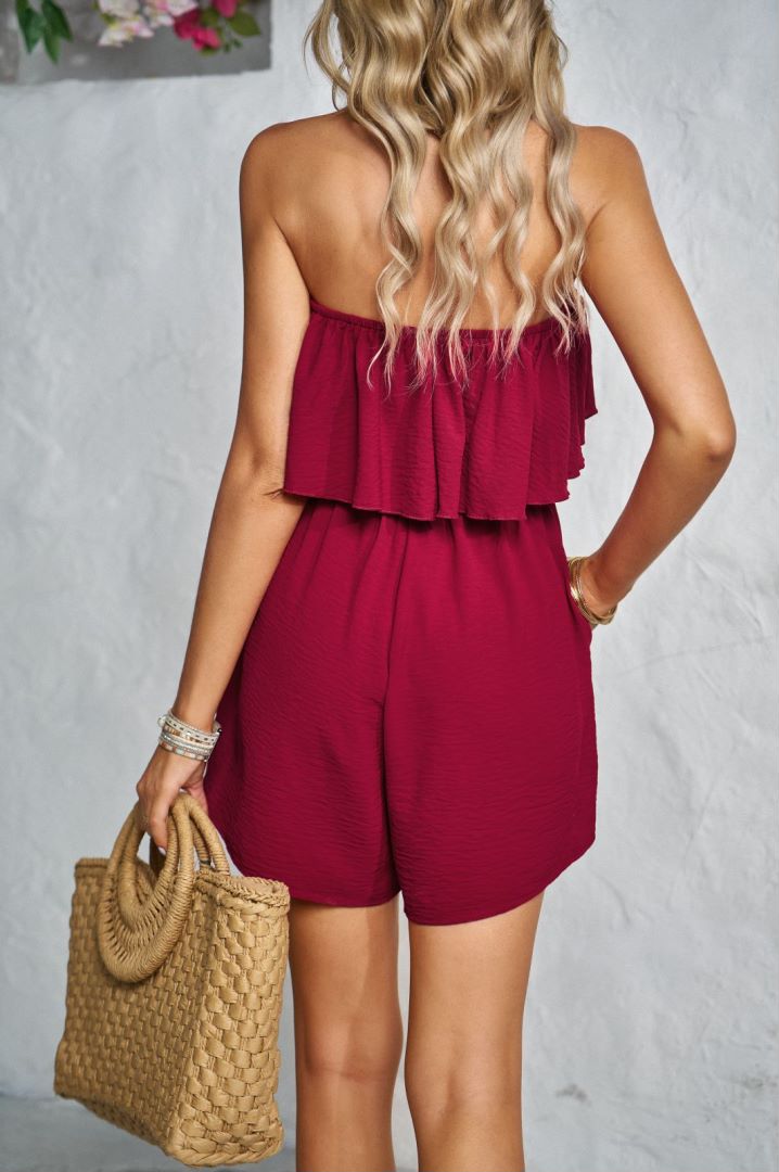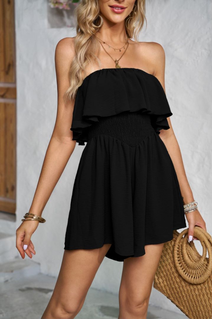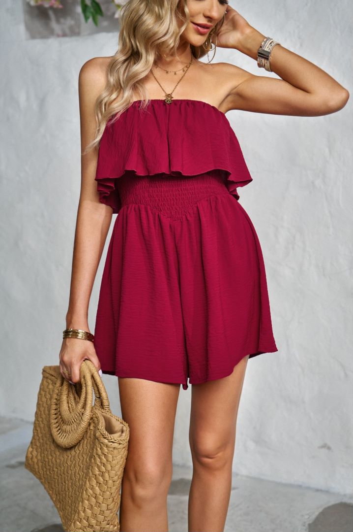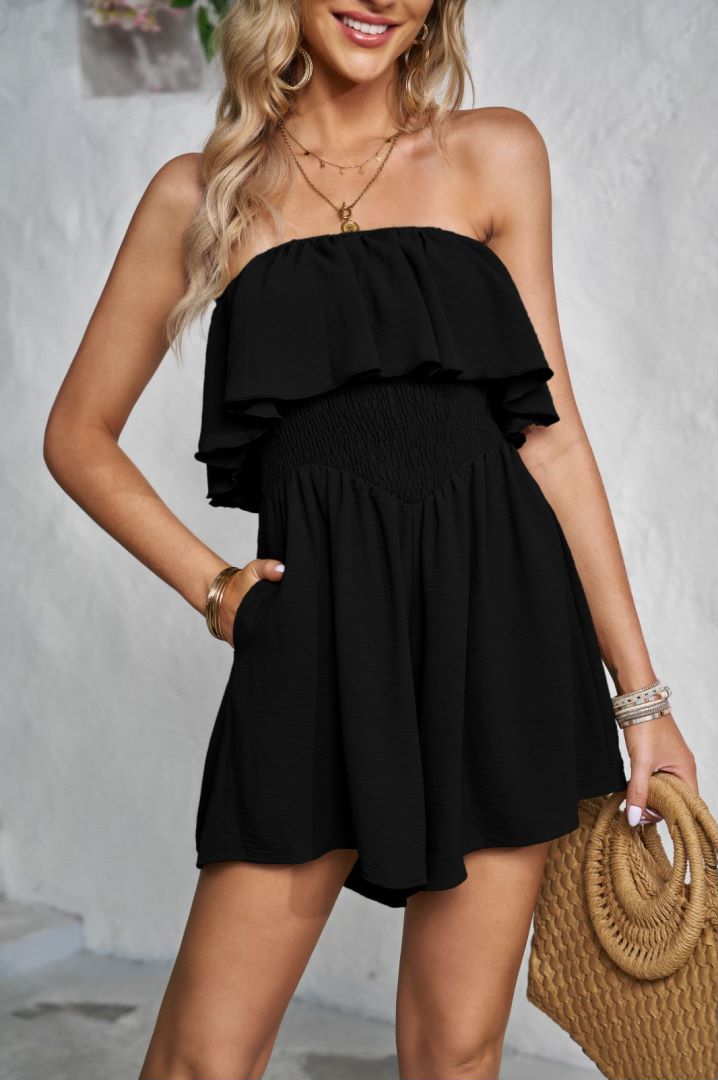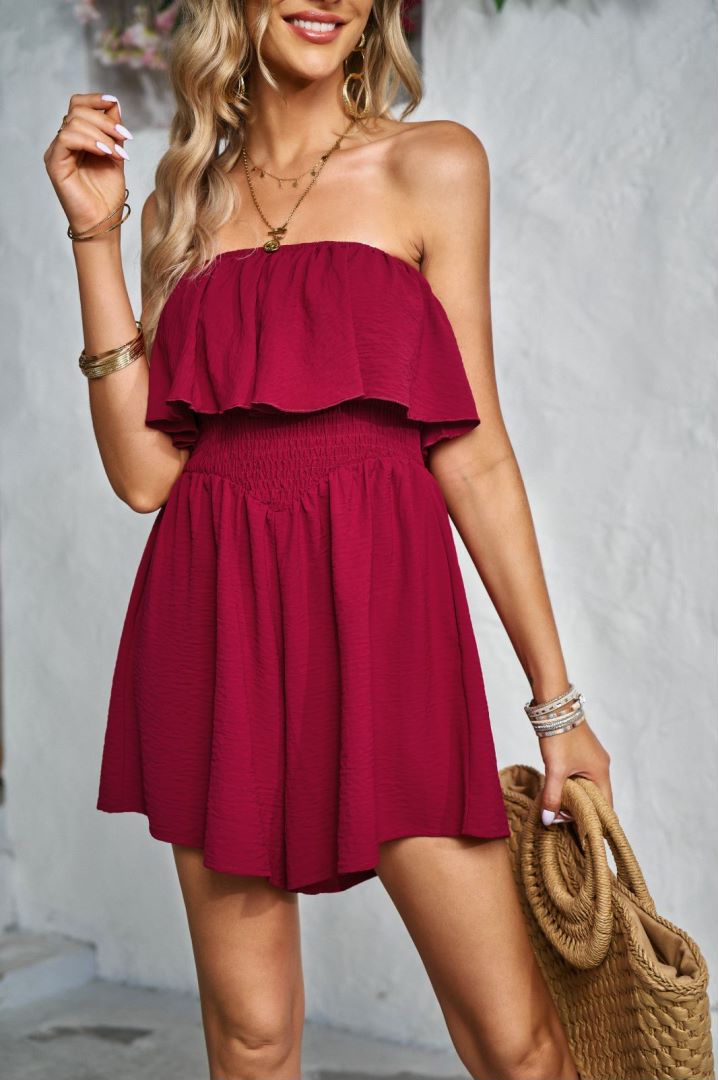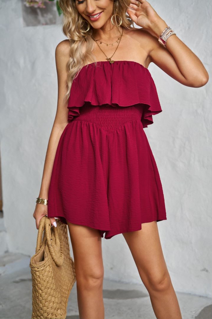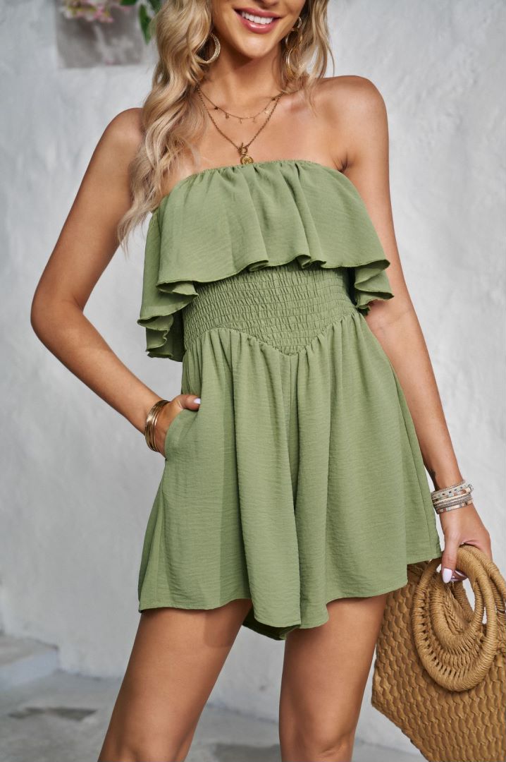 El mono Anna-Kaci tiene un hermoso fruncido en la cintura. Es de color liso, tiene un top con volados, es sin tirantes y tiene un corte regular. Combínalo con un gorro y botas para lograr un look fantástico.