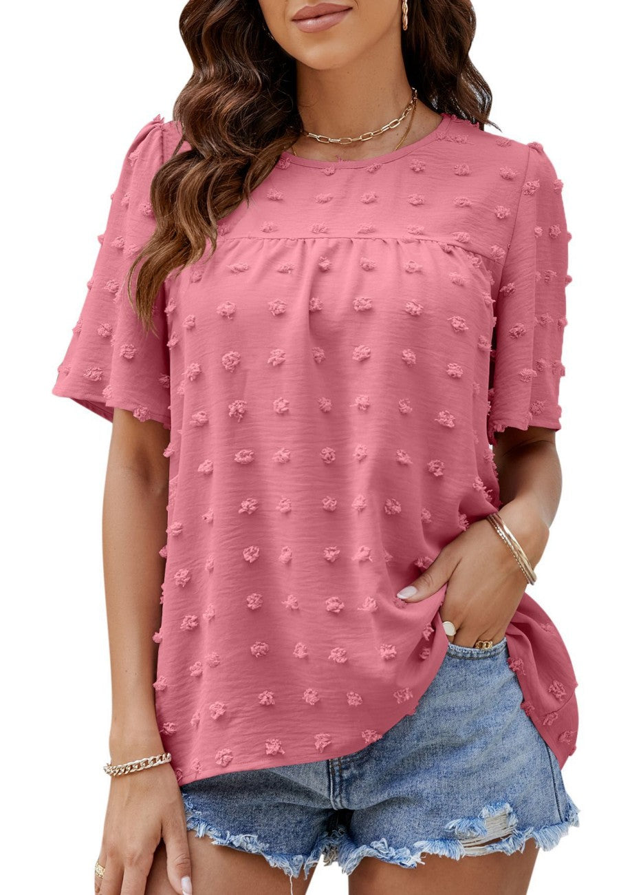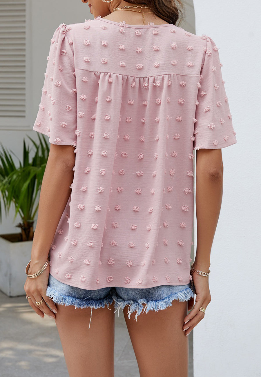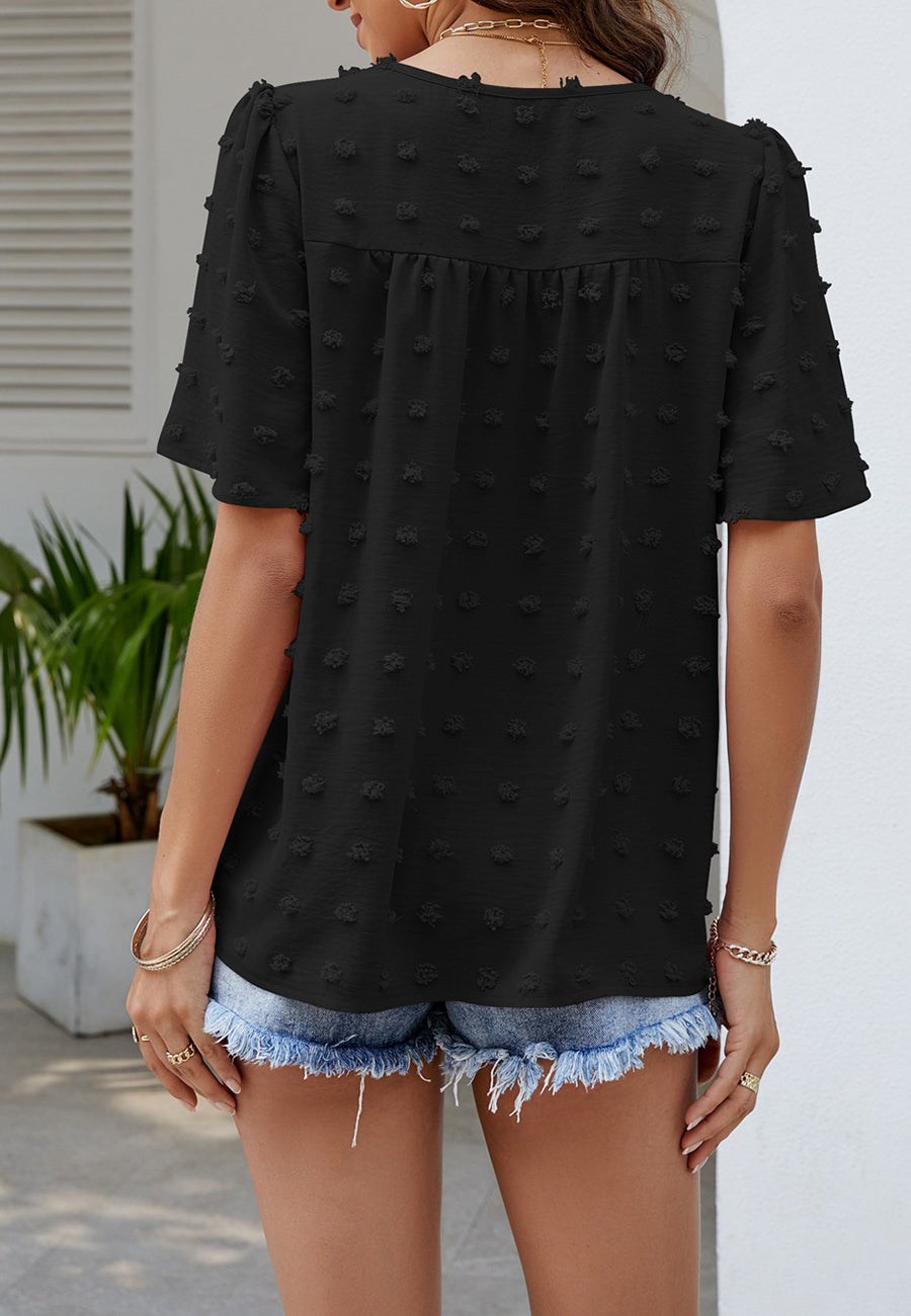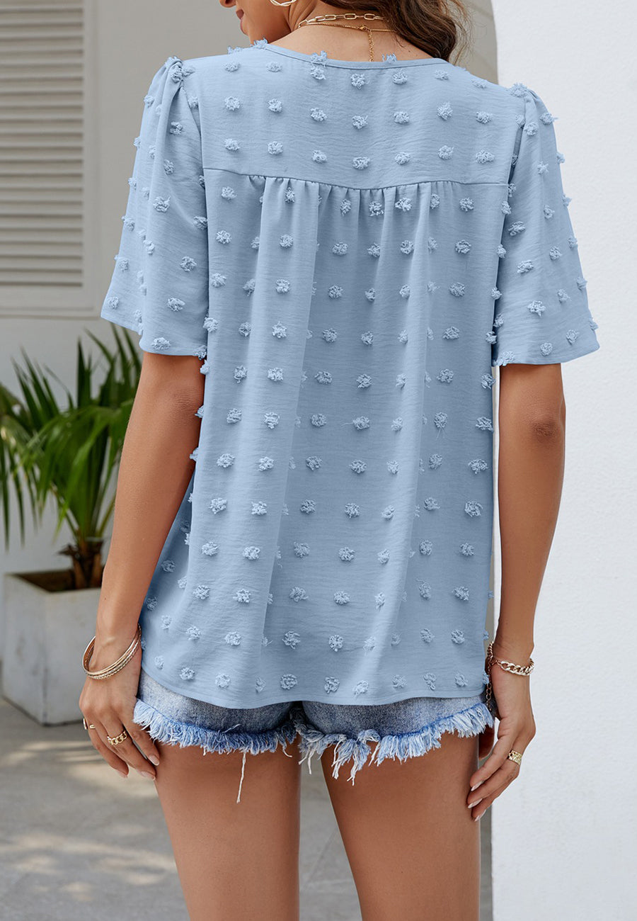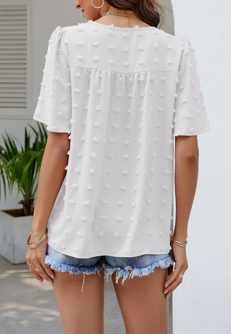 La blusa Anna-Kaci está decorada con un hermoso tejido de lunares suizos. Tiene un color liso, cuello redondo, mangas cortas y un corte holgado. Combínala con pantalones cortos deshilachados y zapatillas para lograr un look contrastante.