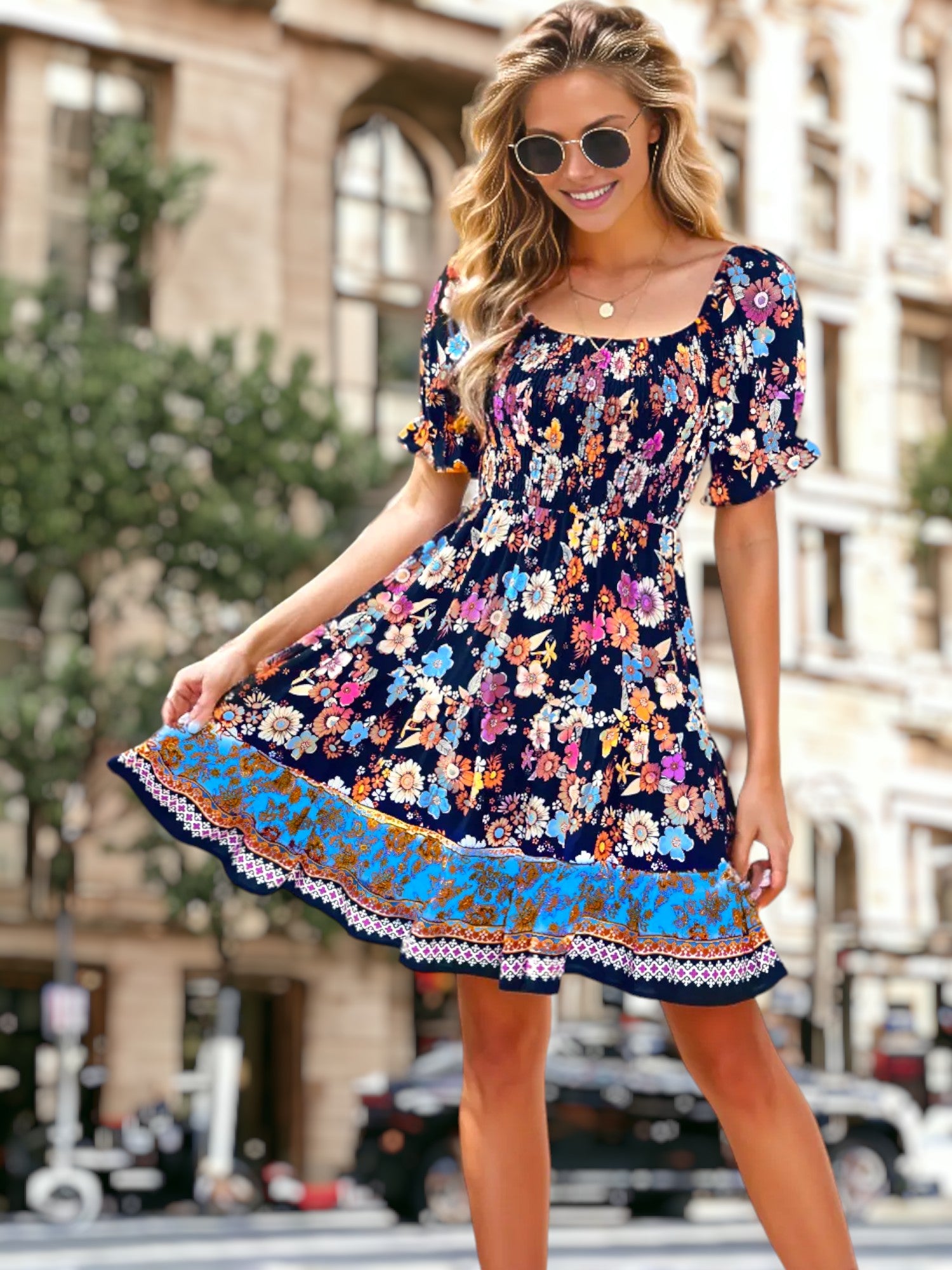 El vestido Anna-Kaci tiene un precioso estampado floral multicolor. Tiene escote cuadrado, mangas abullonadas, corpiño fruncido, falda vaporosa y largo por encima de la rodilla. Combínalo con una diadema y sandalias para lograr un look femenino.
