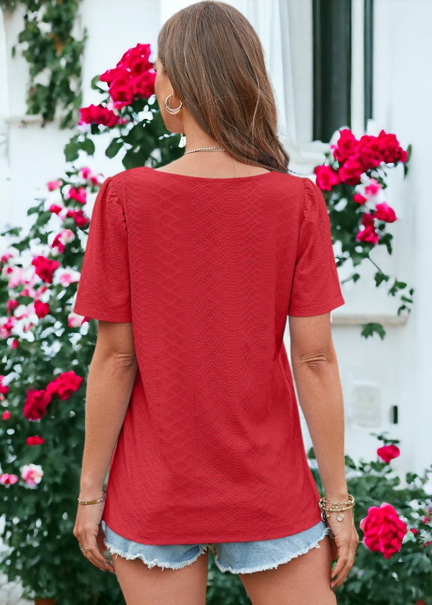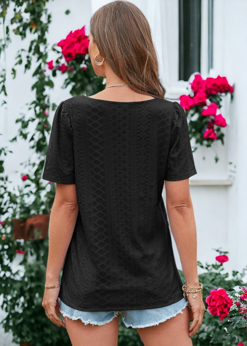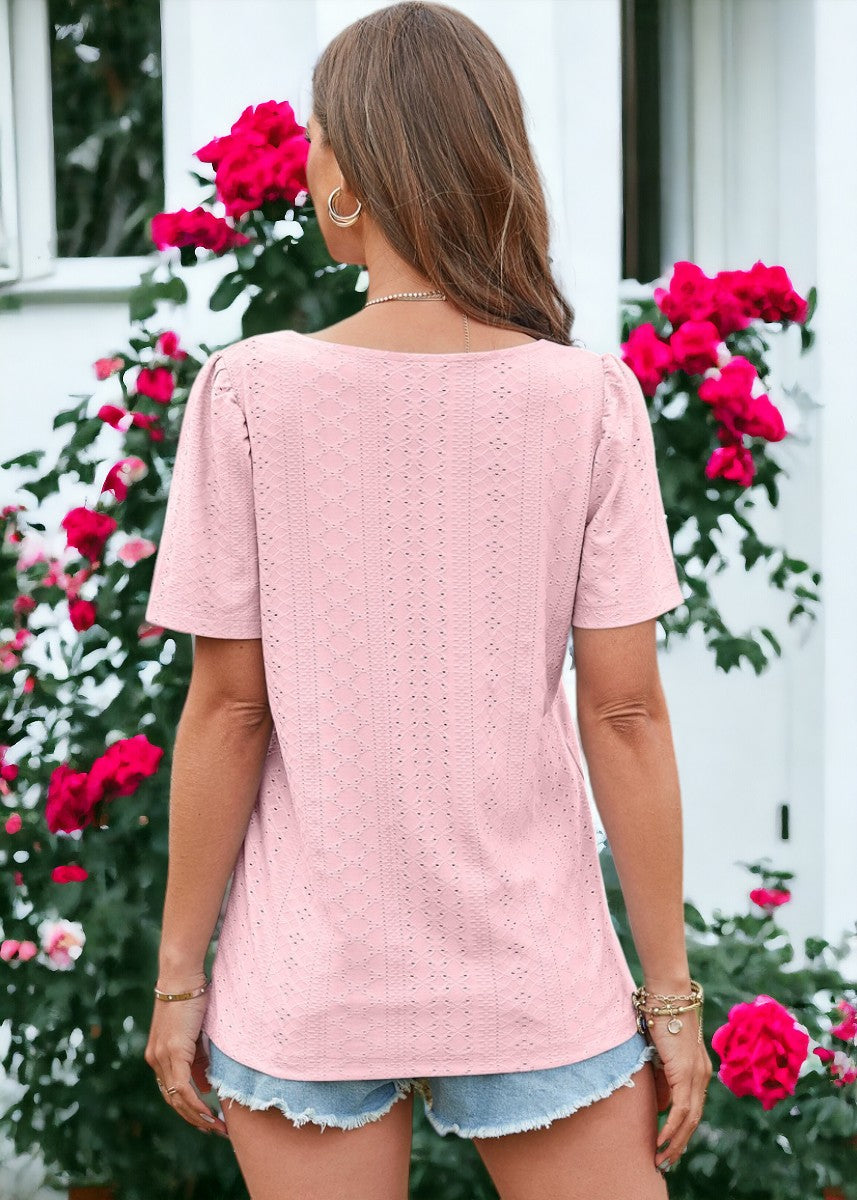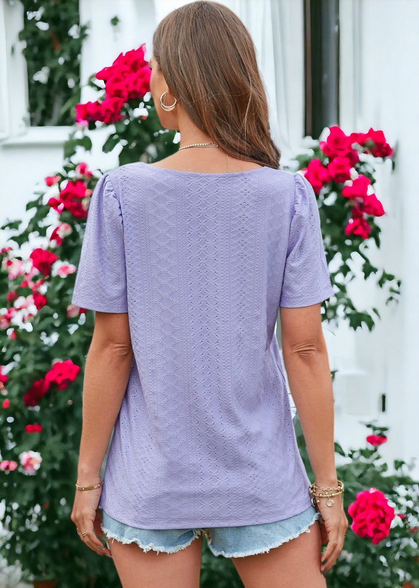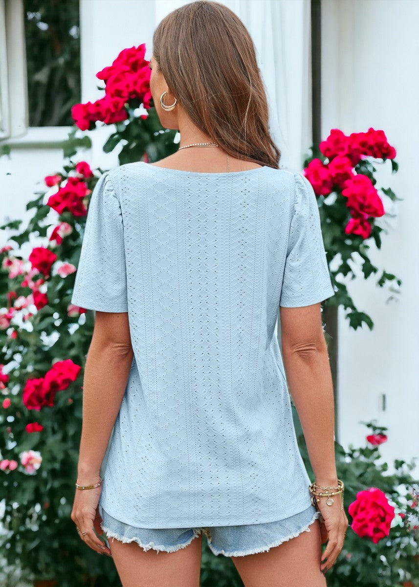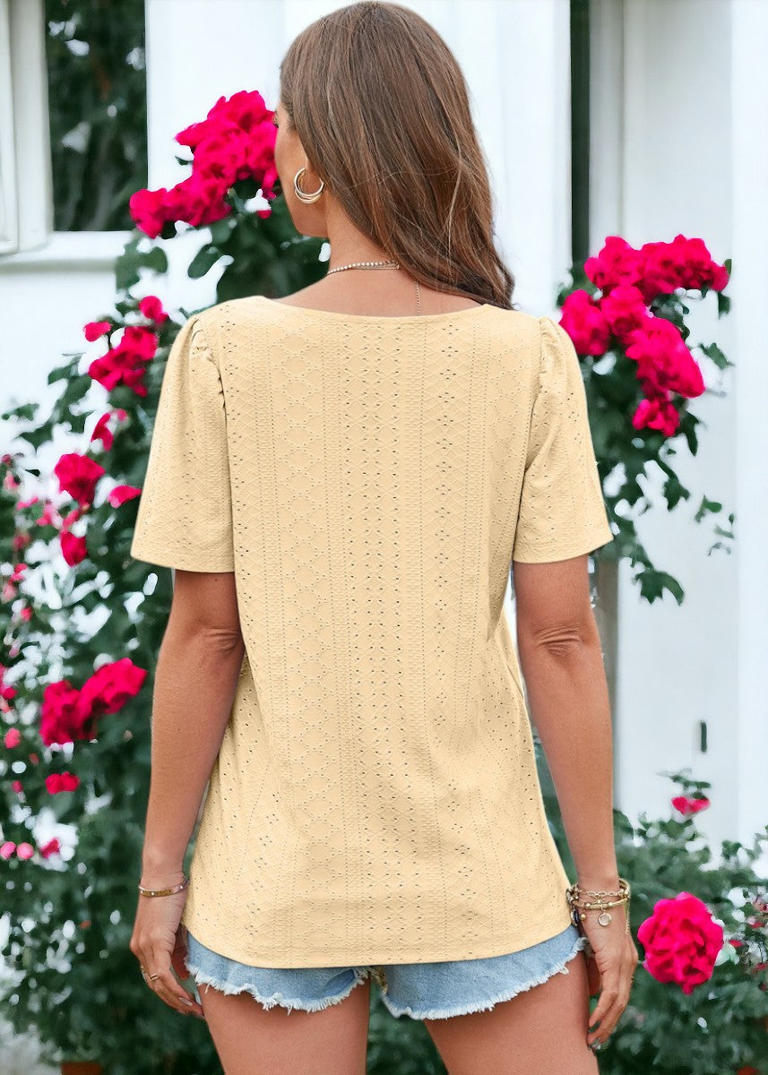 La blusa Anna-Kaci está decorada con un hermoso tejido con ojales. Tiene un color liso, escote cuadrado, mangas cortas y corte regular. Combínala con pantalones blancos y sandalias para lograr un estilo clásico.