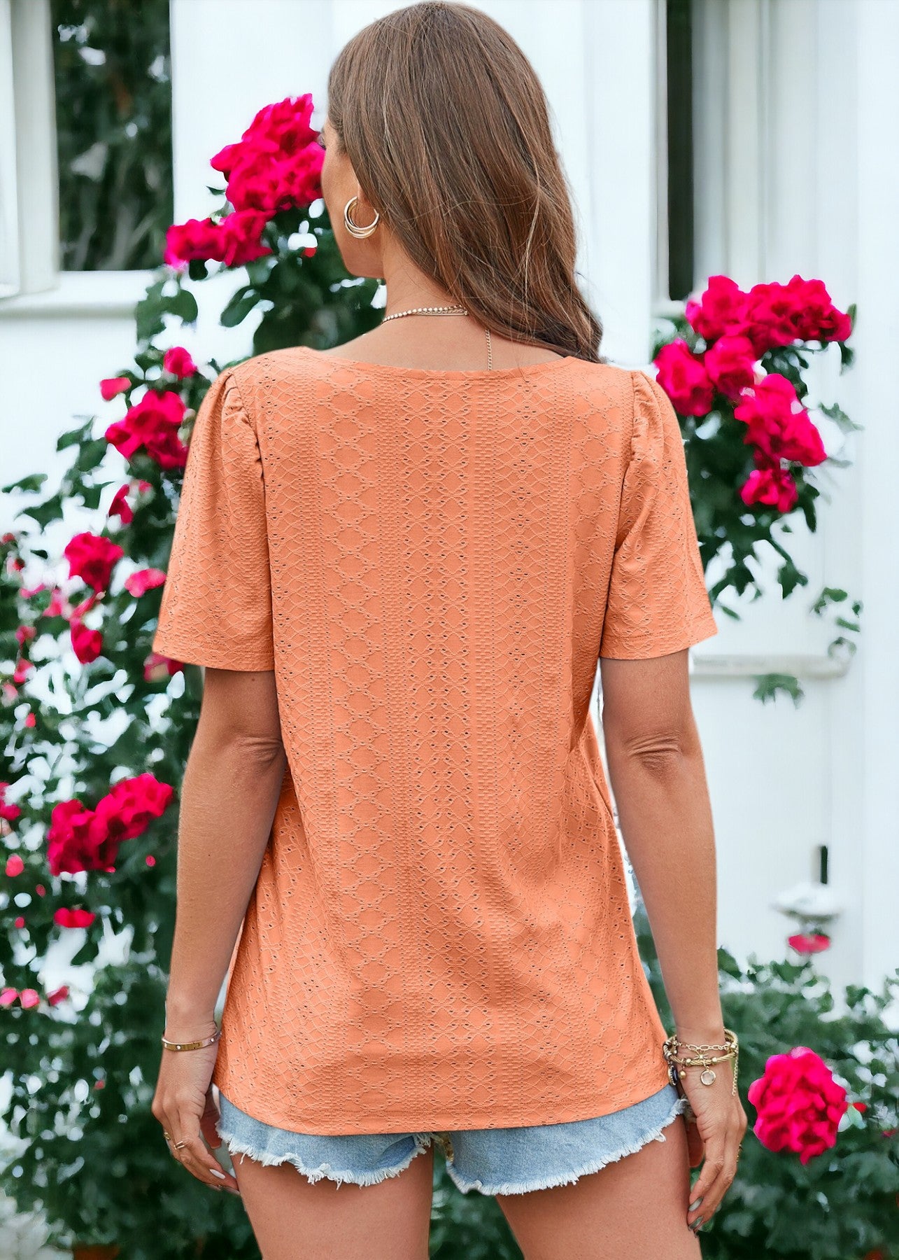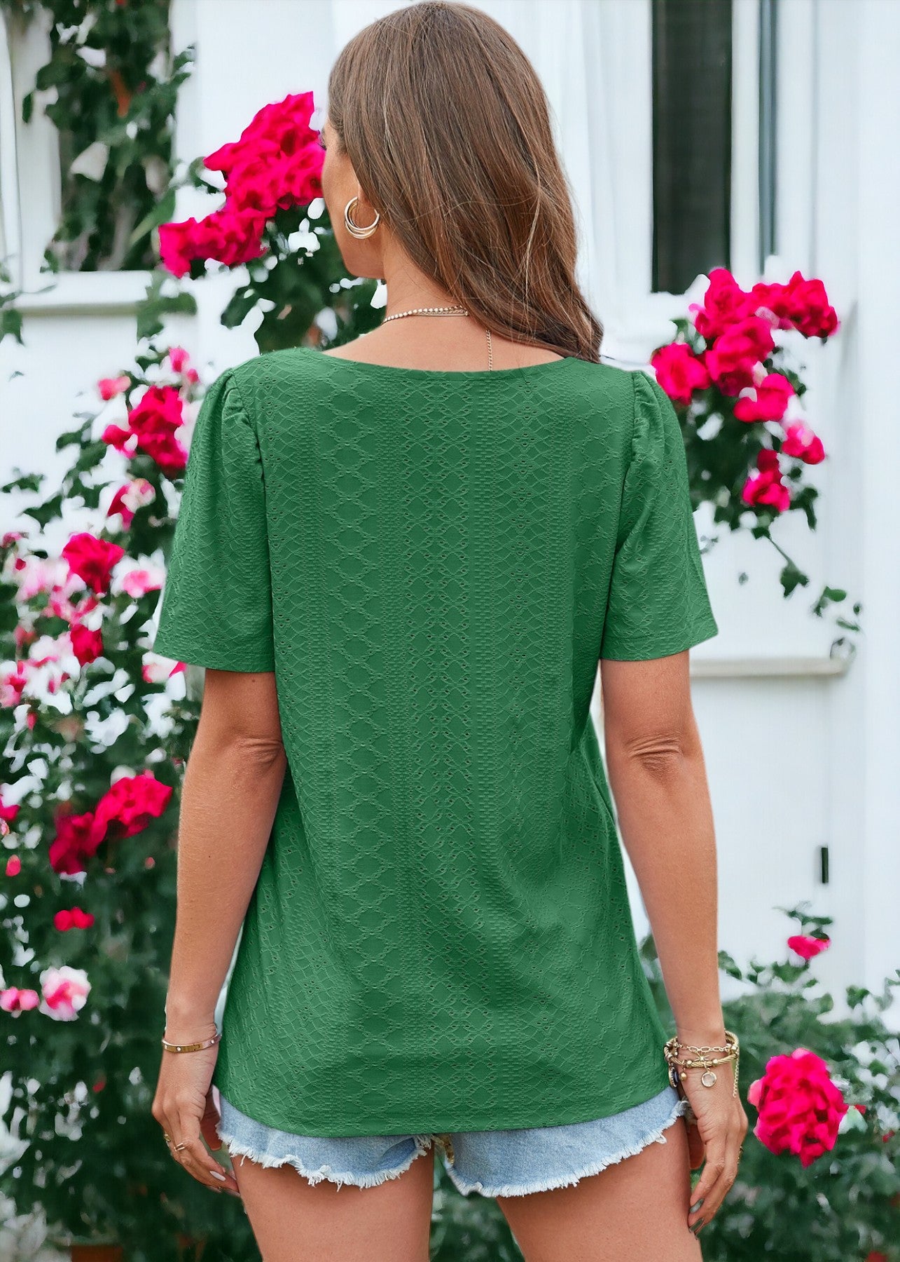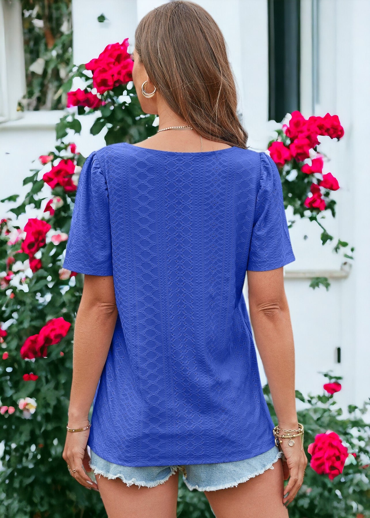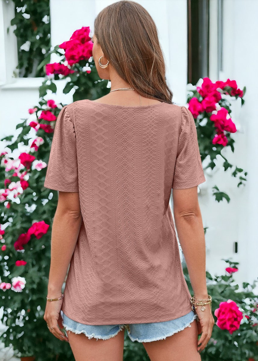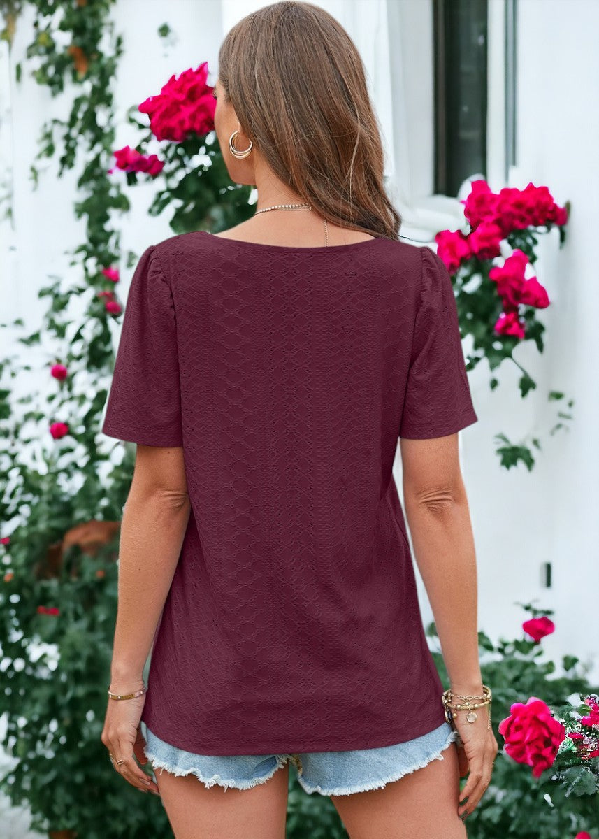 La blusa Anna-Kaci está decorada con un hermoso tejido con ojales. Tiene un color liso, escote cuadrado, mangas cortas y corte regular. Combínala con pantalones blancos y sandalias para lograr un estilo clásico.