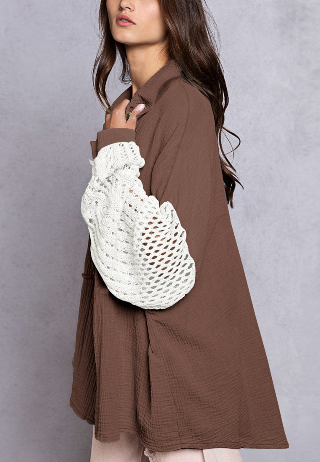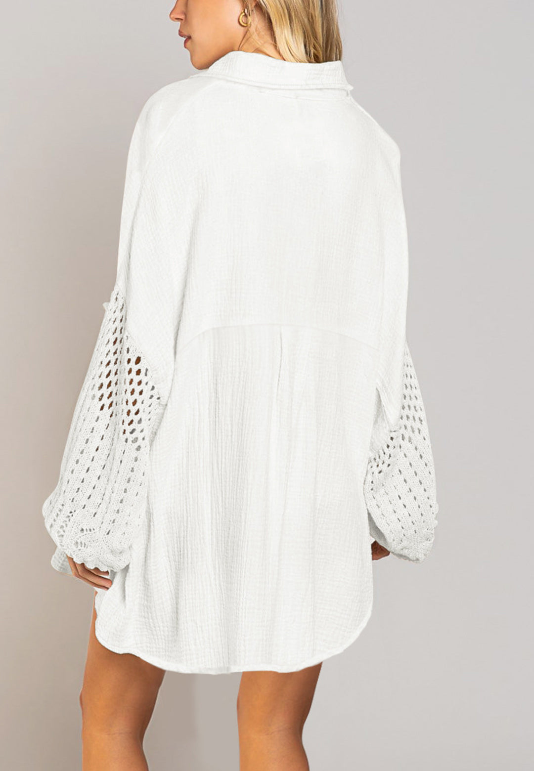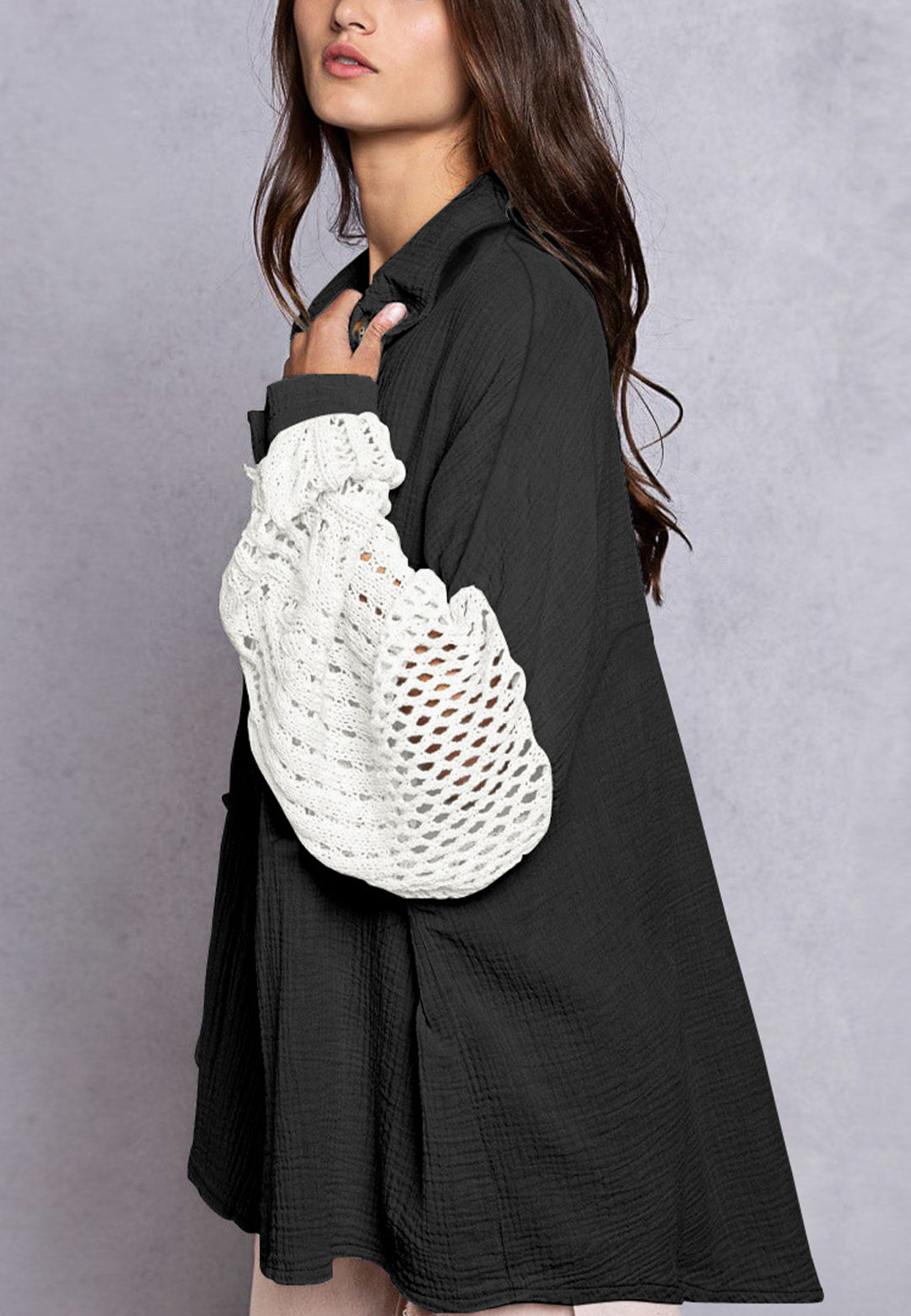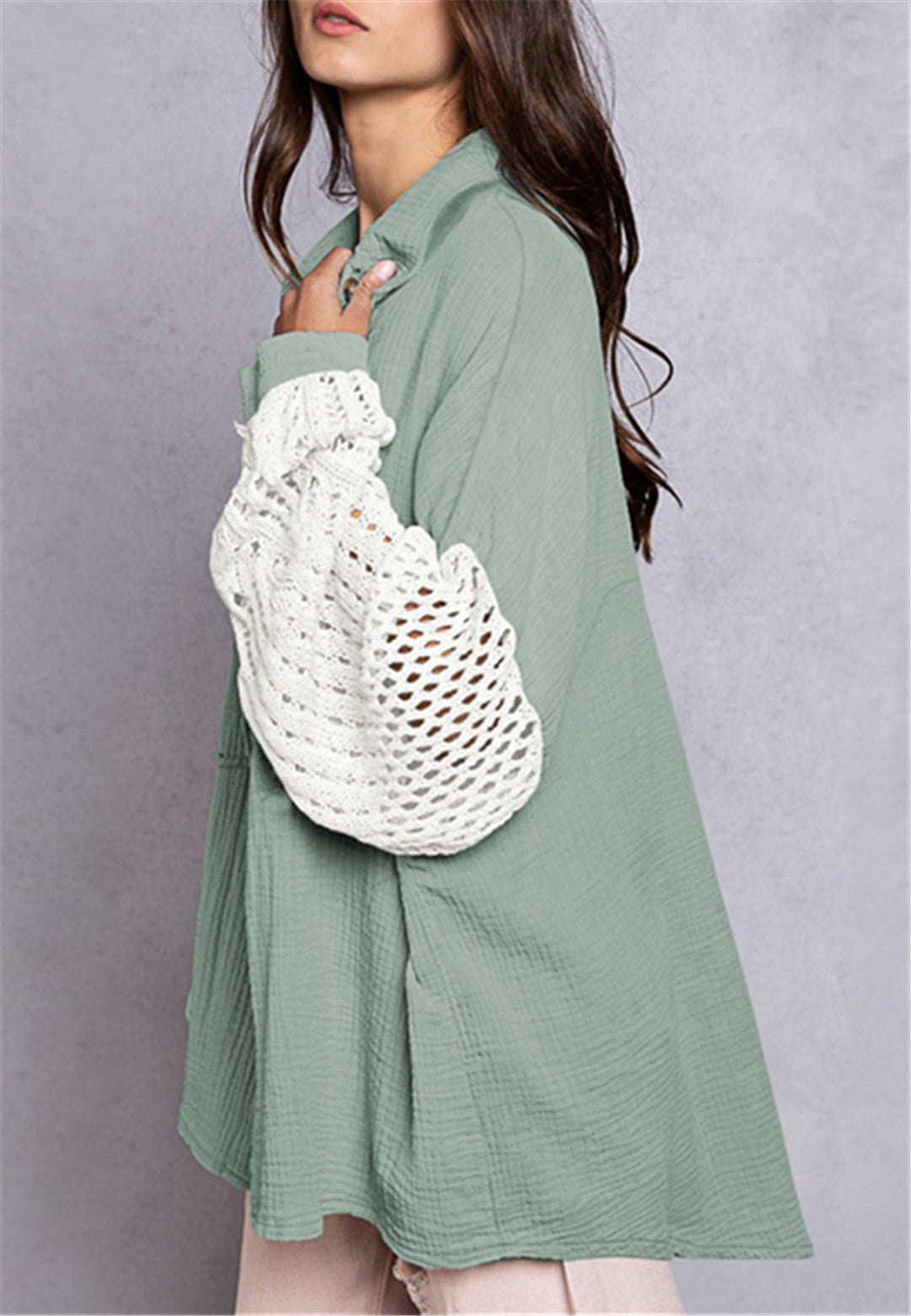 La camisa está decorada con un divertido material texturizado. Tiene cuello, color liso, cierre con botones, hombros caídos, mangas largas y corte holgado. Llévala con un top corto y pantalones para lograr un estilo relajado.