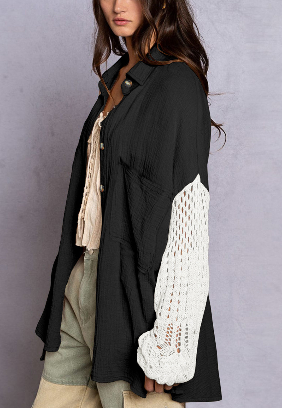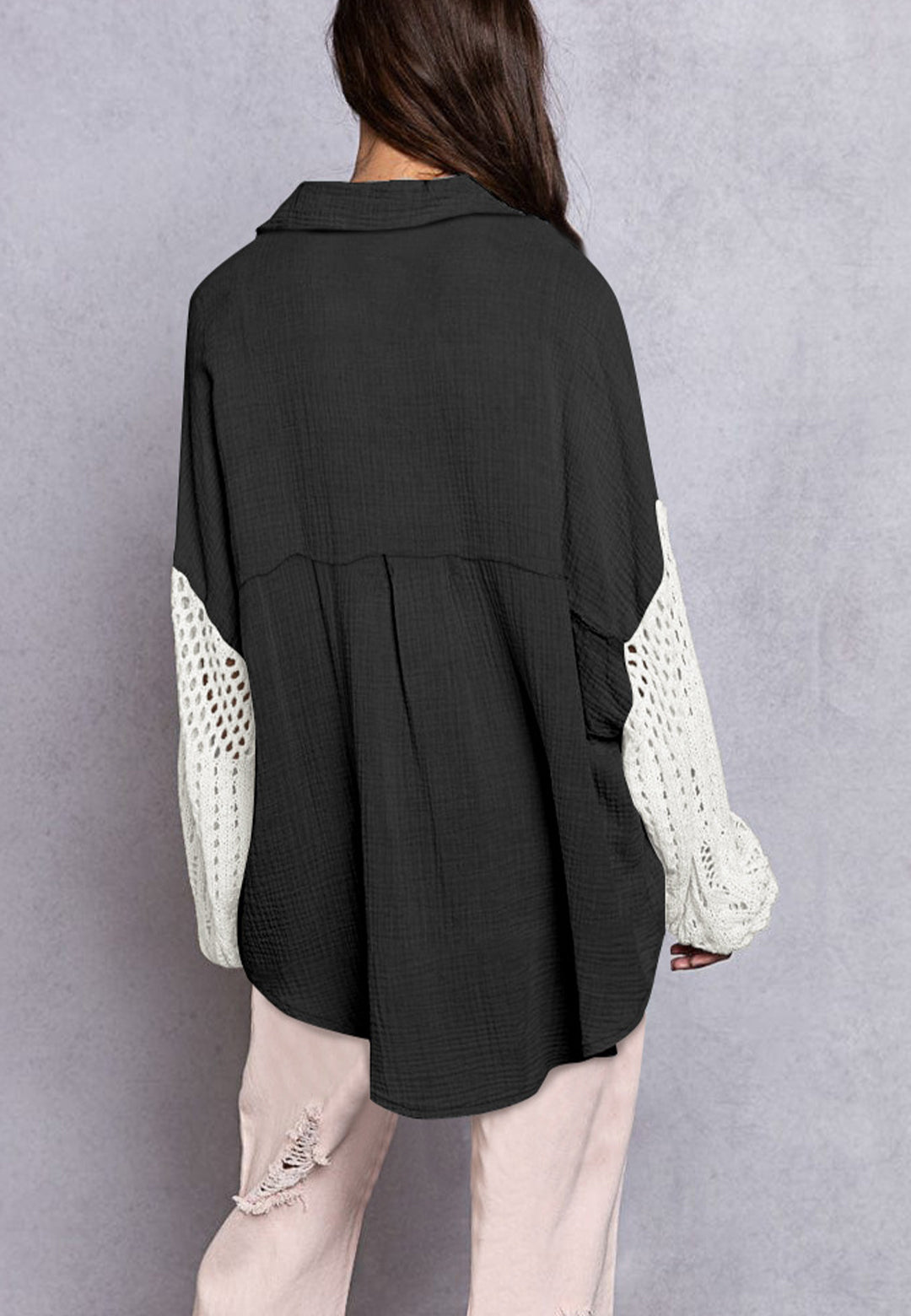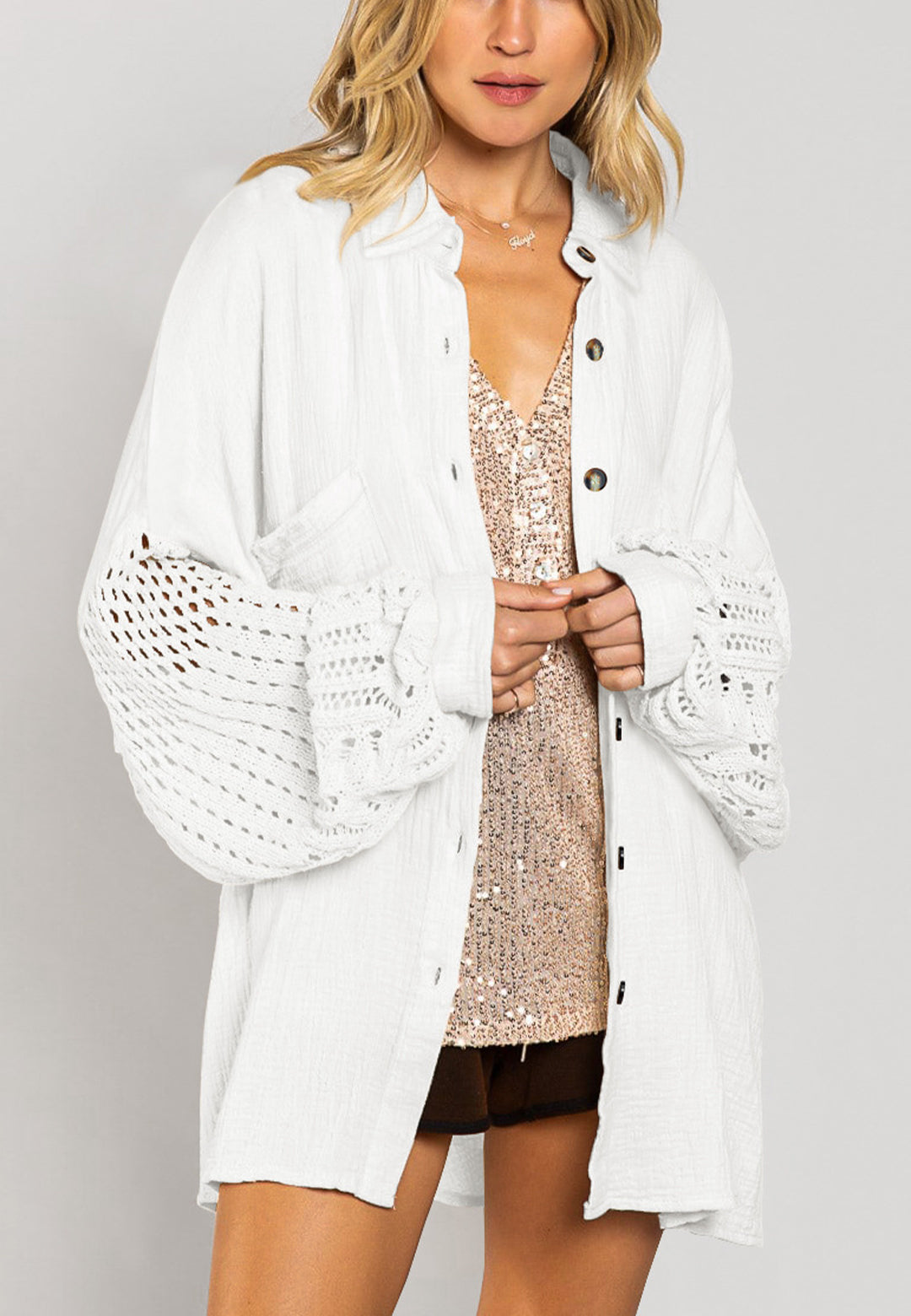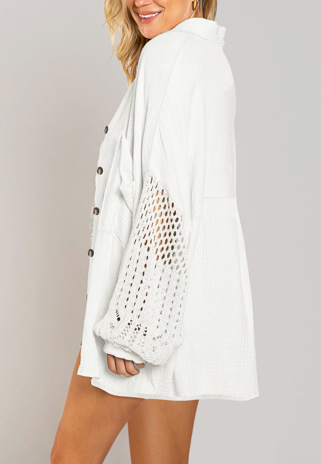 La camisa está decorada con un divertido material texturizado. Tiene cuello, color liso, cierre con botones, hombros caídos, mangas largas y corte holgado. Llévala con un top corto y pantalones para lograr un estilo relajado.