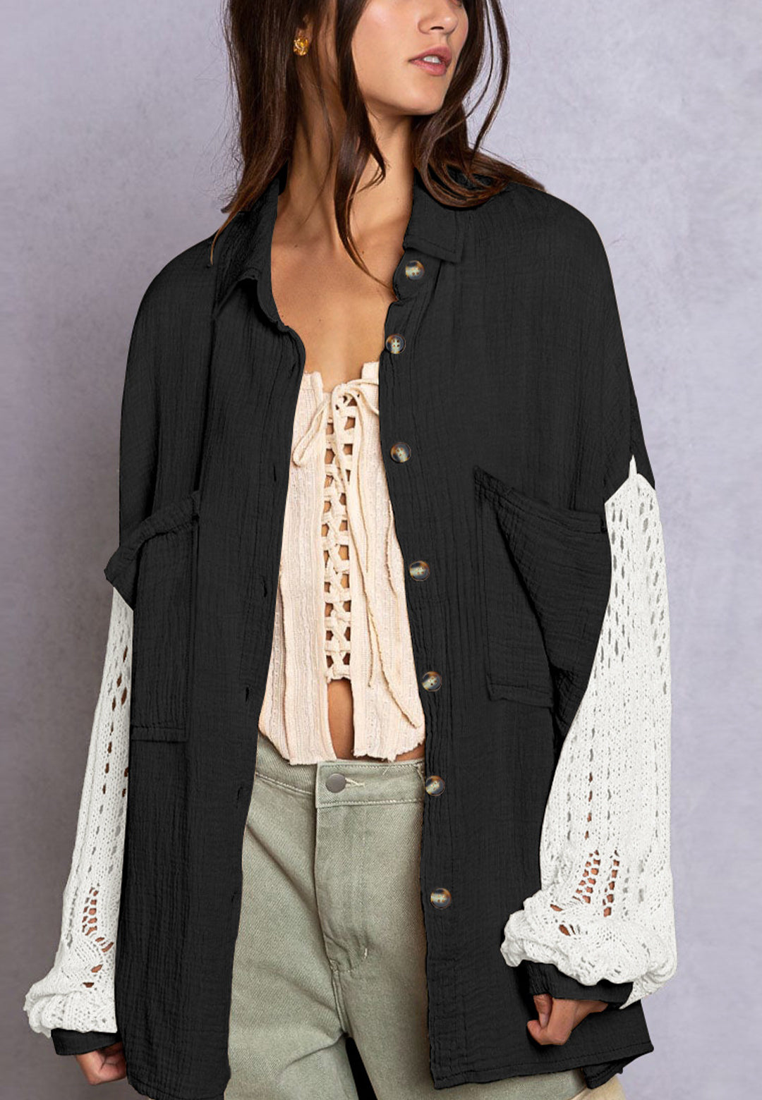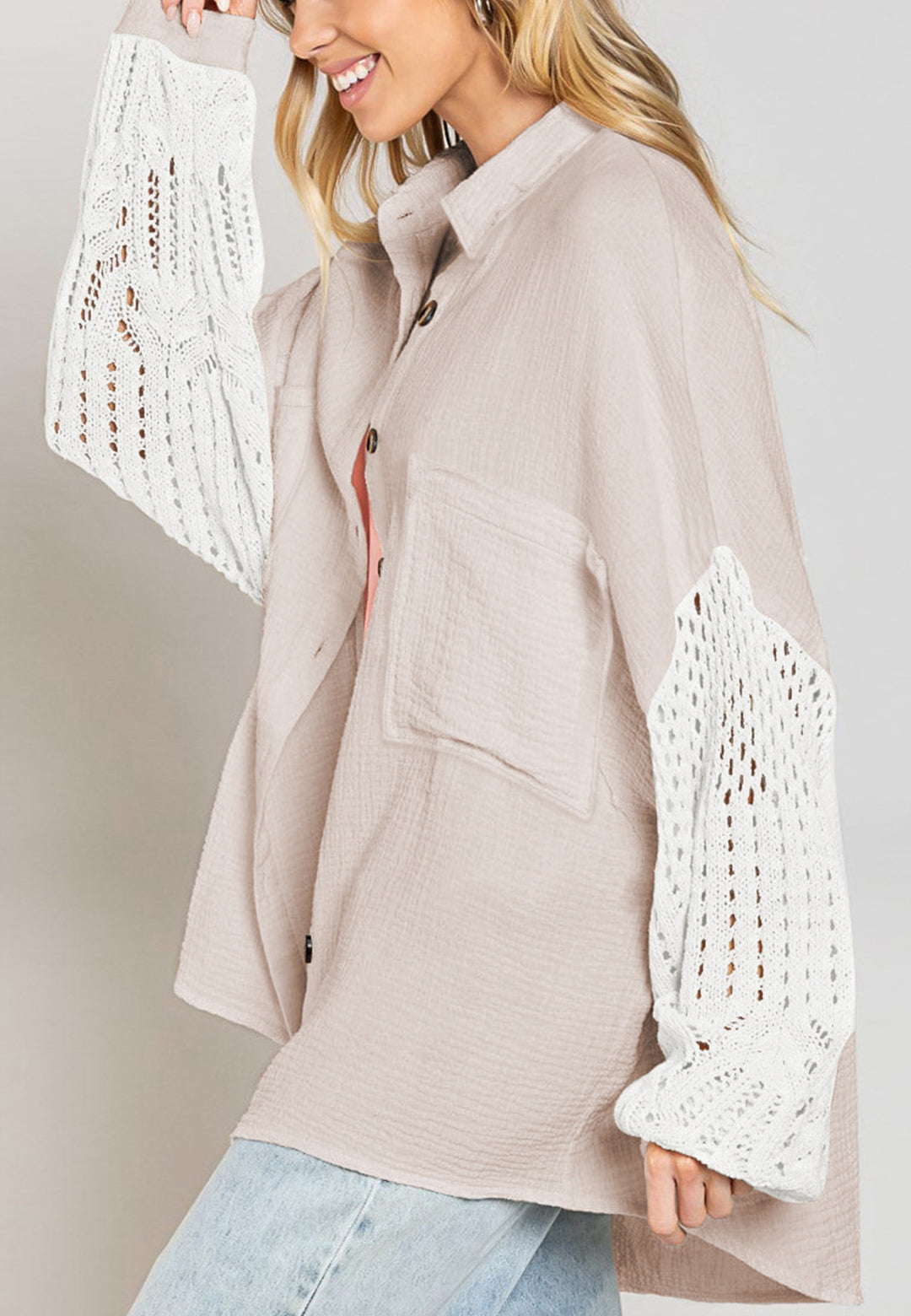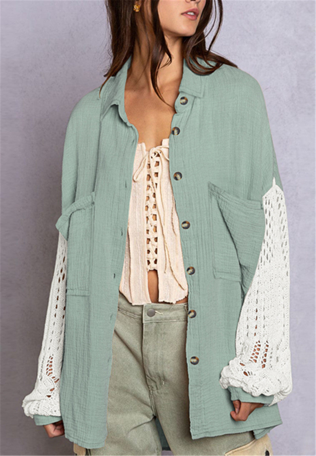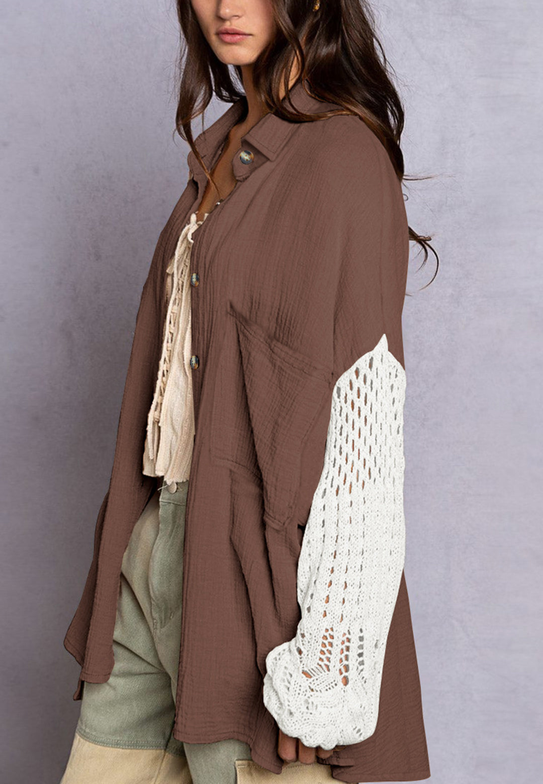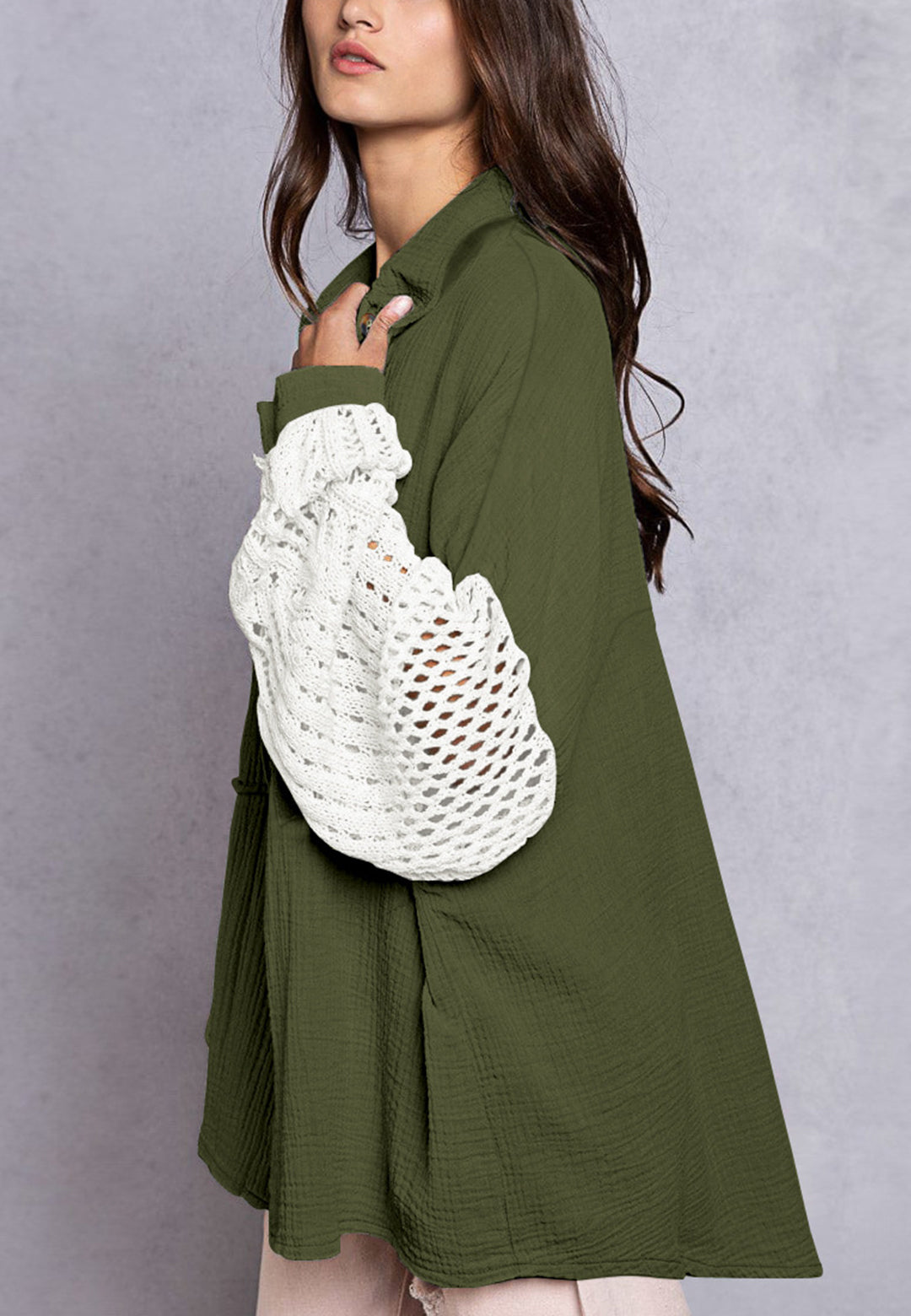 La camisa está decorada con un divertido material texturizado. Tiene cuello, color liso, cierre con botones, hombros caídos, mangas largas y corte holgado. Llévala con un top corto y pantalones para lograr un estilo relajado.