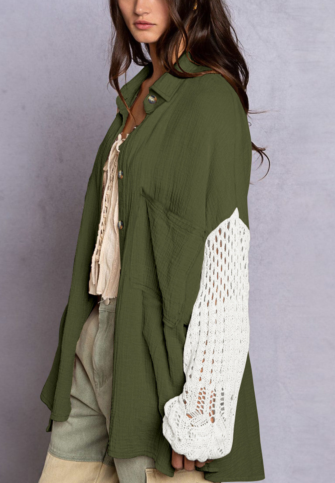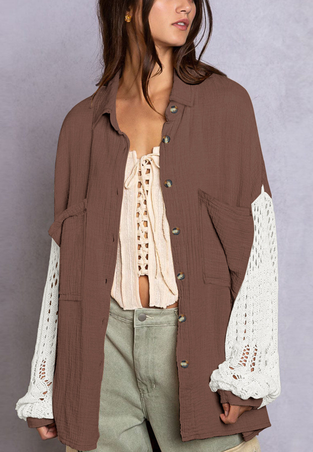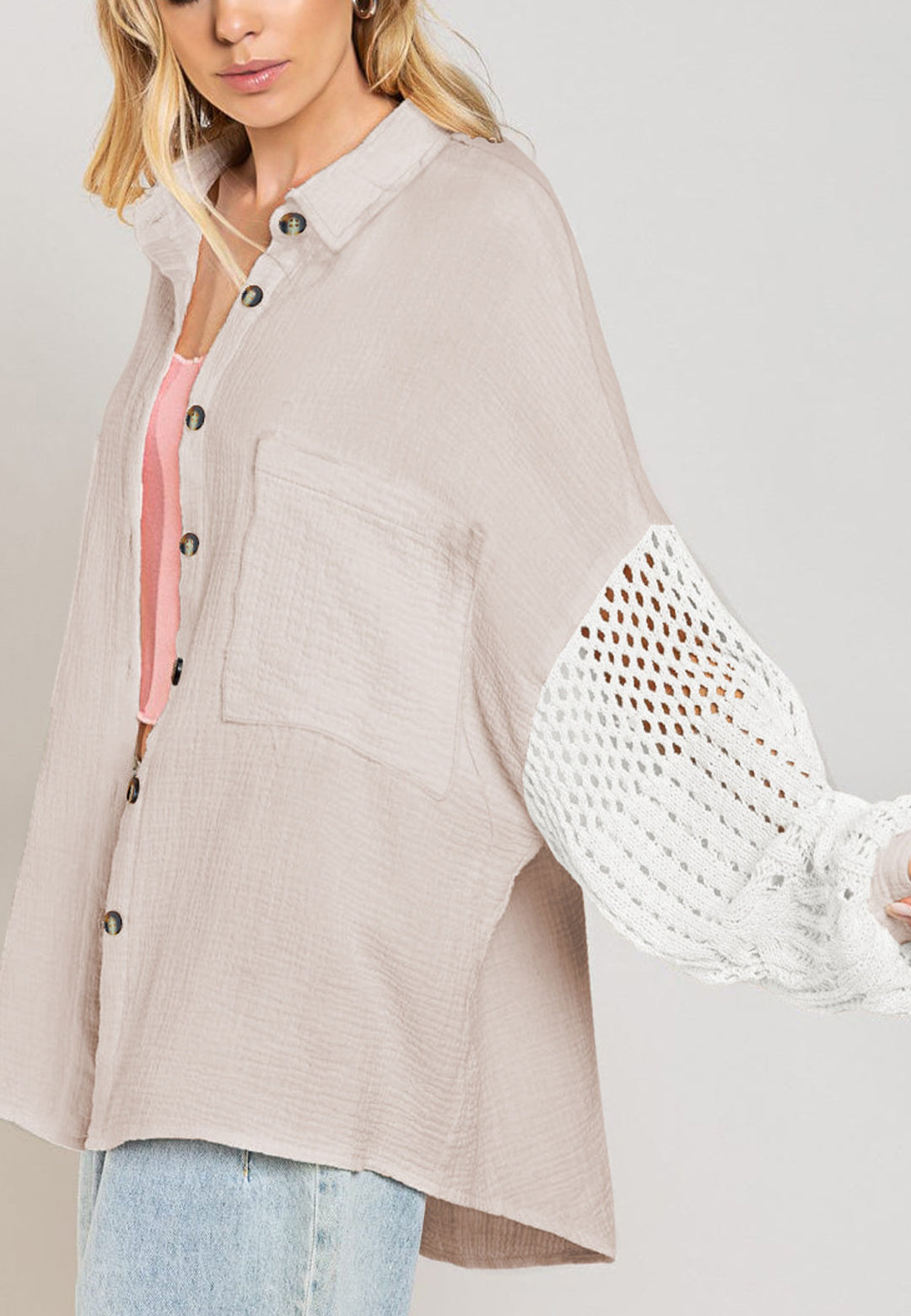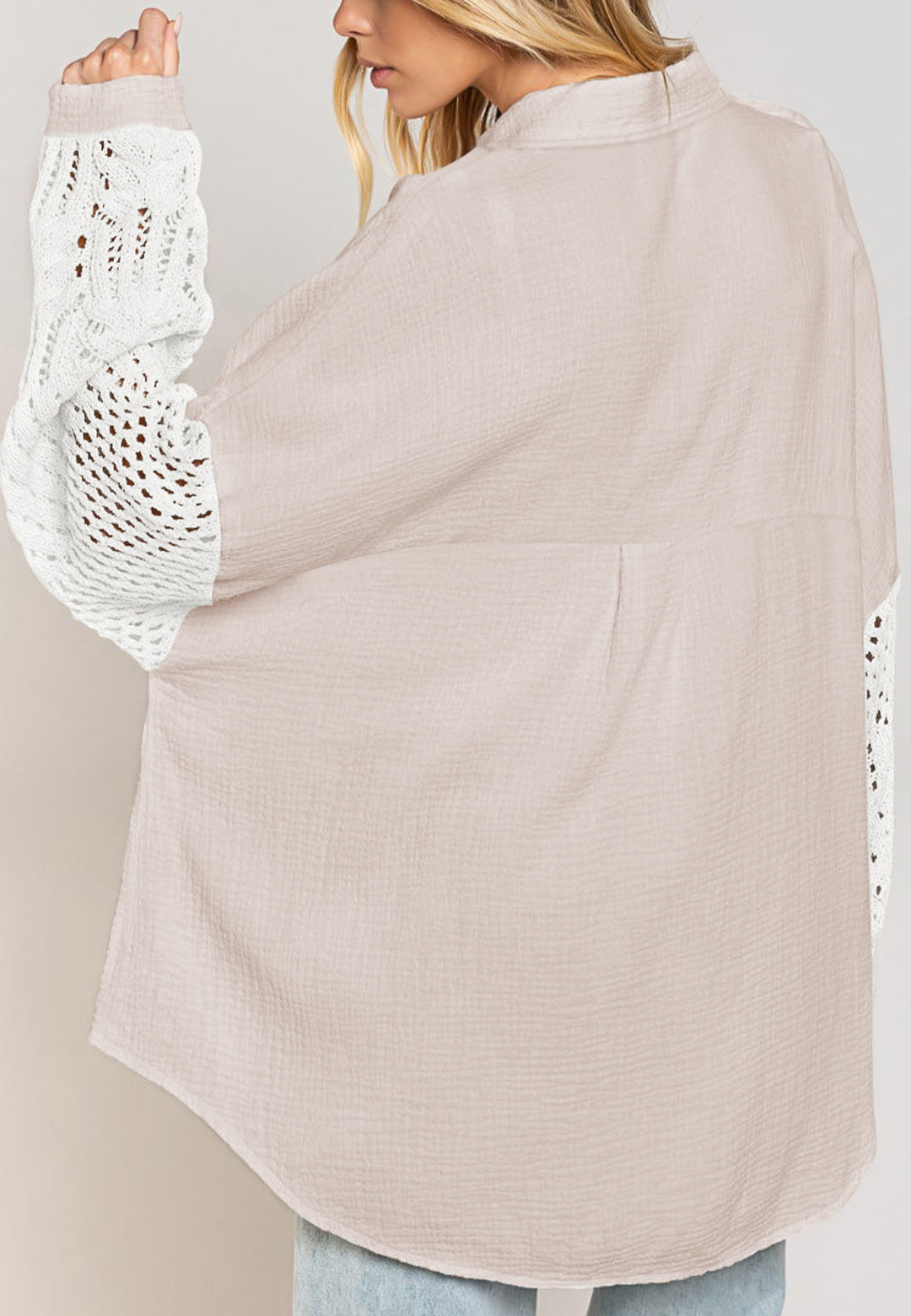 La camisa está decorada con un divertido material texturizado. Tiene cuello, color liso, cierre con botones, hombros caídos, mangas largas y corte holgado. Llévala con un top corto y pantalones para lograr un estilo relajado.