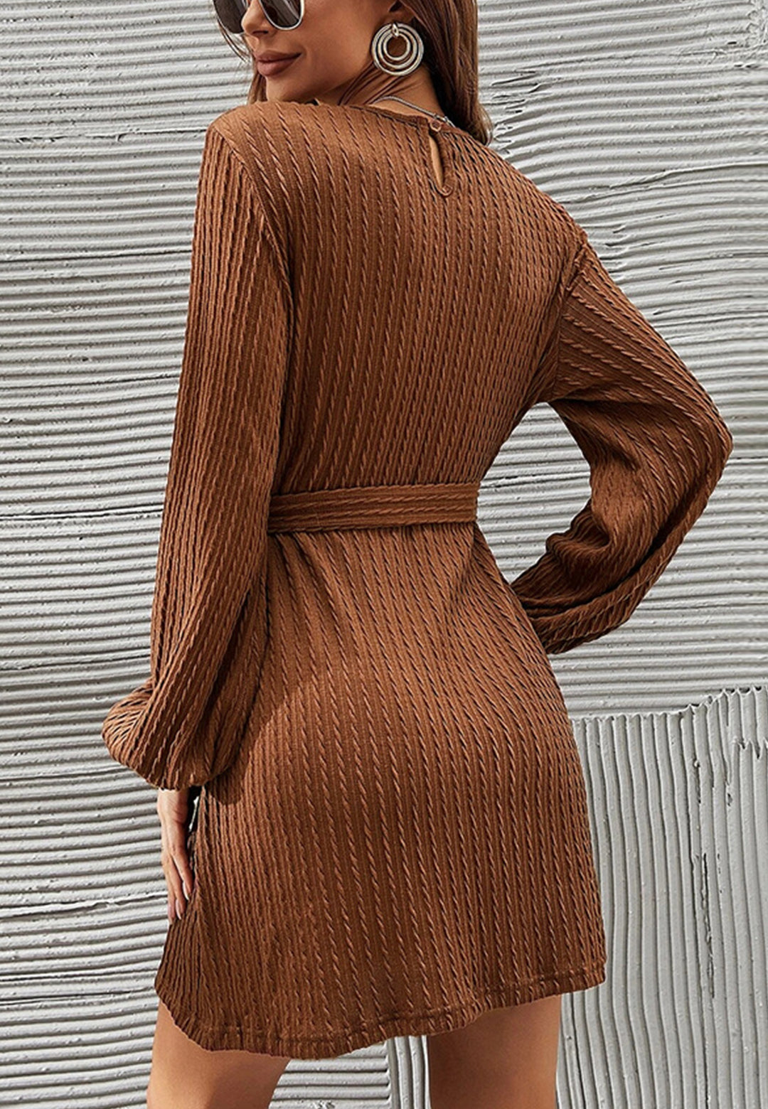 El vestido está elaborado con un hermoso tejido texturizado. Tiene escote redondo, mangas abullonadas, detalle de lazo en la cintura y largo por encima de la rodilla. Combínalo con gafas de sol y botas para lograr un look fantástico.
