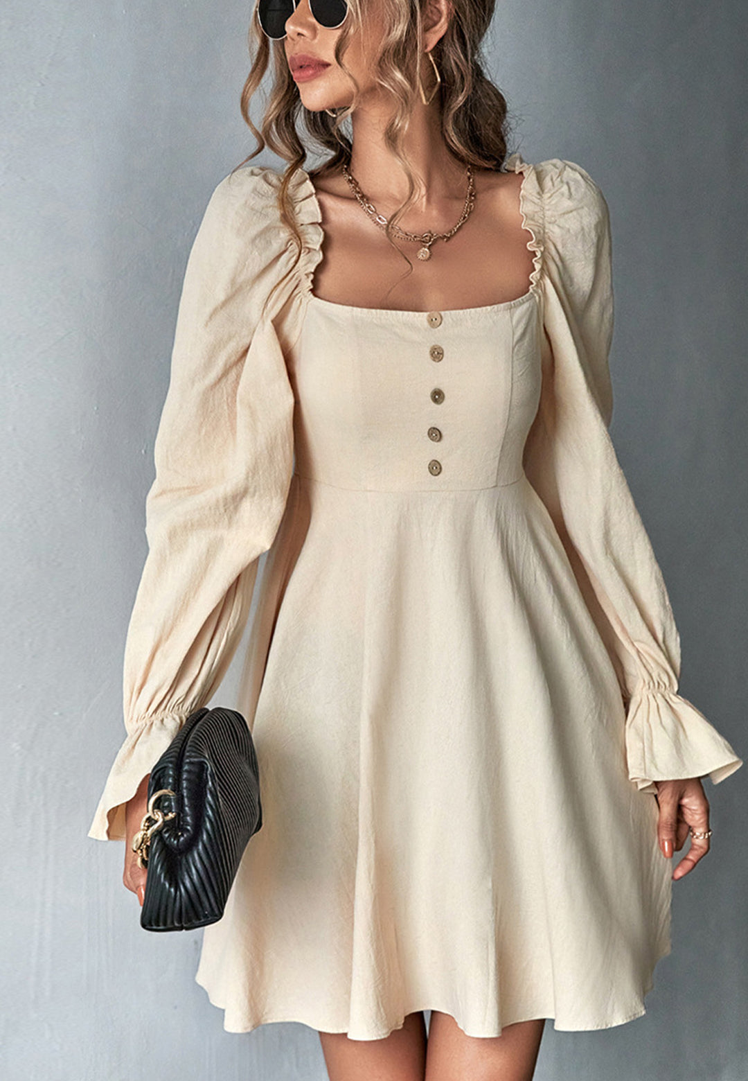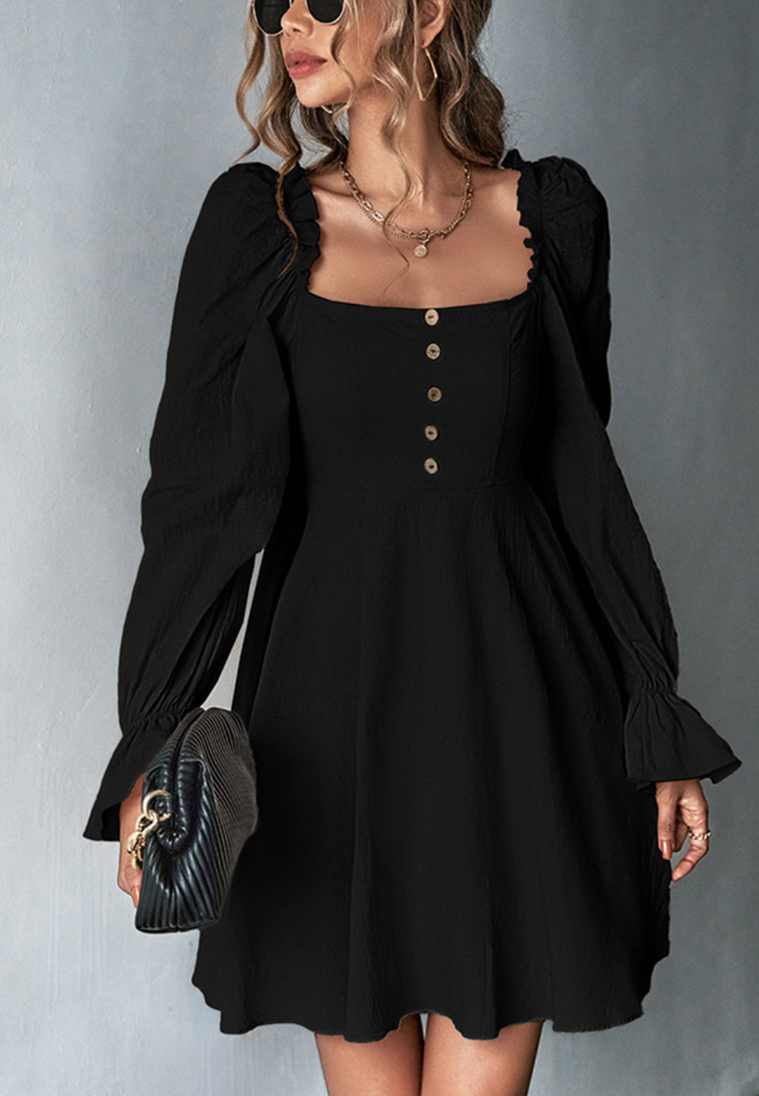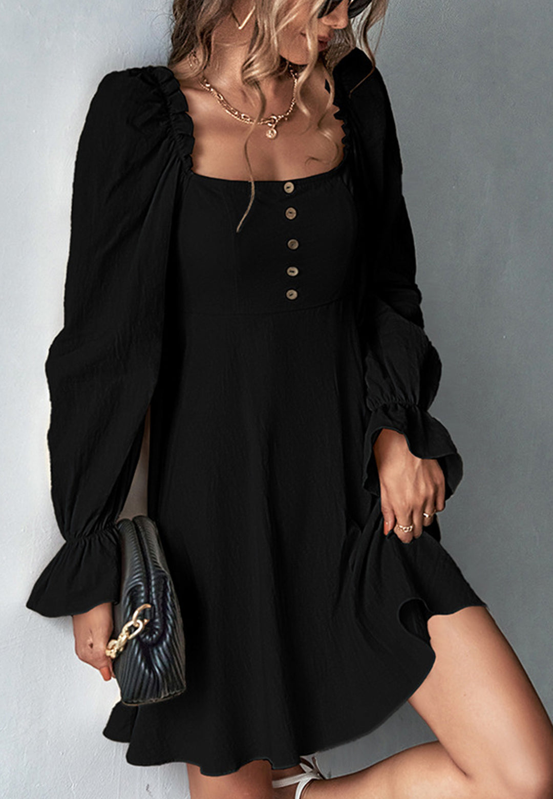 El vestido tiene un escote cuadrado clásico. Tiene mangas largas, botones en la parte delantera, puños con volados, falda vaporosa y largo por encima de la rodilla. Combínalo con un moño y tacones para lograr un look lindo.