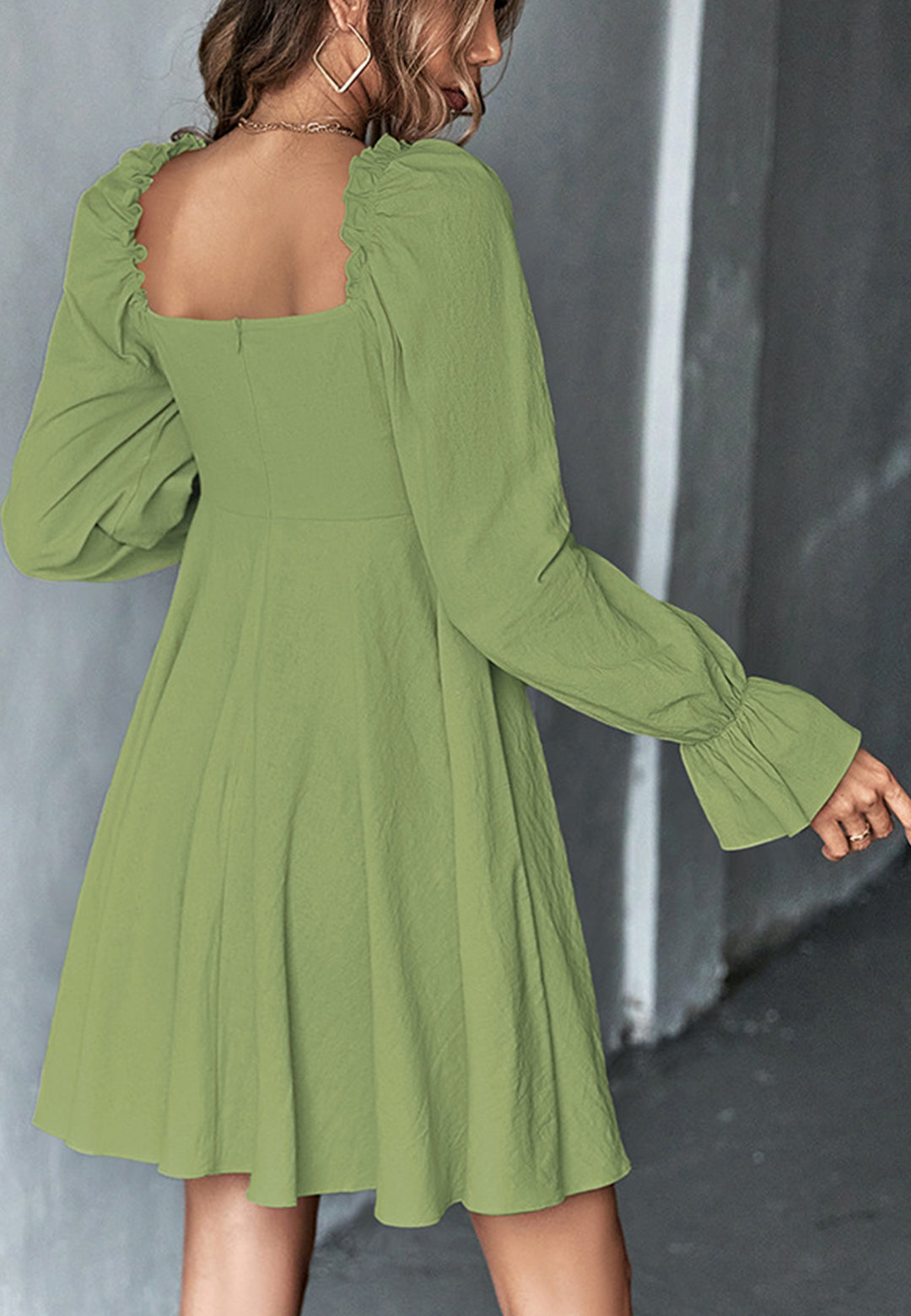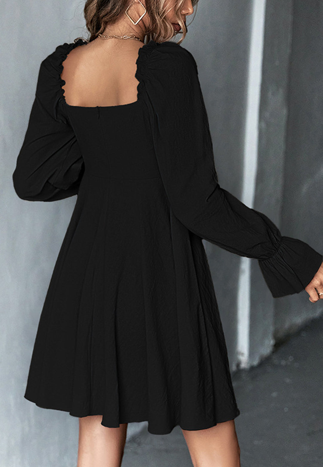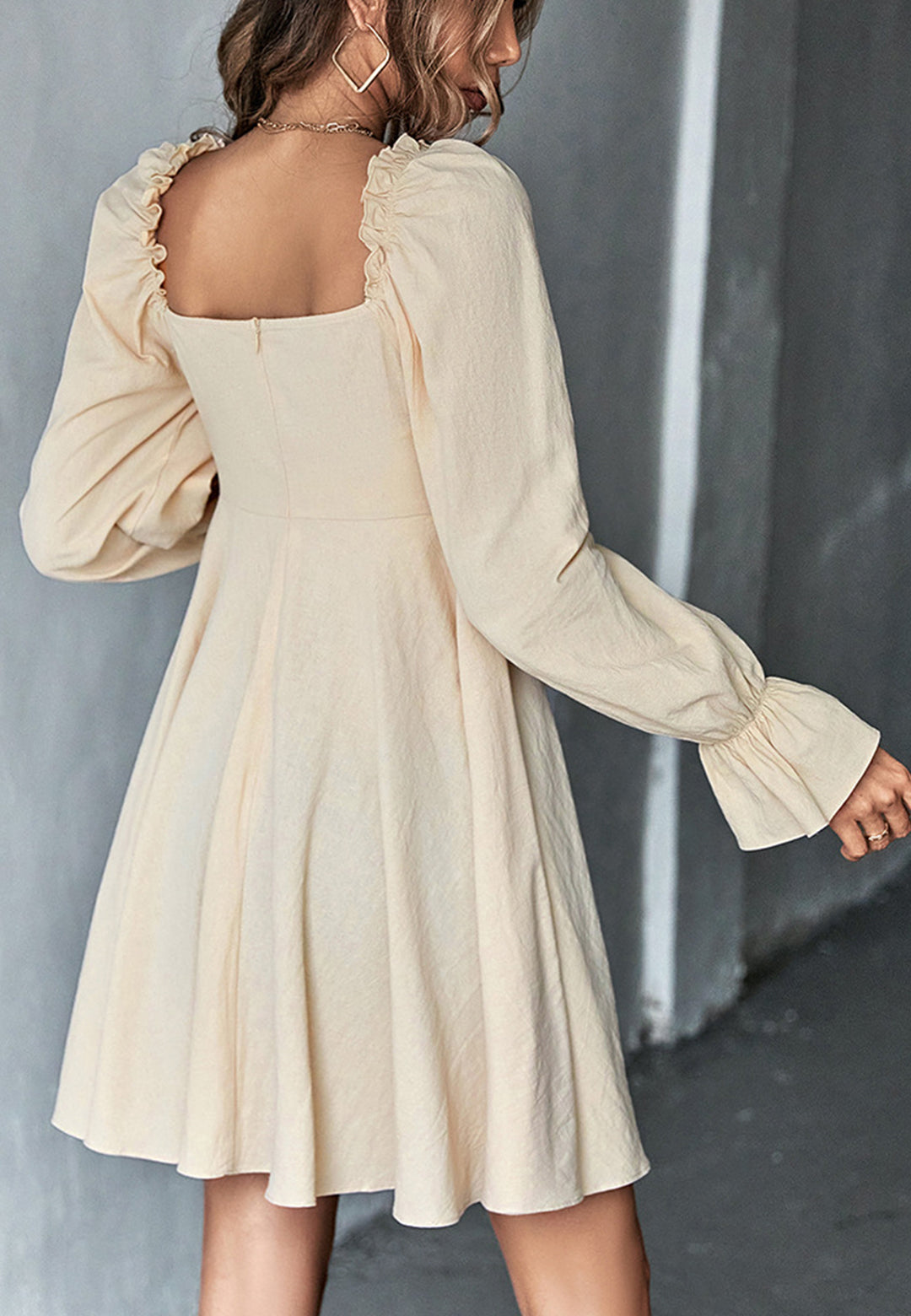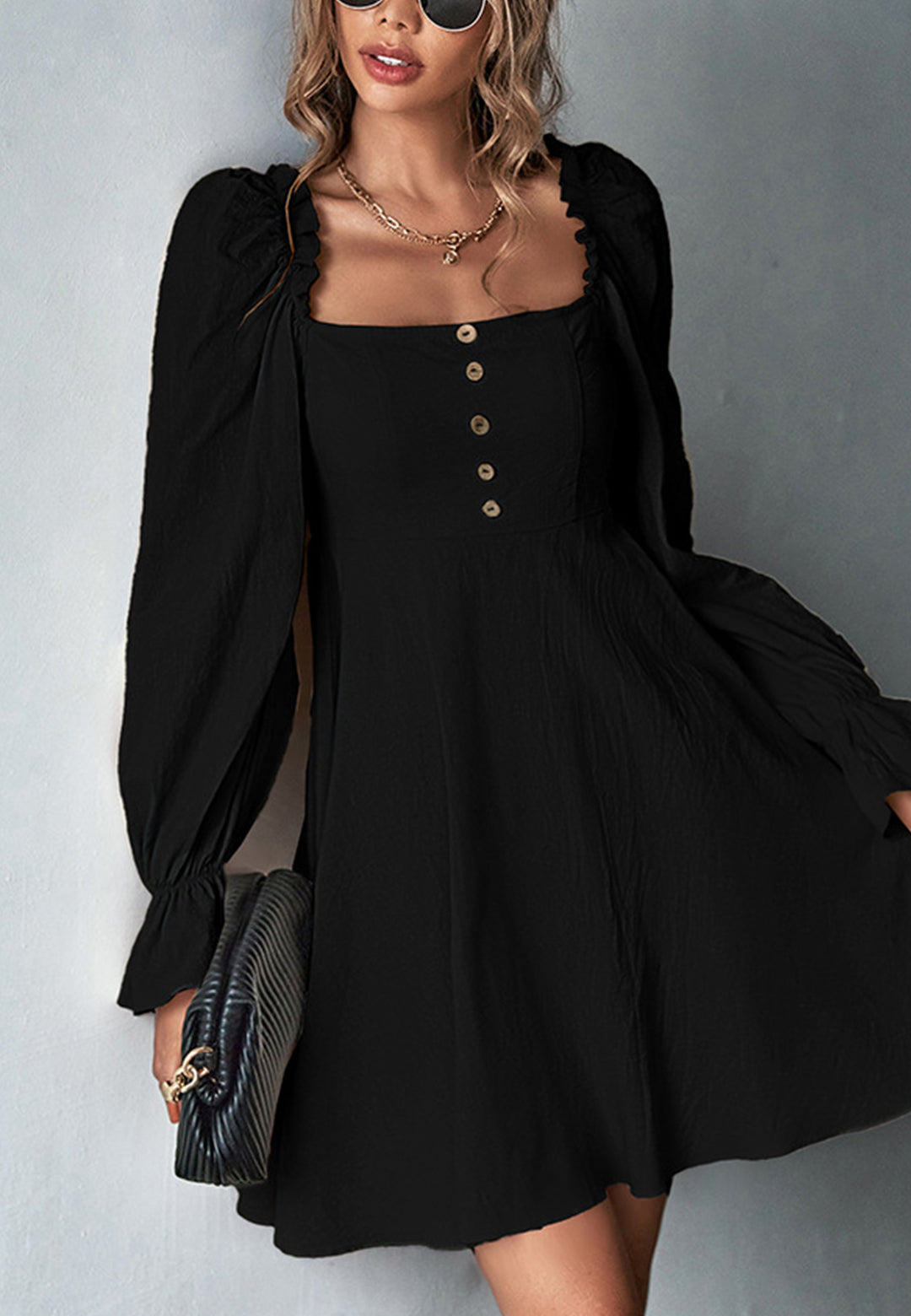 El vestido tiene un escote cuadrado clásico. Tiene mangas largas, botones en la parte delantera, puños con volados, falda vaporosa y largo por encima de la rodilla. Combínalo con un moño y tacones para lograr un look lindo.