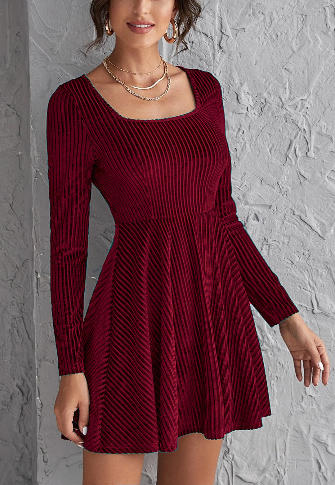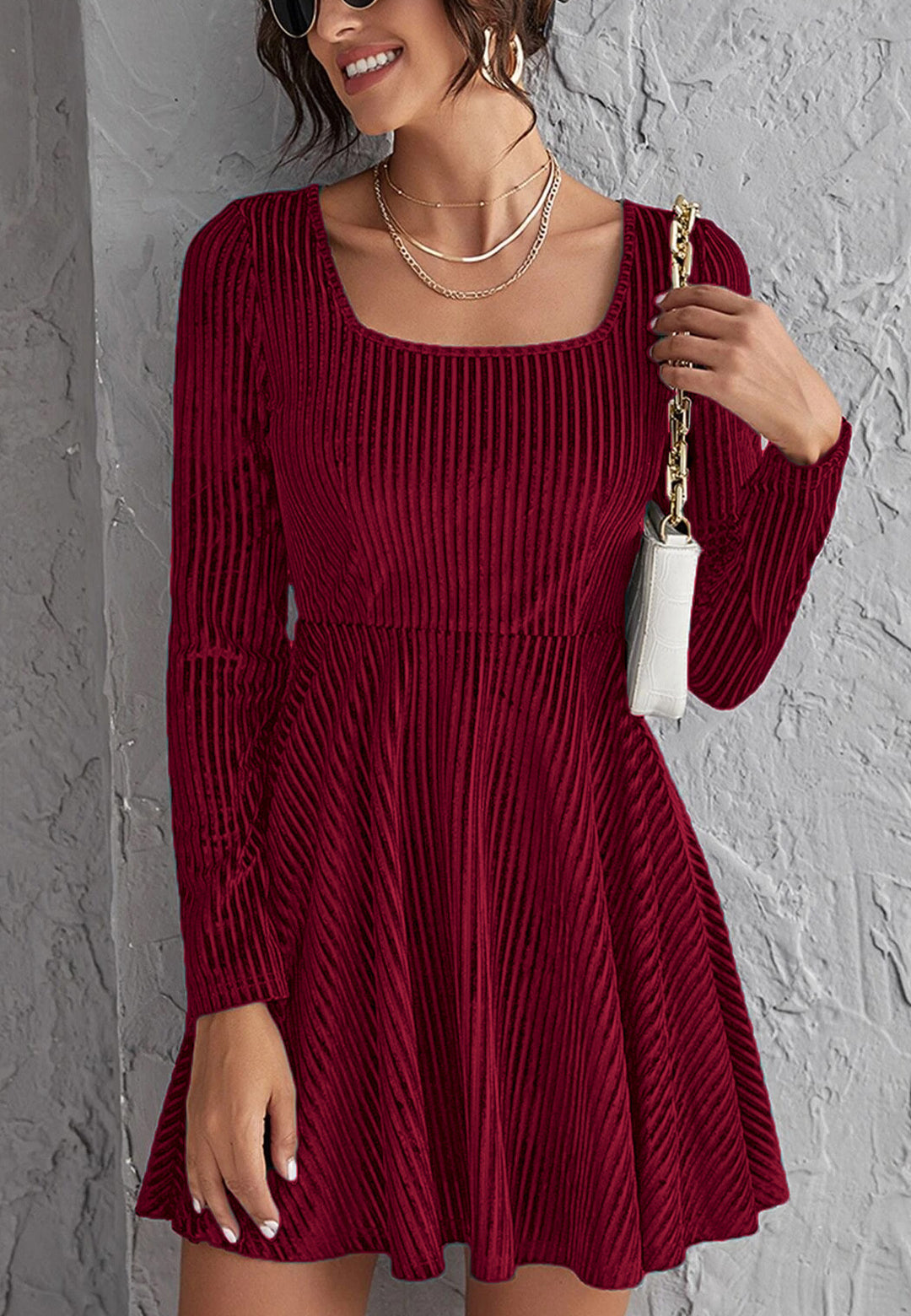 El vestido está elaborado con un material texturizado divertido. Tiene escote cuadrado, mangas largas, falda skater y largo por encima de la rodilla. Combínalo con un bolso y botas para lograr un look elegante.