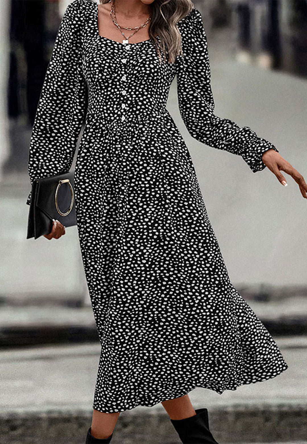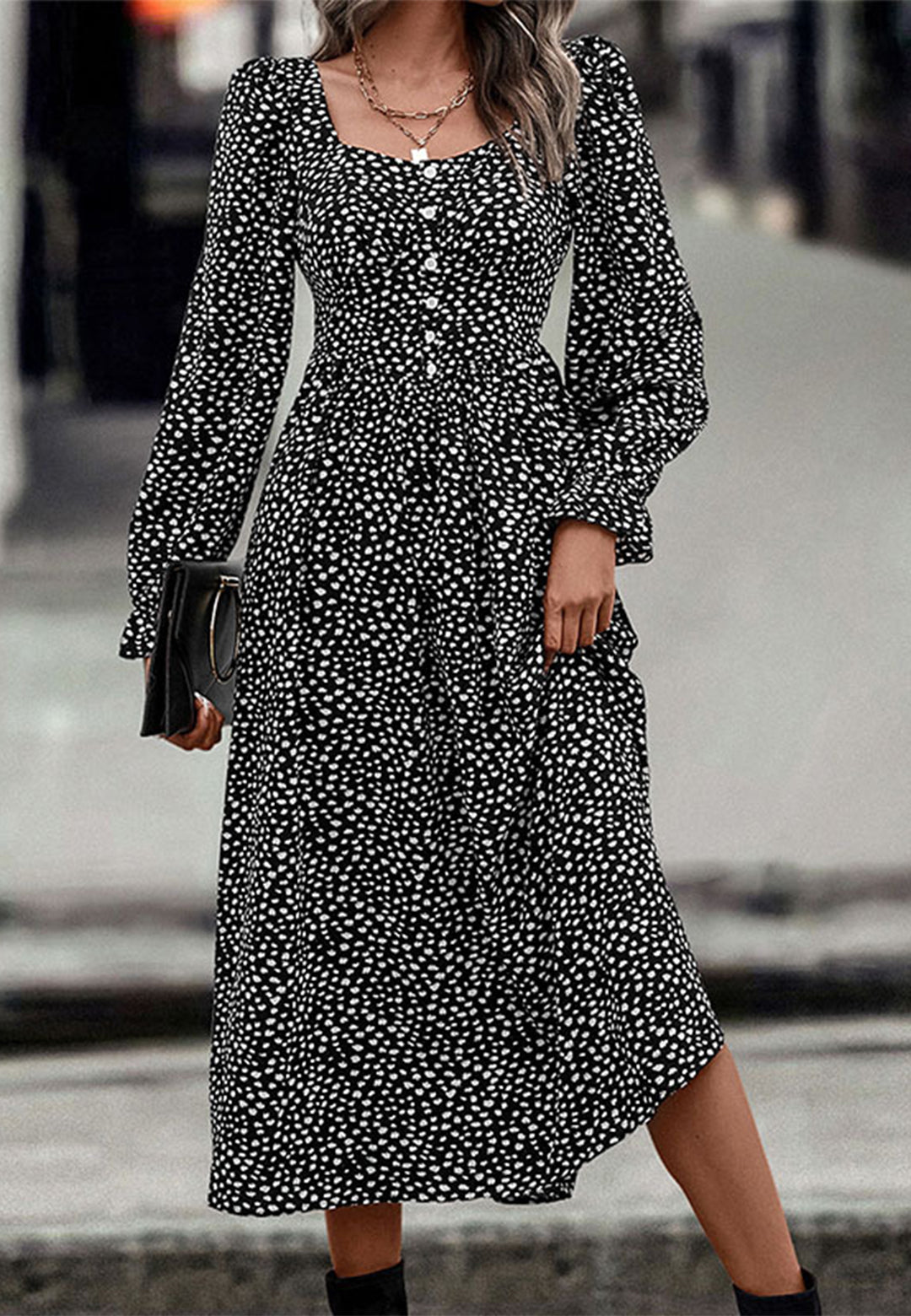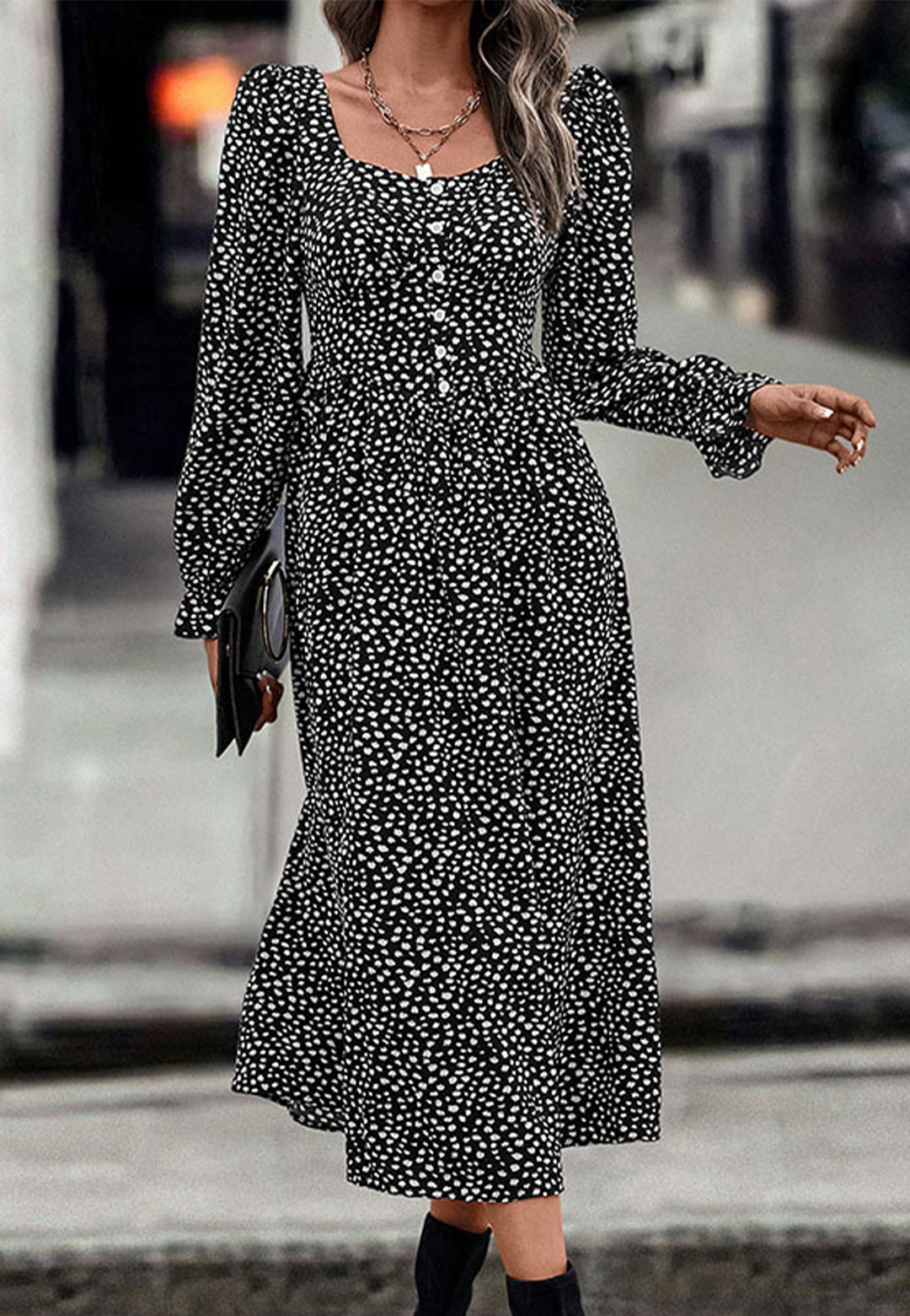 El vestido tiene un estampado de lunares muy divertido. Tiene escote cuadrado, botones en la parte delantera, mangas largas, falda vaporosa y largo hasta la mitad de la pantorrilla. Combínalo con un bolso de mano y botines para lograr un look elegante.
