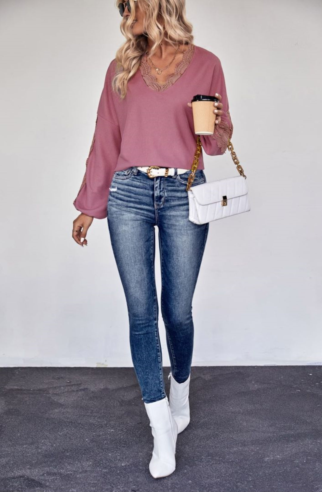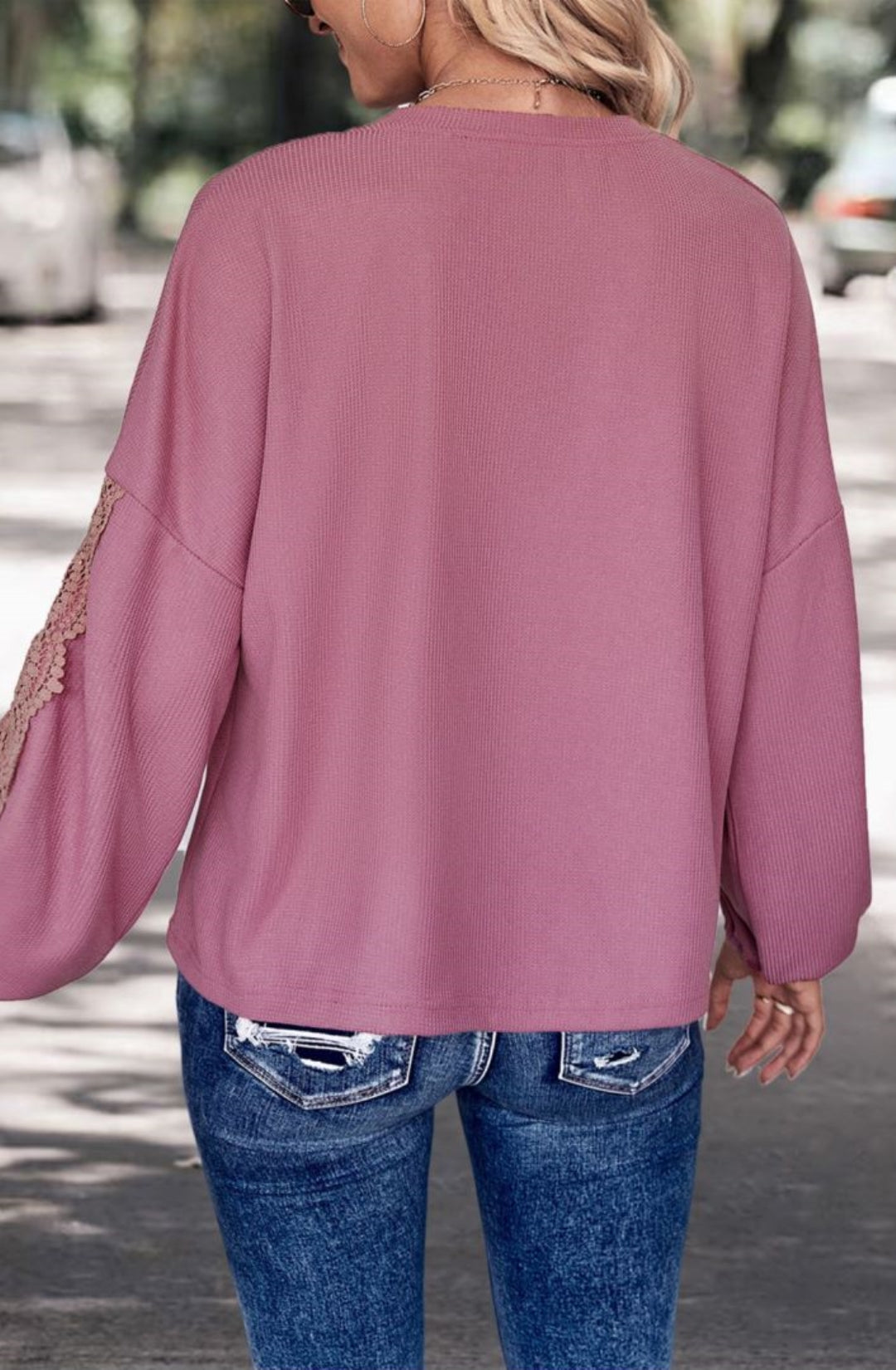 El suéter está adornado con un impresionante borde de encaje festoneado. Tiene escote en V, tejido de punto acanalado, hombros caídos, mangas largas y corte holgado. Combínalo con jeans y zapatillas para lograr un hermoso look.