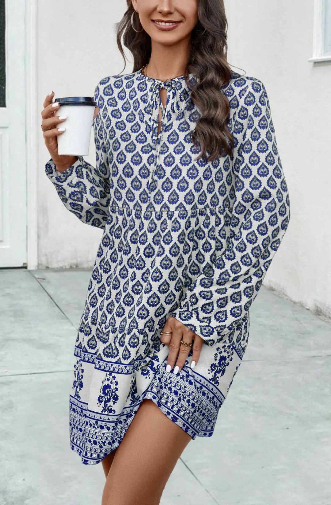 El vestido tiene un bonito diseño con lazo en el cuello. Tiene un estampado geométrico, mangas largas y largo por encima de la rodilla. Combínalo con un bolso y sandalias para lograr un look encantador.
