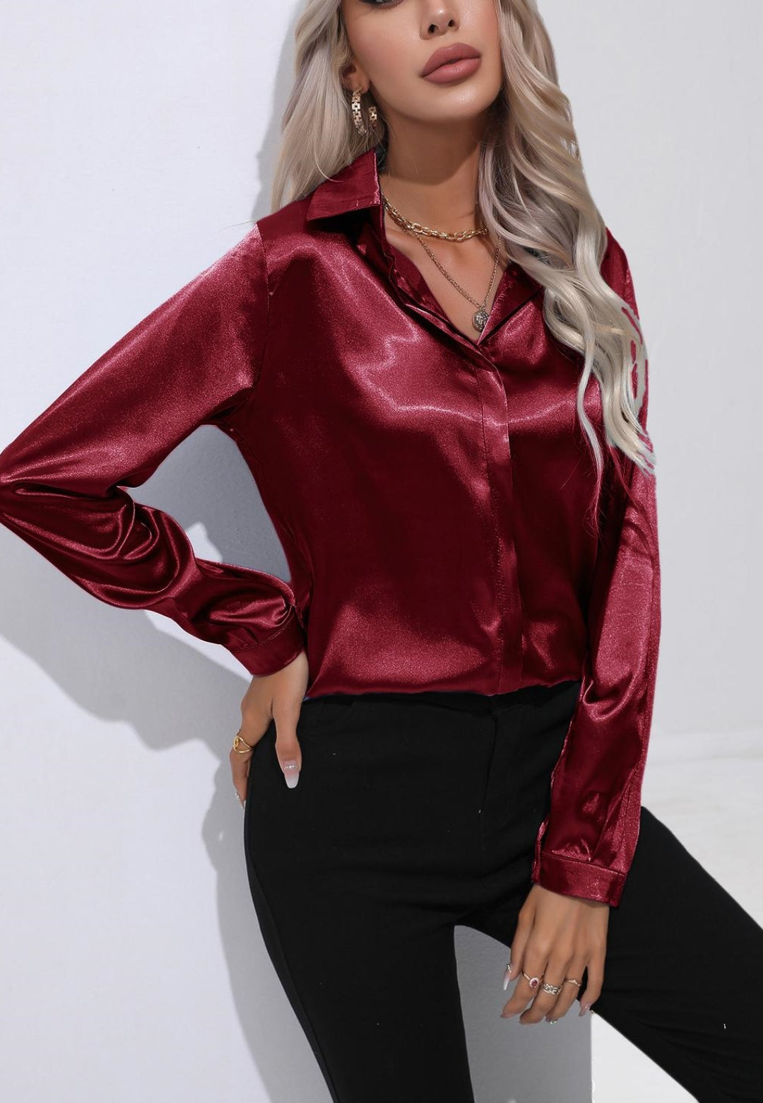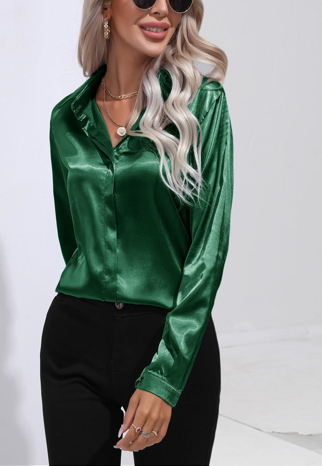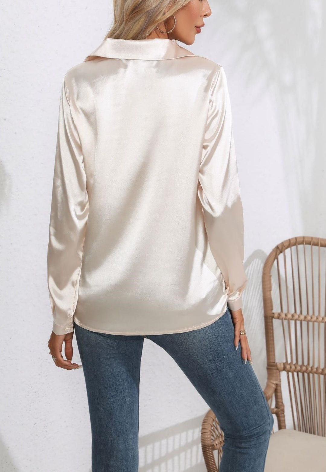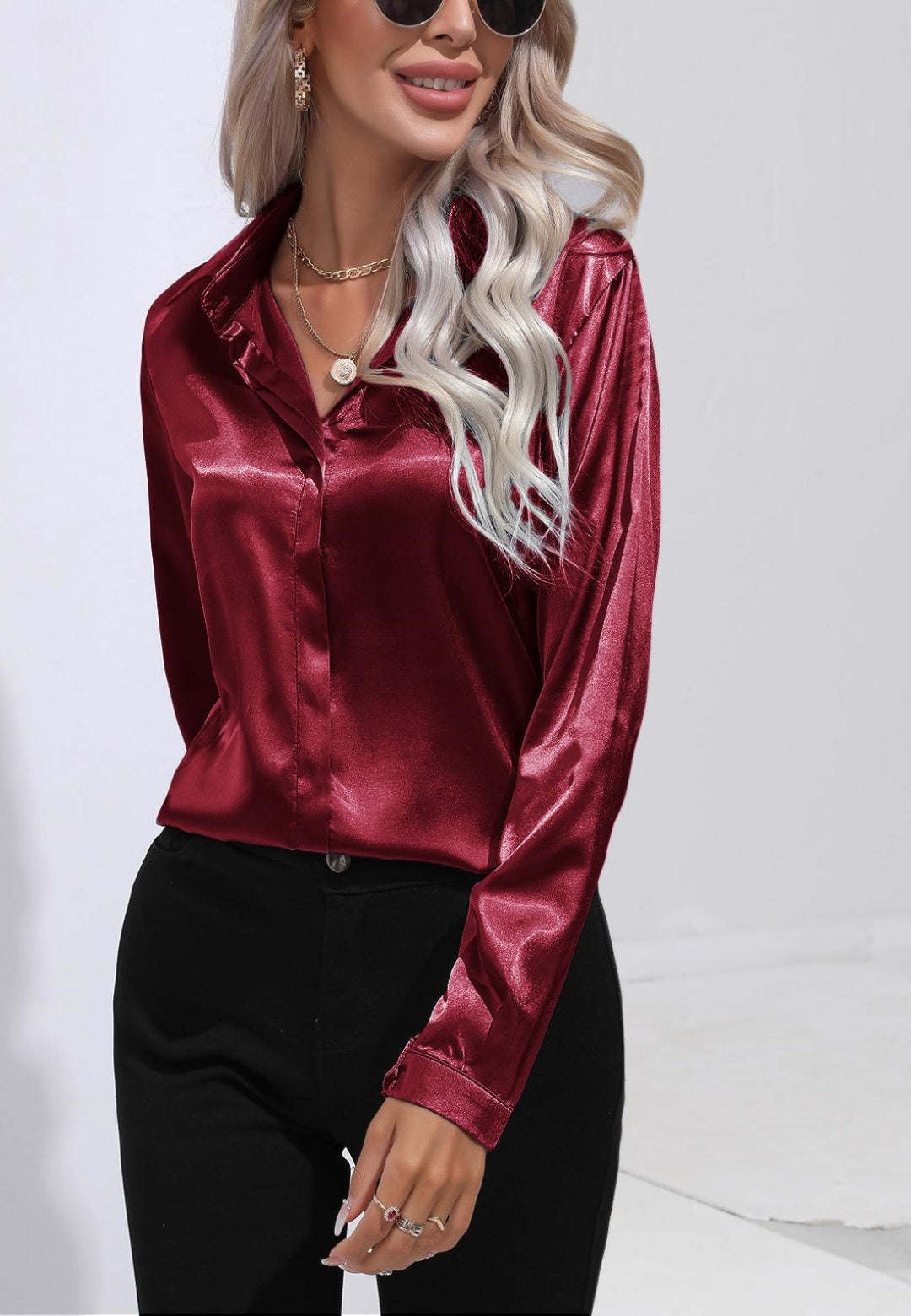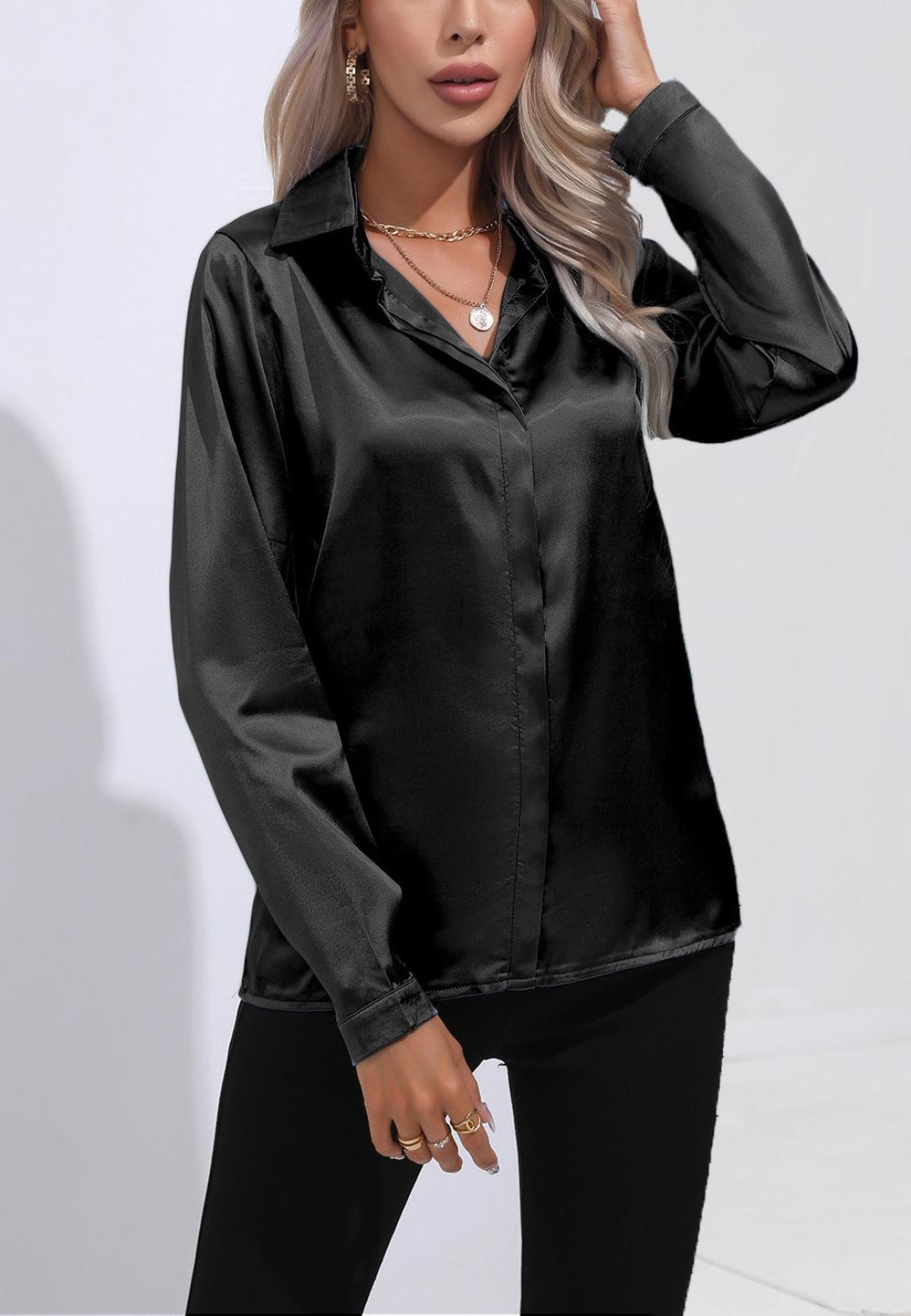 La camisa está decorada con un lujoso material satinado. Tiene cuello, mangas largas, botones en la parte delantera y corte regular. Combínala con una falda tubo y tacones para lograr un look sofisticado.