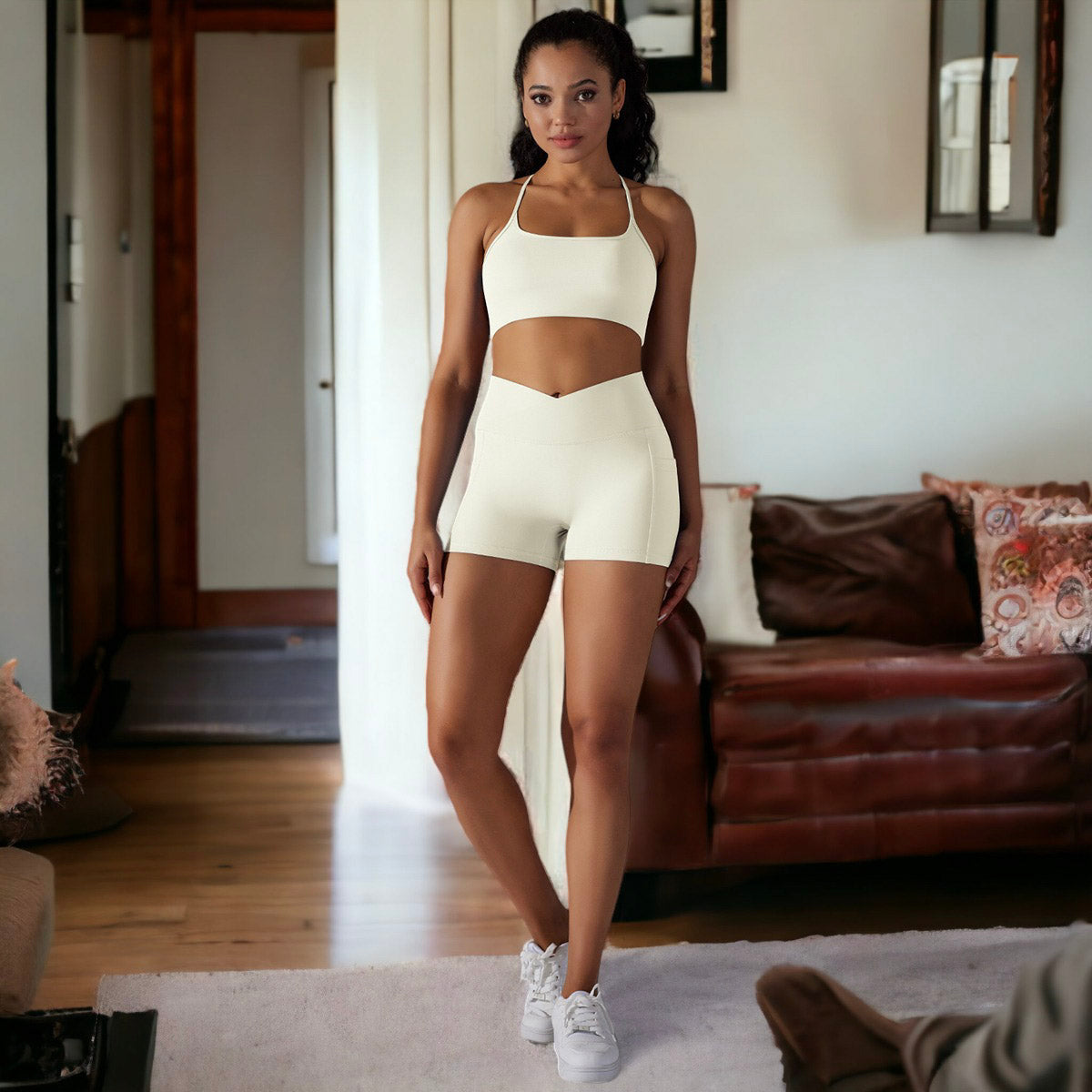 El conjunto presenta un diseño sexy sin espalda. Incluye un sujetador deportivo de color liso con escote cuadrado y pantalones cortos con cintura en V a juego. Combínalo con zapatillas para lograr un look fantástico.