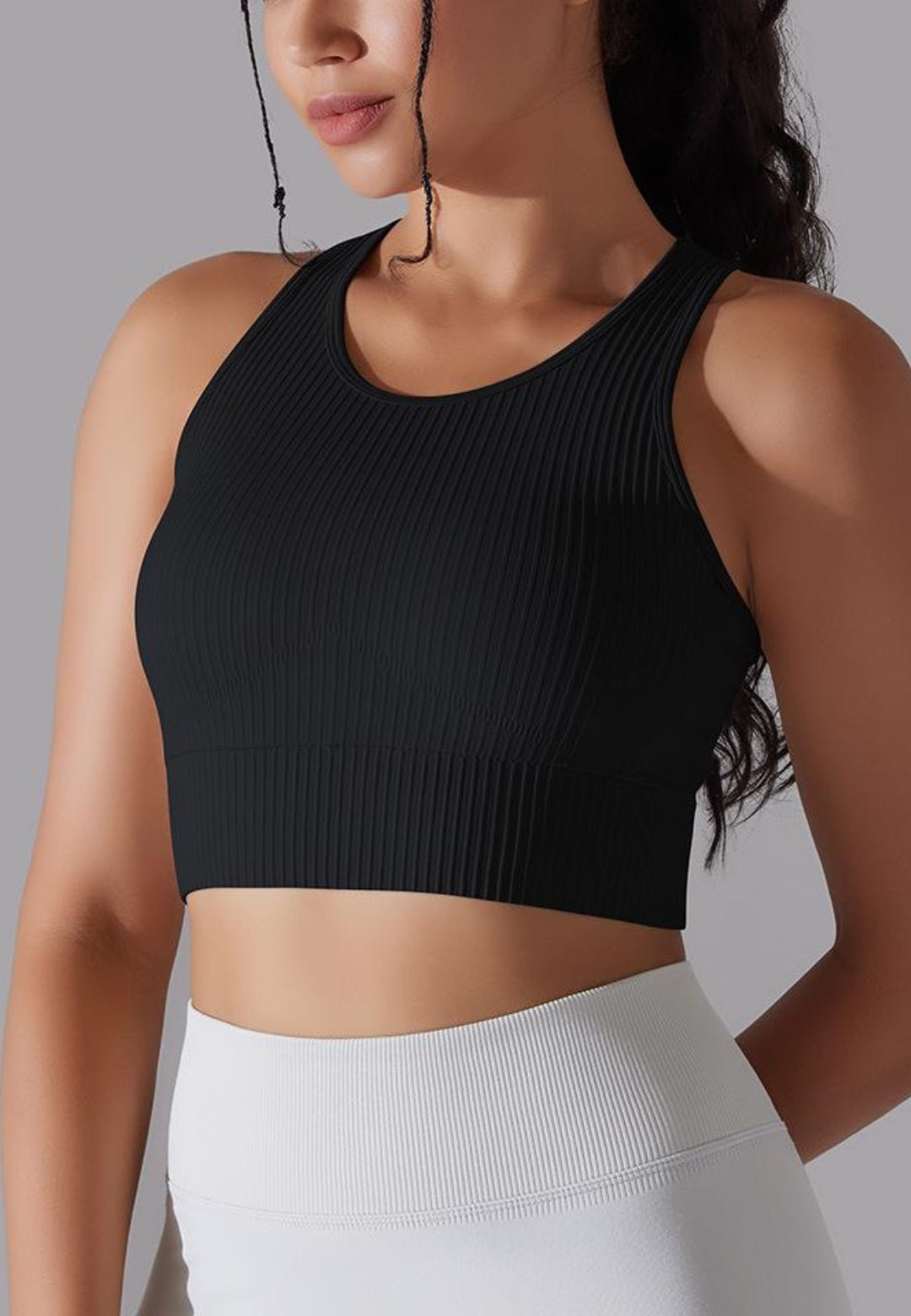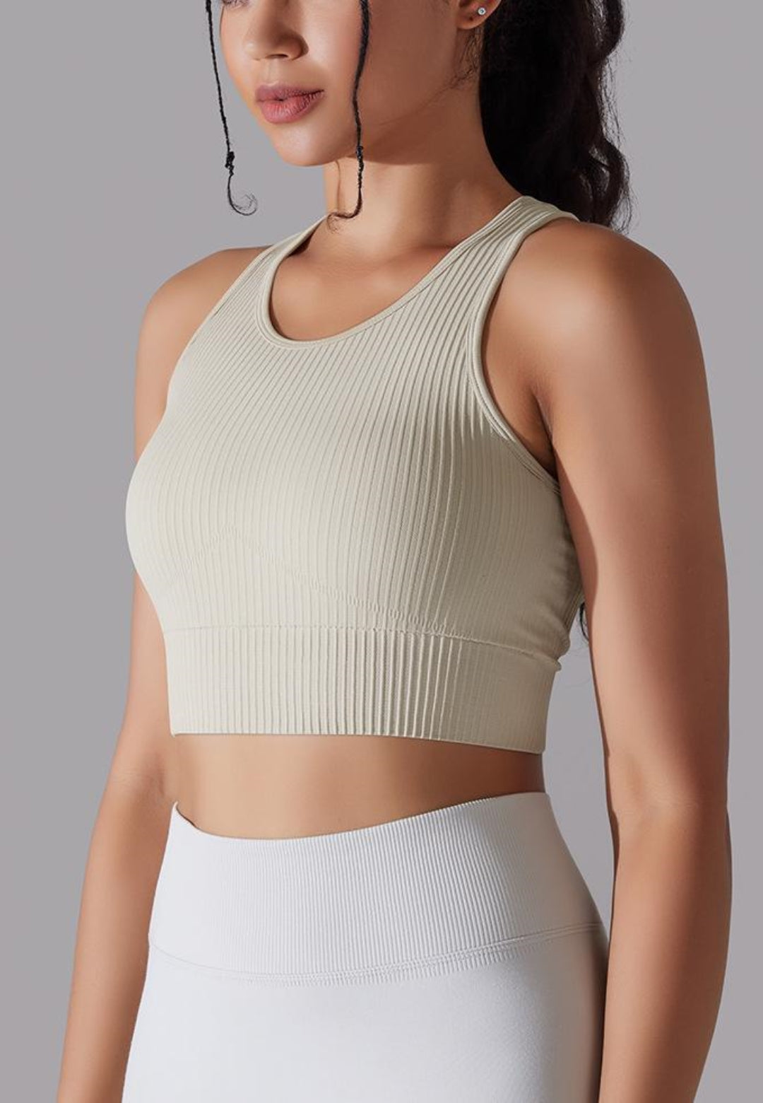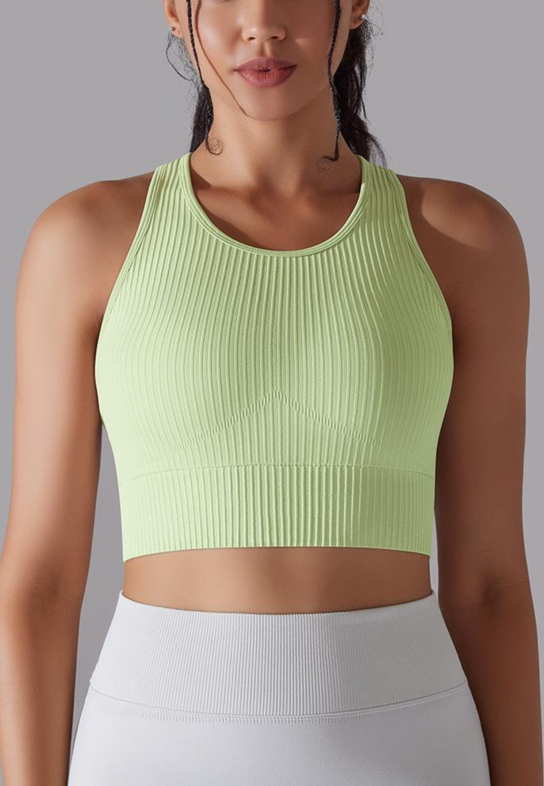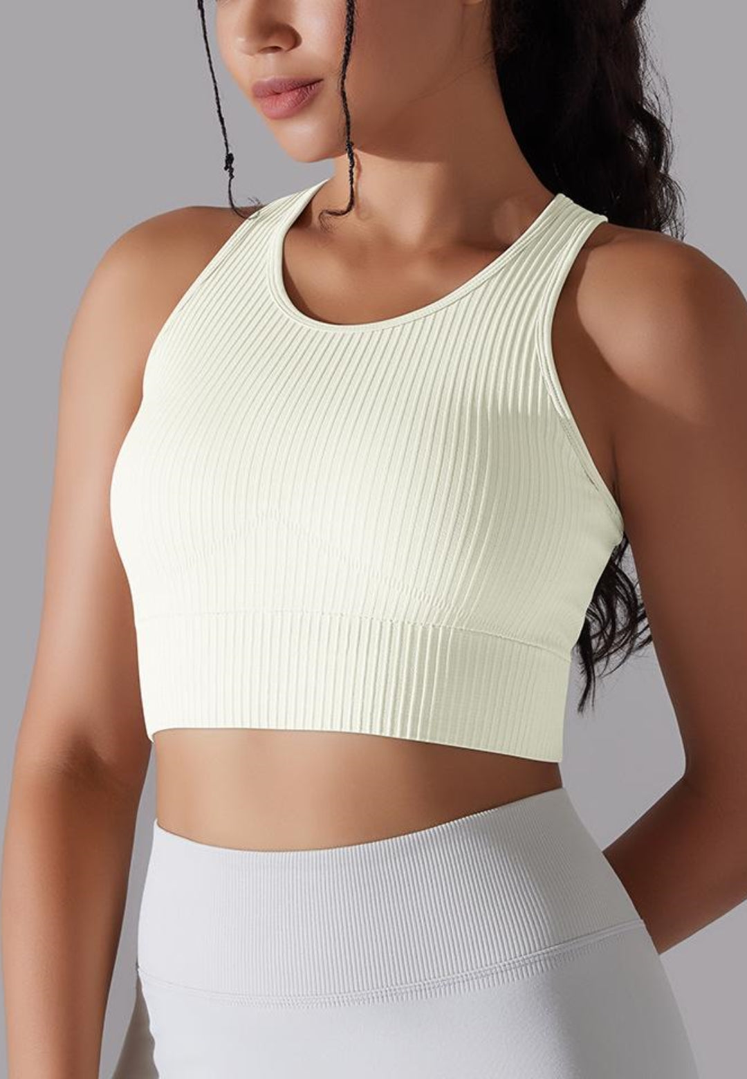 El sujetador deportivo está elaborado con un hermoso tejido de punto acanalado. Tiene escote redondo, espalda cruzada y corte ajustado. Combínalo con leggings y zapatillas para lograr un estilo relajado.