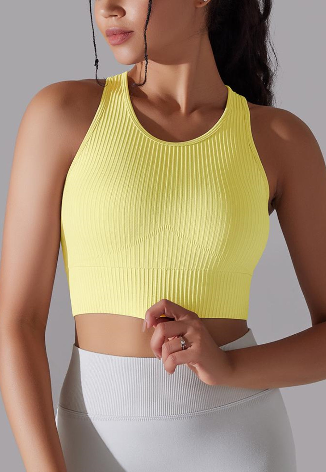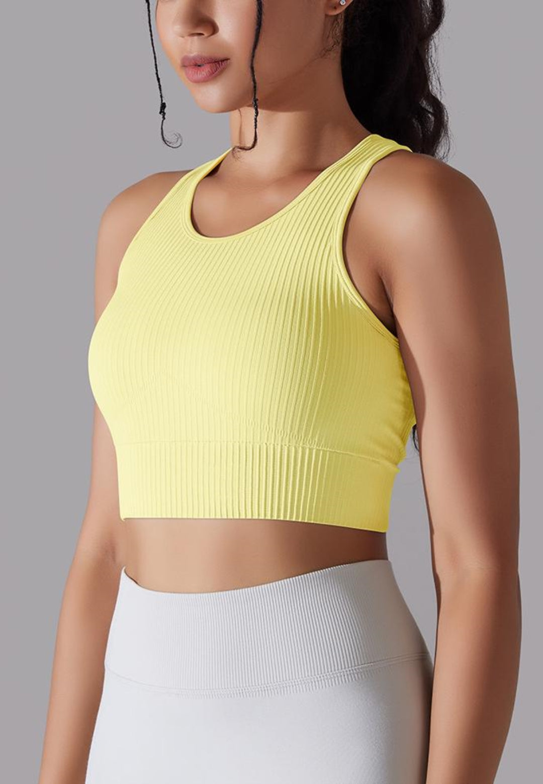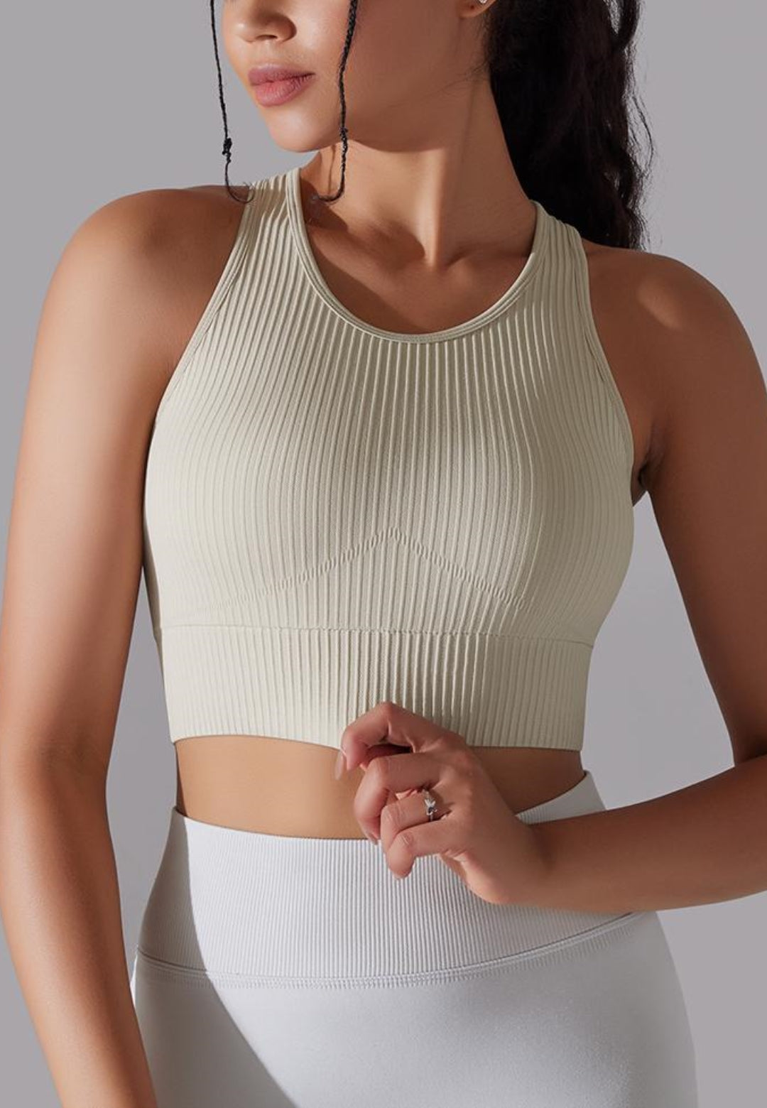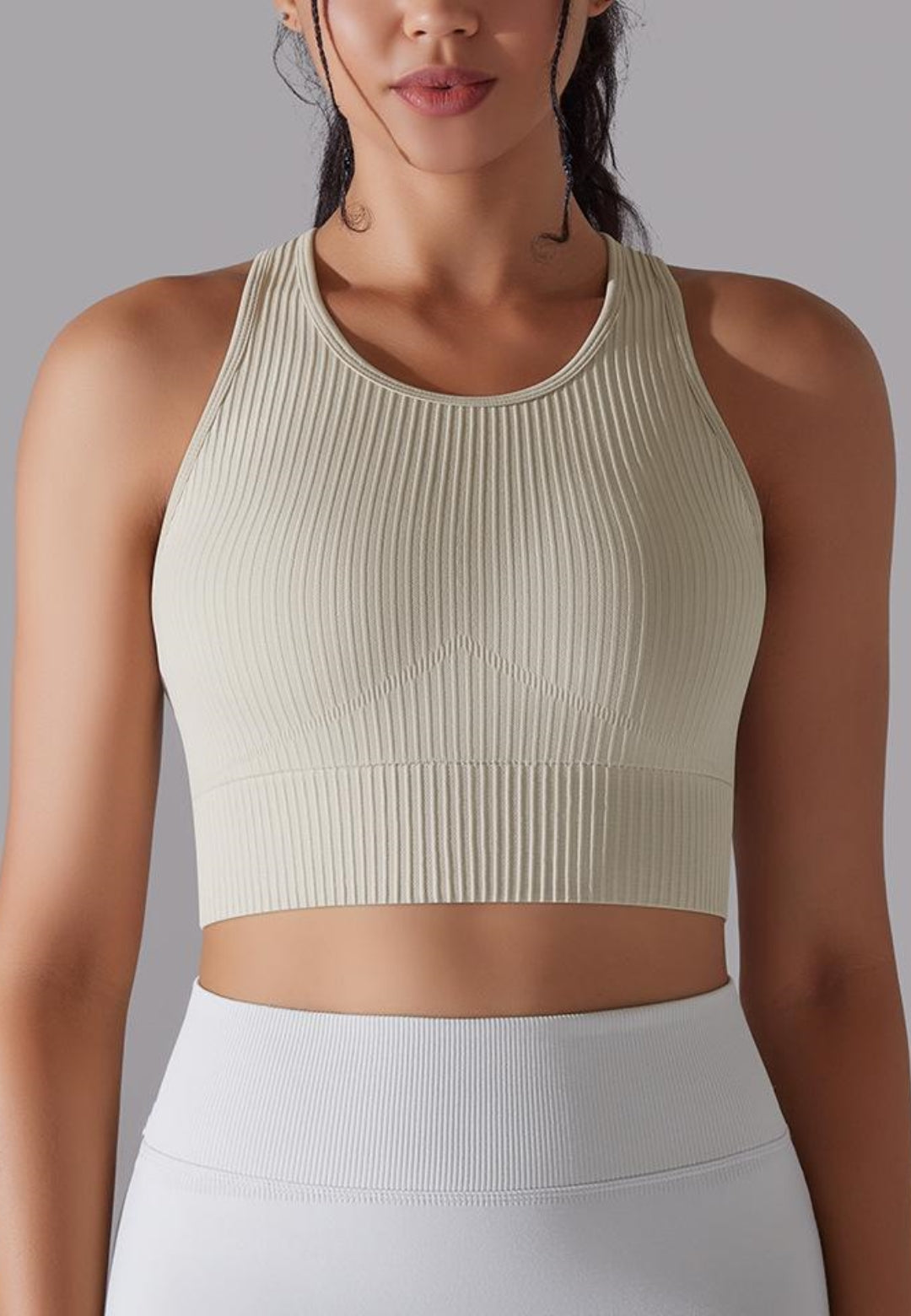 El sujetador deportivo está elaborado con un hermoso tejido de punto acanalado. Tiene escote redondo, espalda cruzada y corte ajustado. Combínalo con leggings y zapatillas para lograr un estilo relajado.