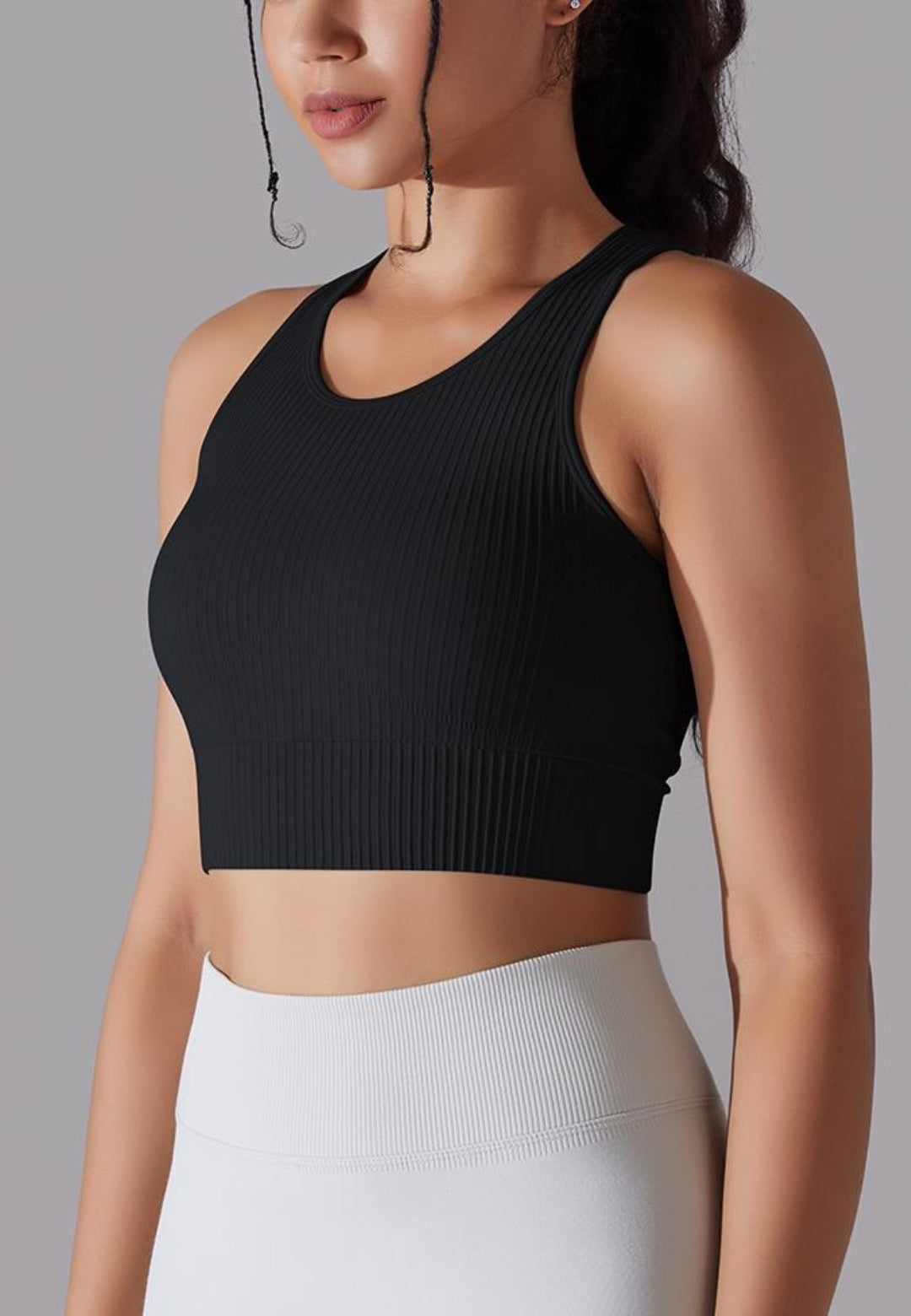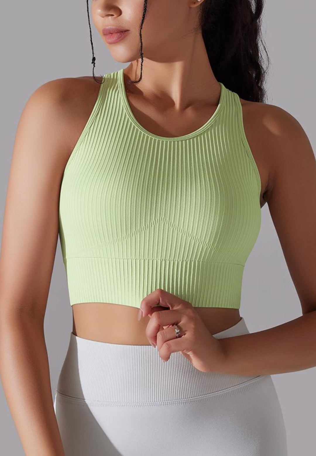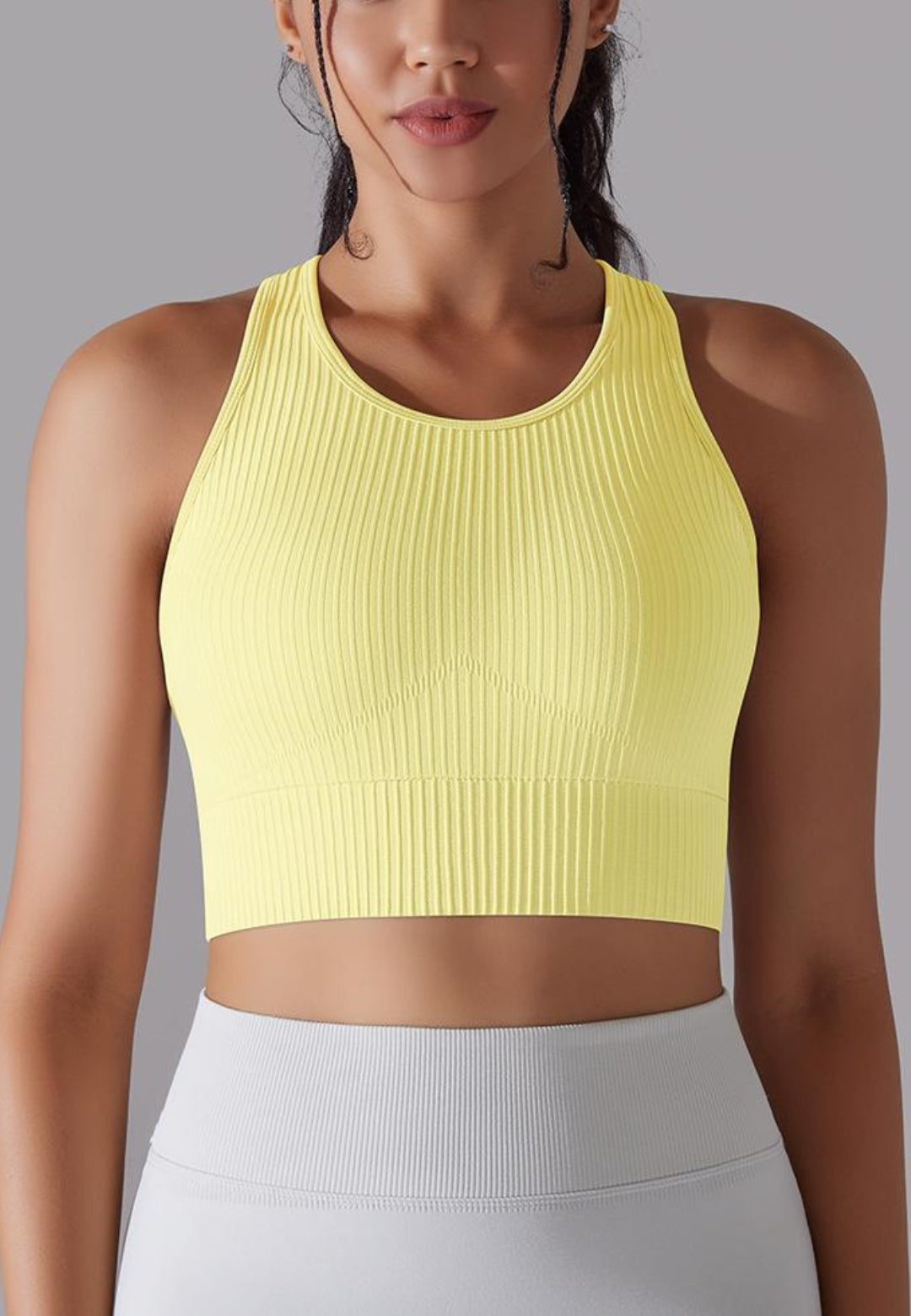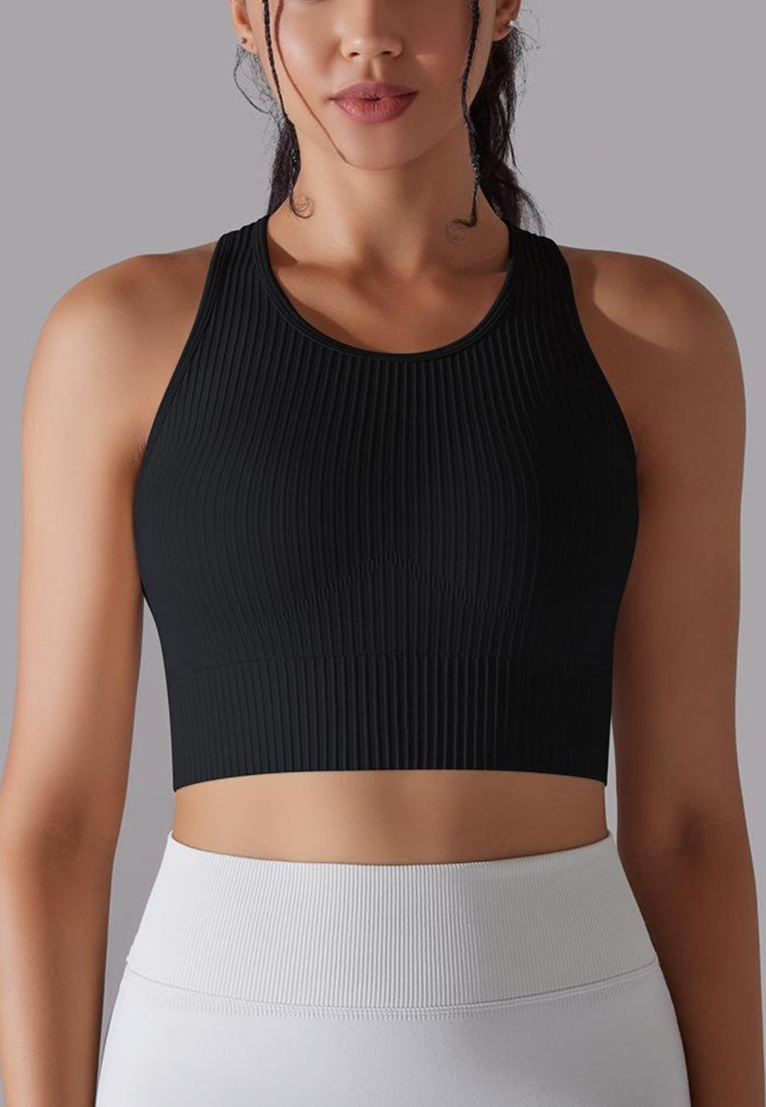 El sujetador deportivo está elaborado con un hermoso tejido de punto acanalado. Tiene escote redondo, espalda cruzada y corte ajustado. Combínalo con leggings y zapatillas para lograr un estilo relajado.