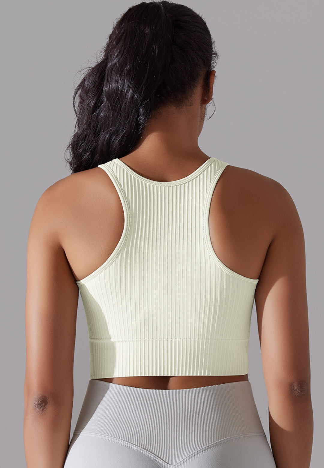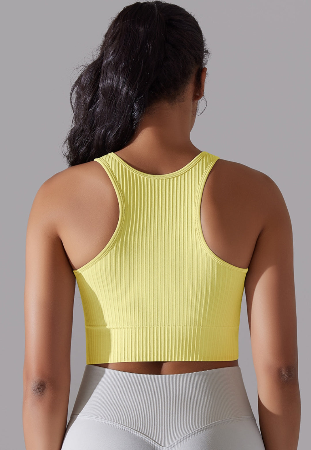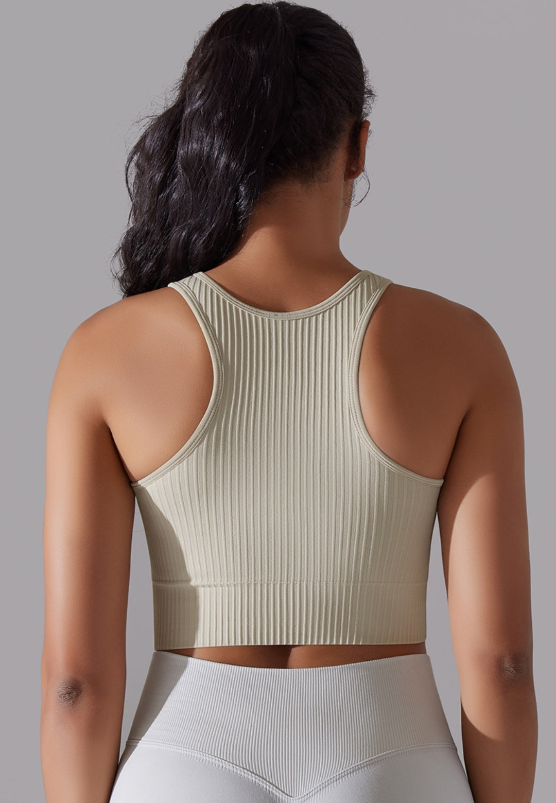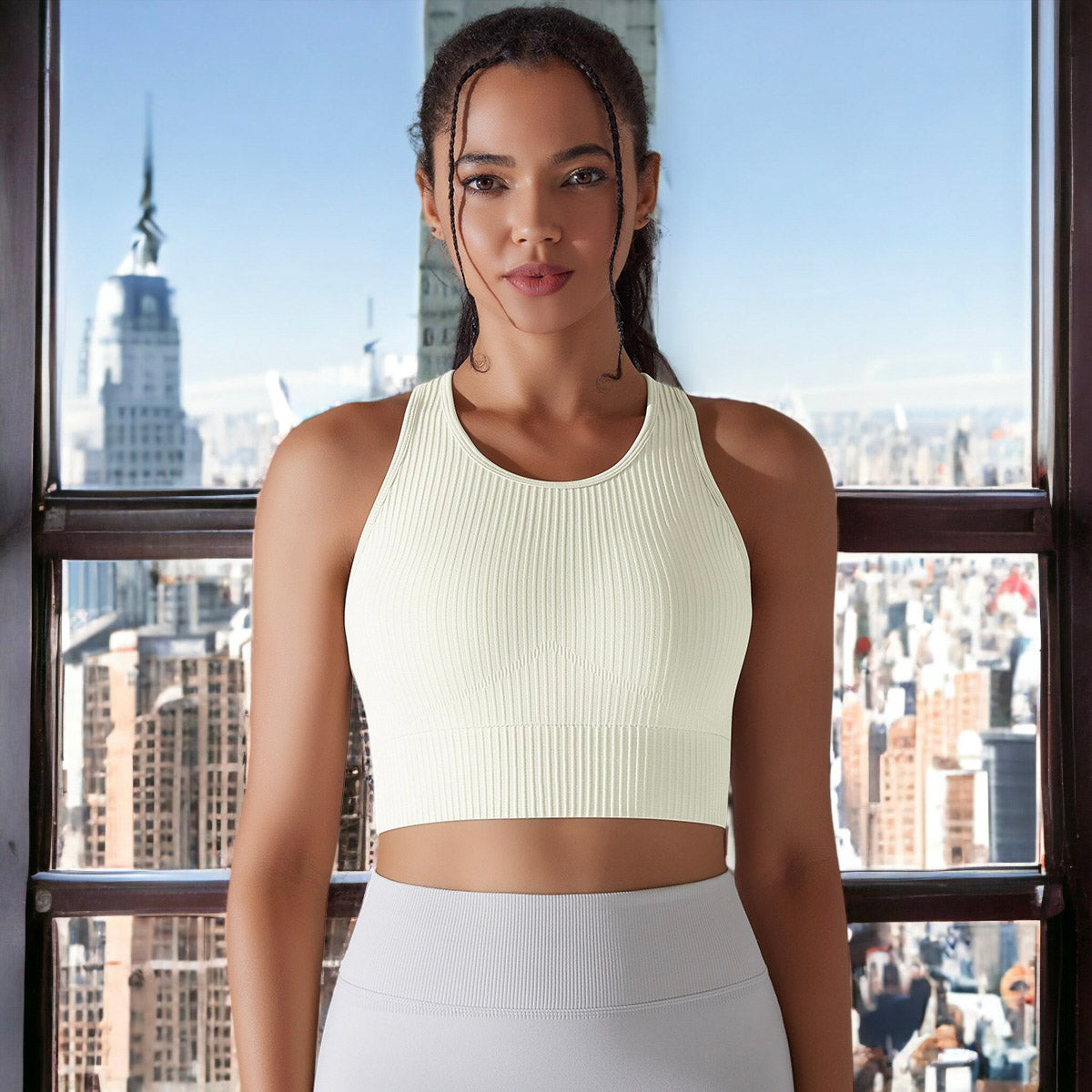 El sujetador deportivo está elaborado con un hermoso tejido de punto acanalado. Tiene escote redondo, espalda cruzada y corte ajustado. Combínalo con leggings y zapatillas para lograr un estilo relajado.