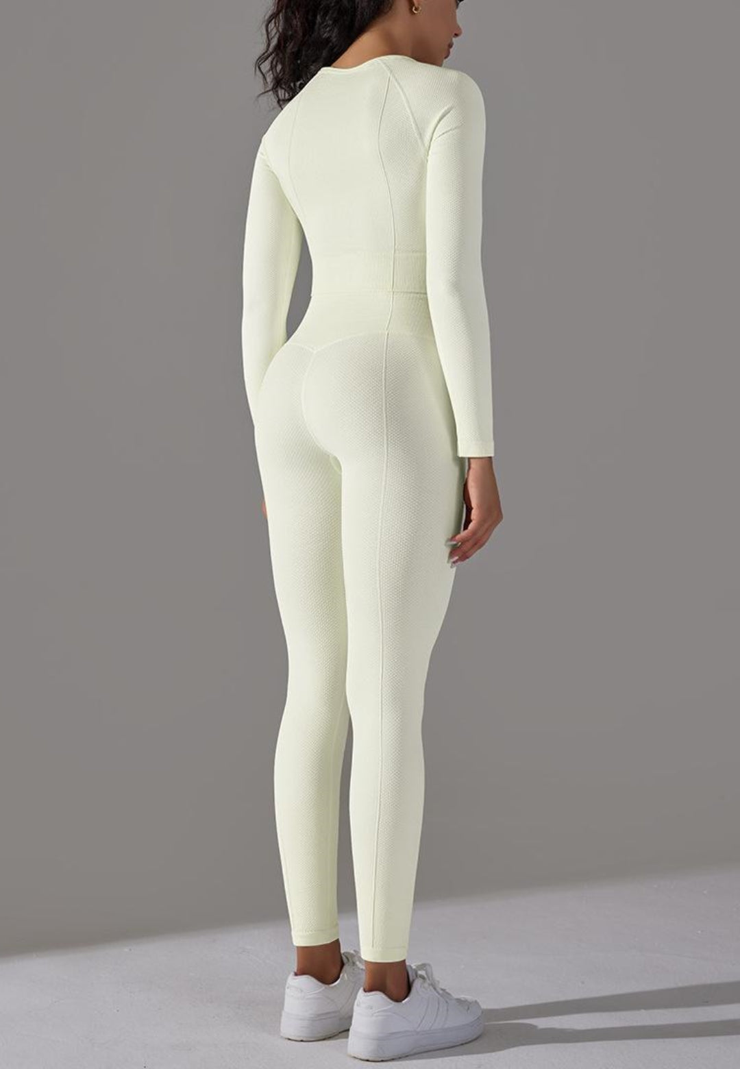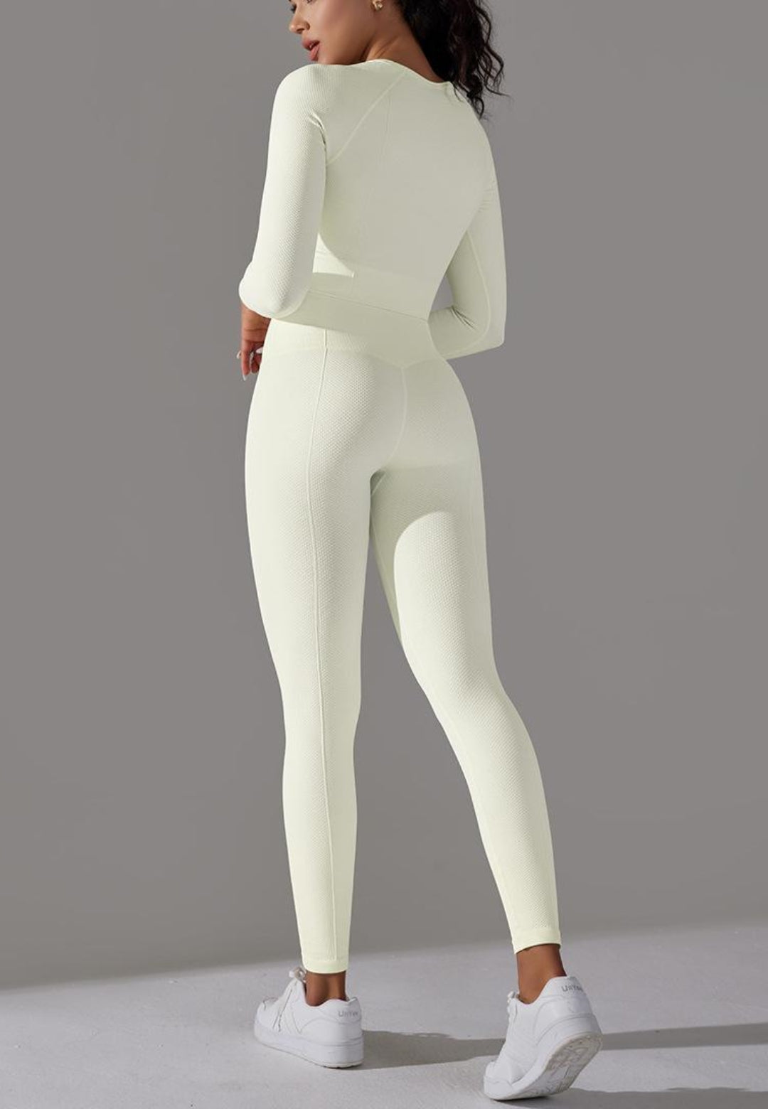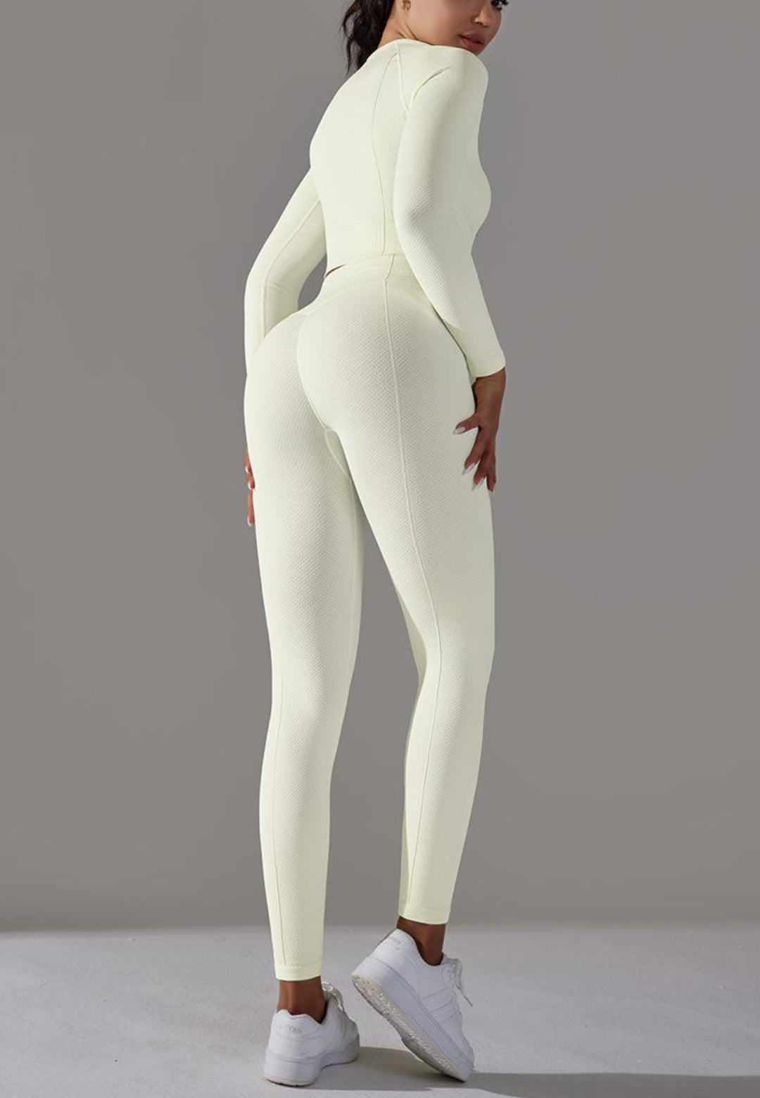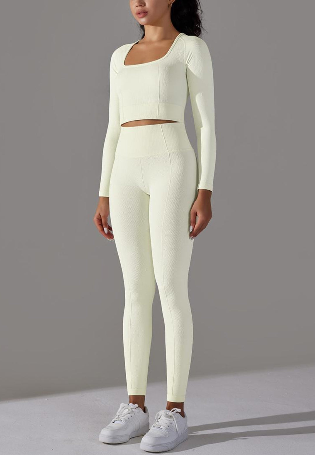 El conjunto tiene mangas largas modernas. Tiene un color liso, escote cuadrado, top corto y leggings de cintura alta a juego. Combínalo con una gorra y zapatillas para lograr un estilo deportivo.