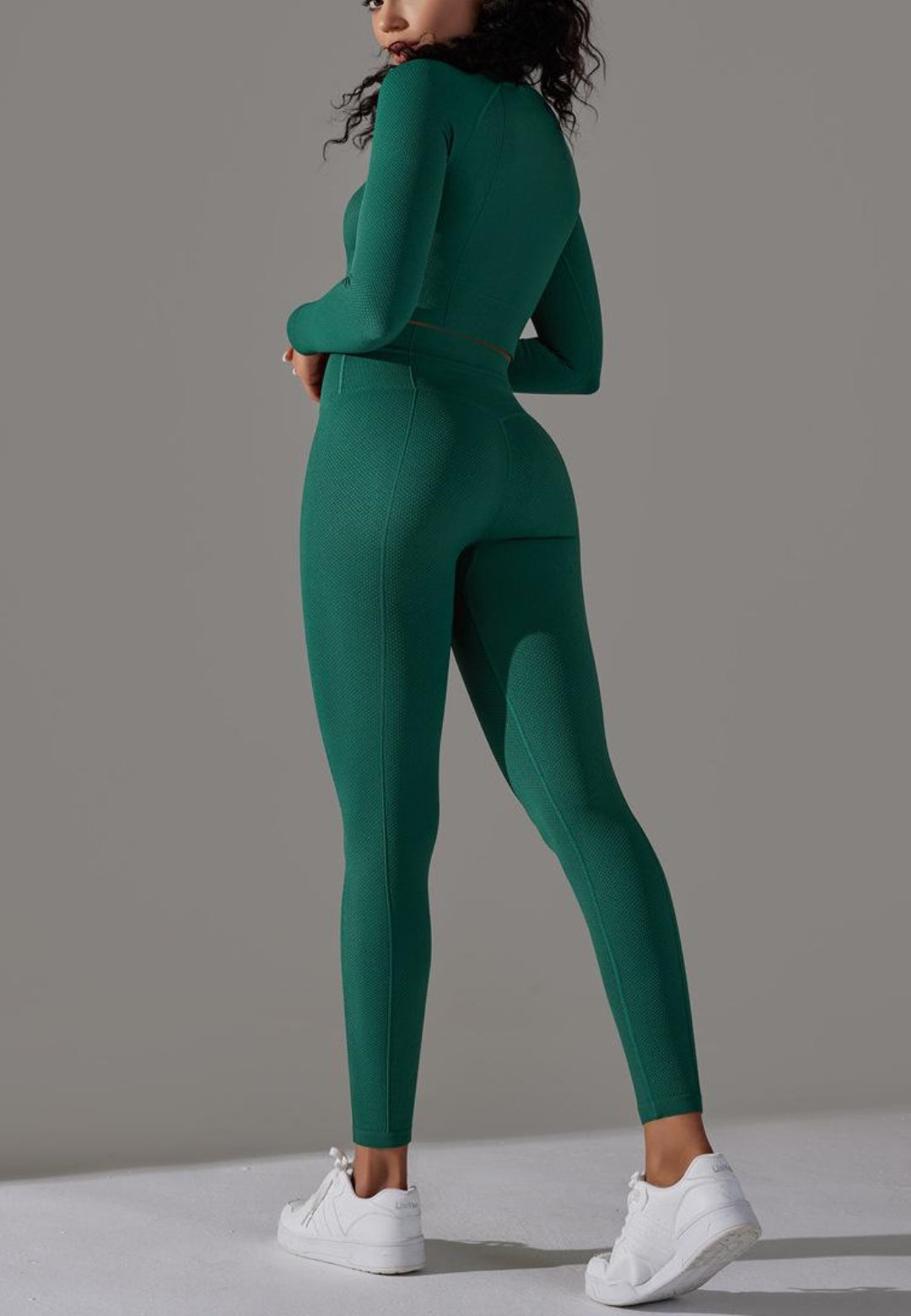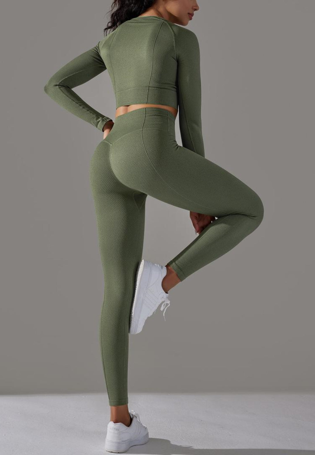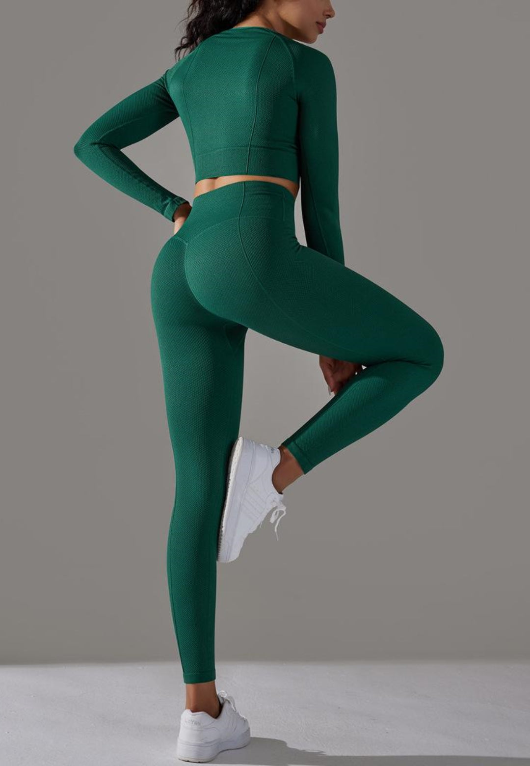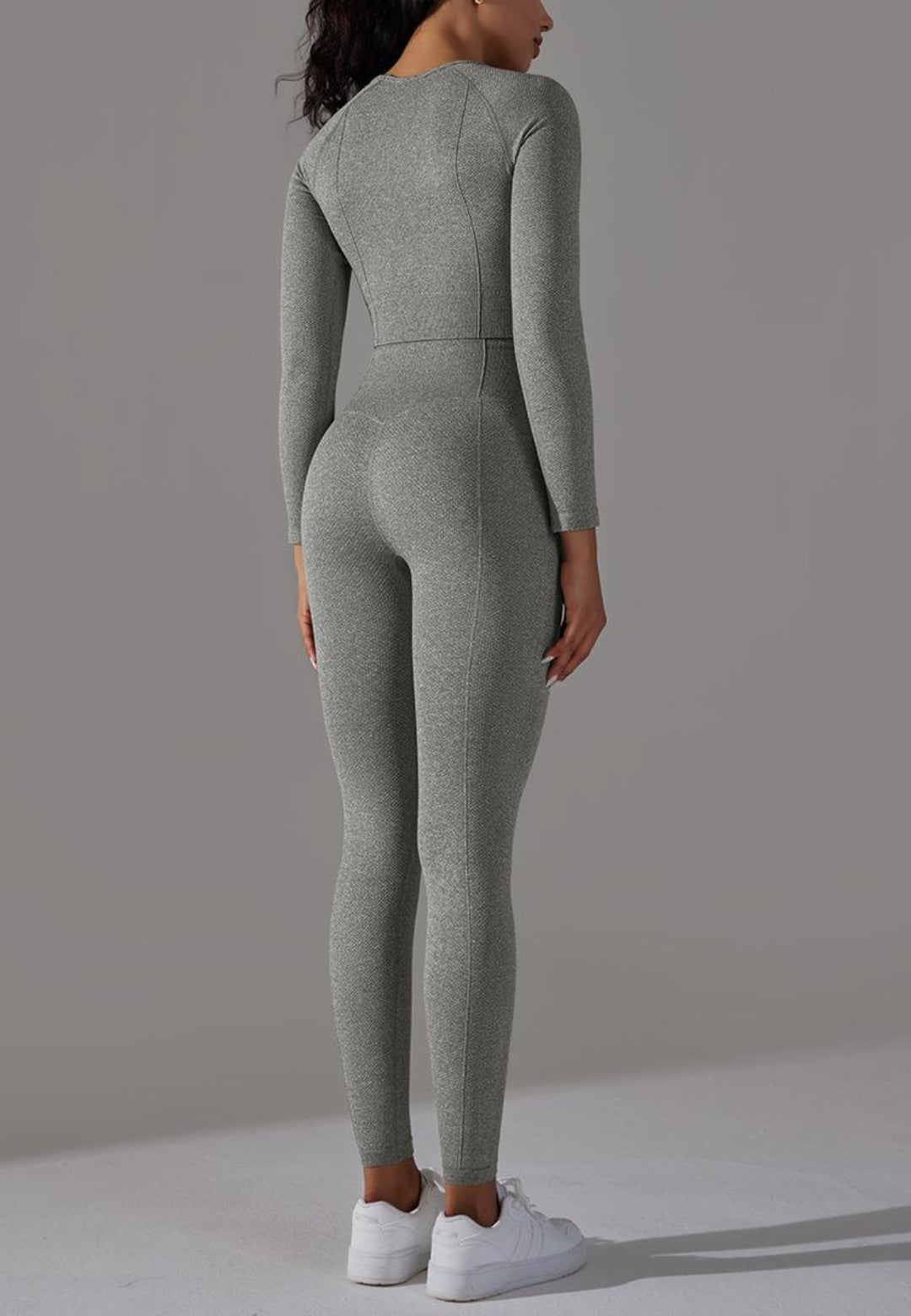 El conjunto tiene mangas largas modernas. Tiene un color liso, escote cuadrado, top corto y leggings de cintura alta a juego. Combínalo con una gorra y zapatillas para lograr un estilo deportivo.