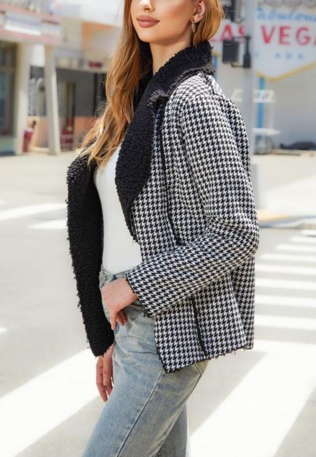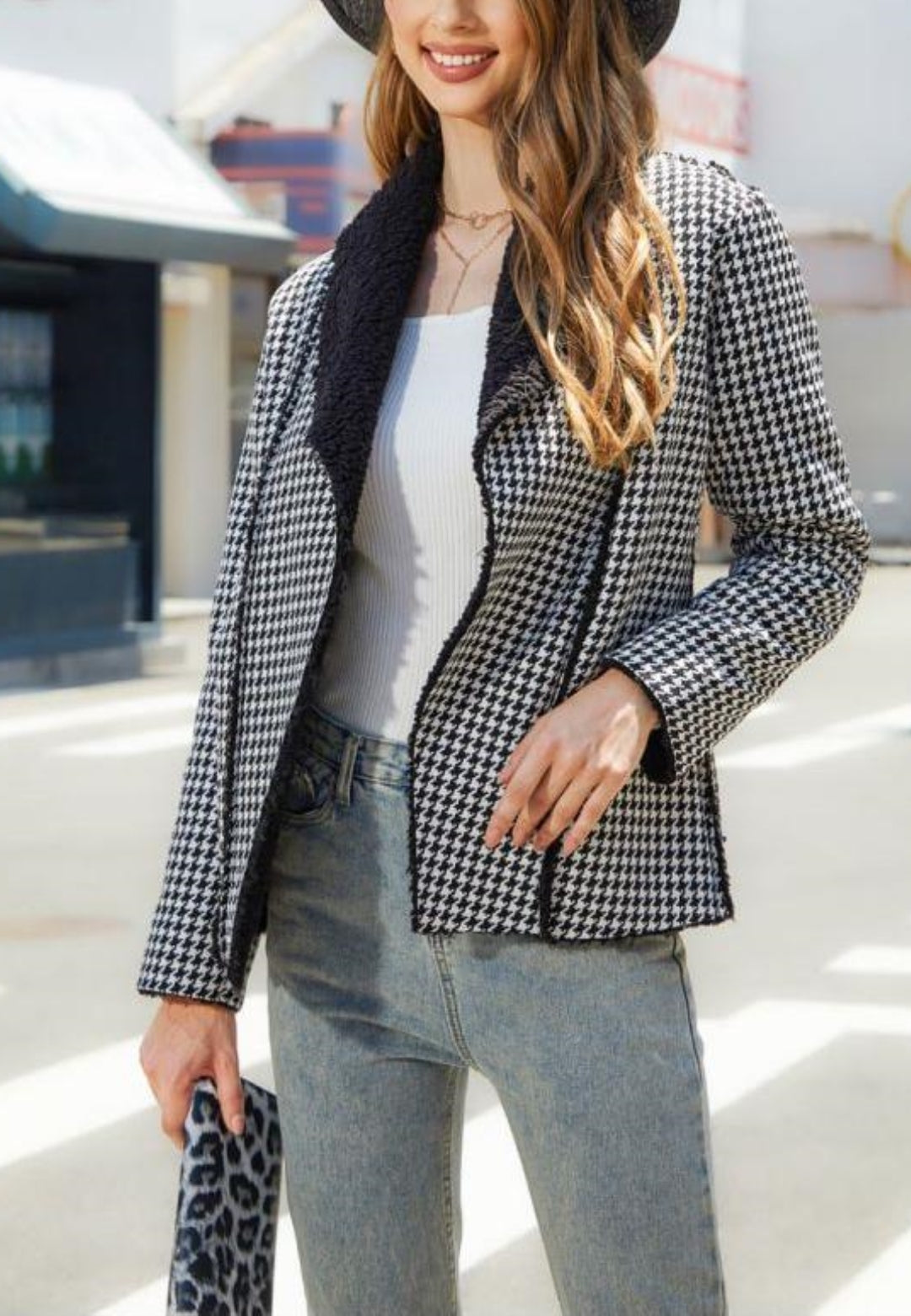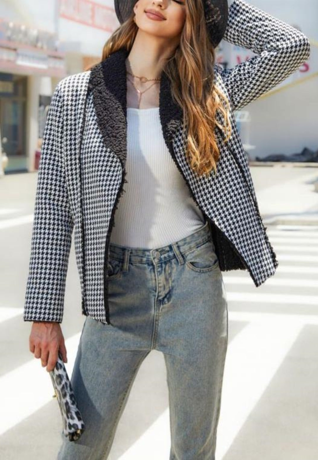 El blazer tiene un estampado clásico de pata de gallo. Tiene cuello alto, mangas largas, frente abierto y corte regular. Llévalo con una remera y jeans para lograr un estilo sofisticado.