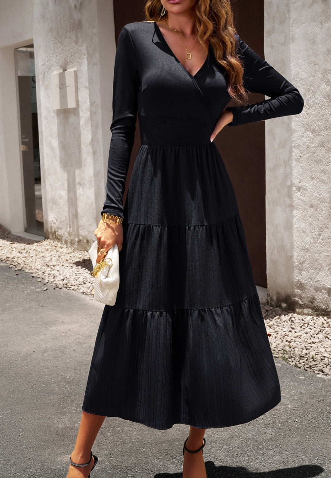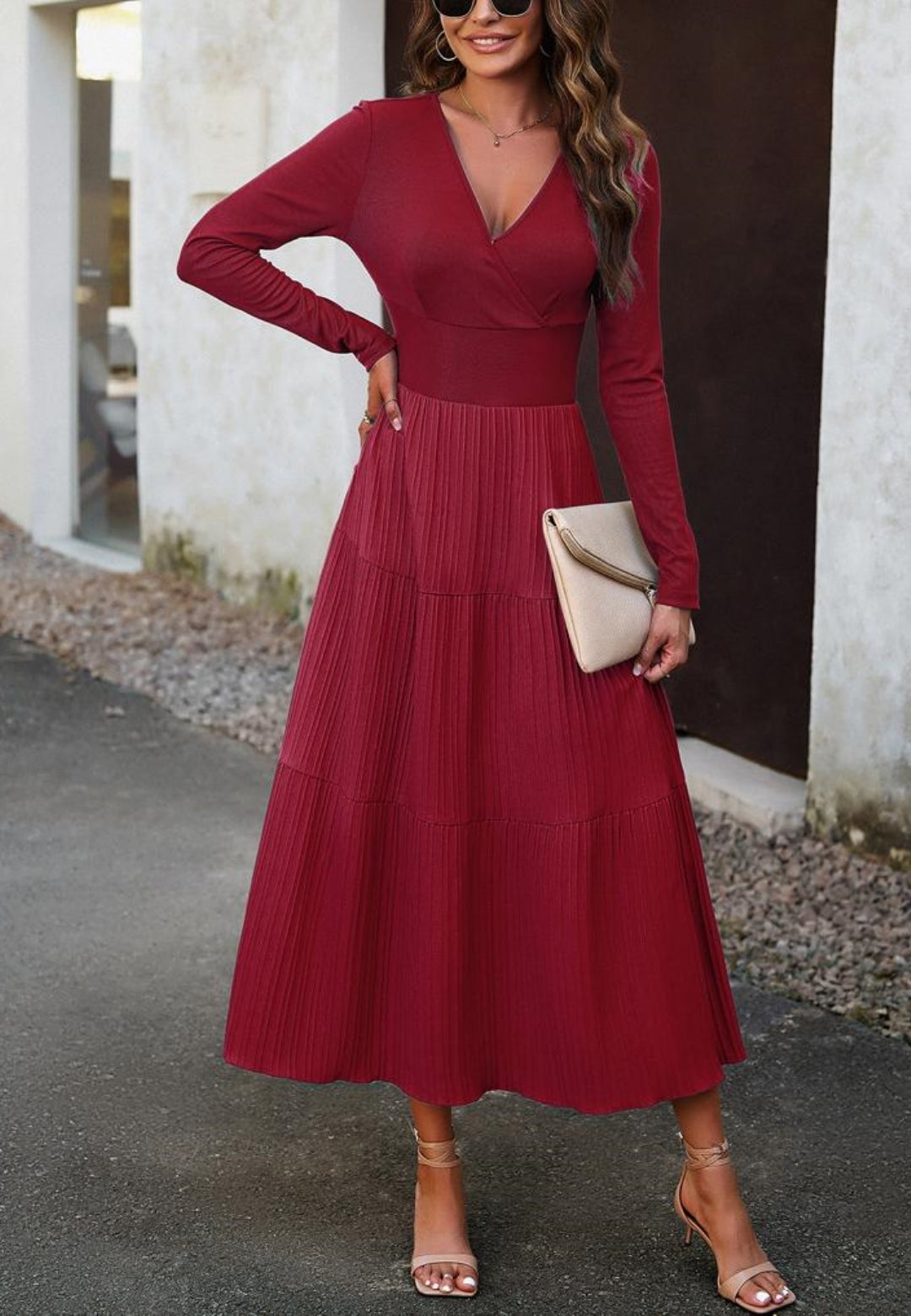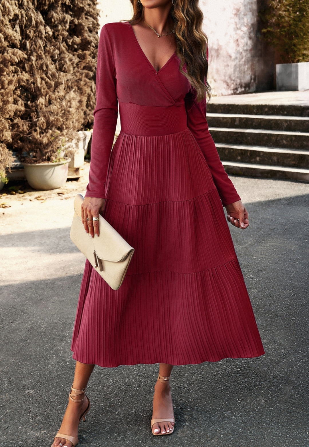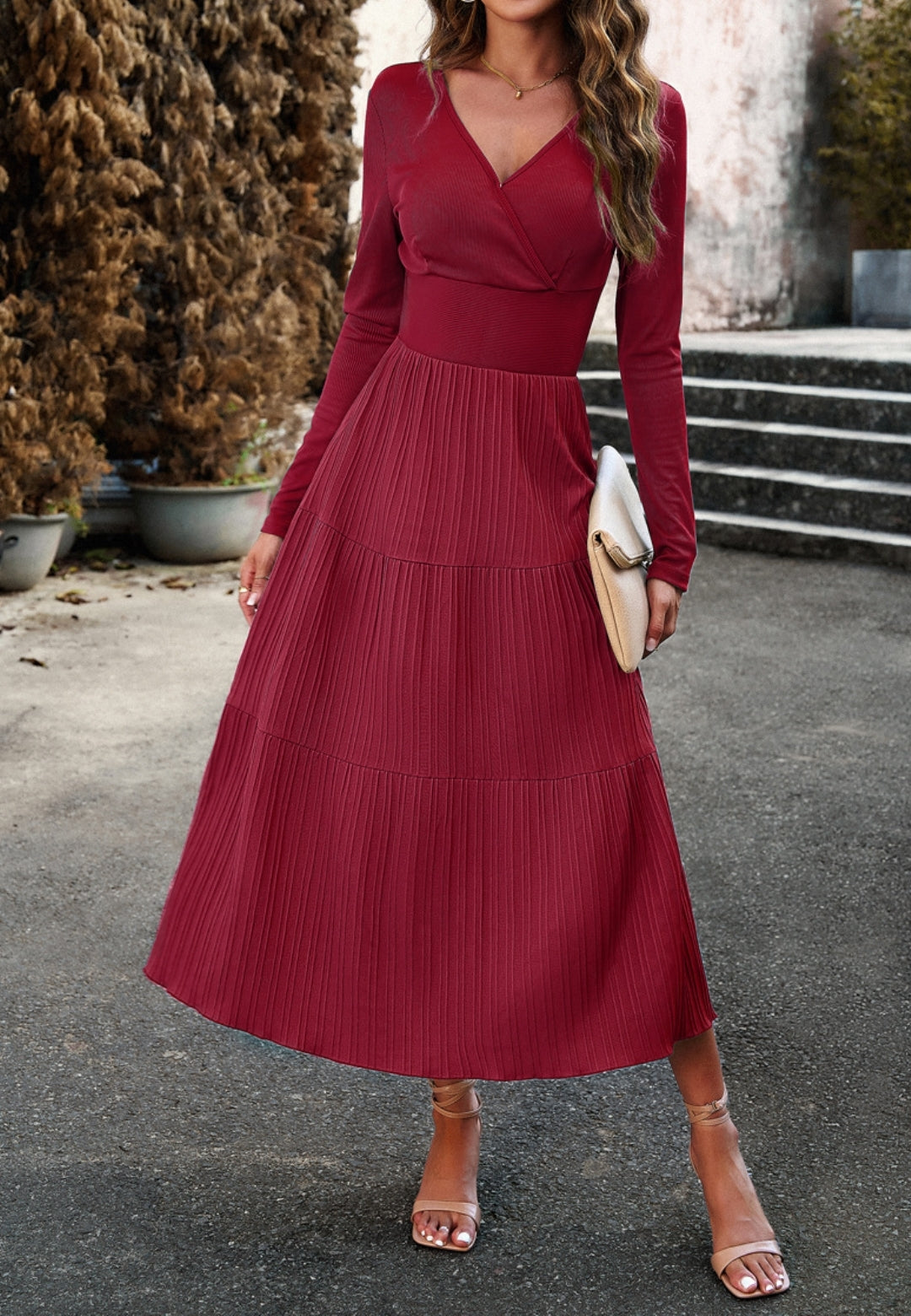 El vestido tiene una impresionante falda plisada con capas. Tiene un color liso, escote cruzado, mangas largas y largo hasta la mitad de la pantorrilla. Combínalo con un clutch y tacones para lograr un hermoso look.
