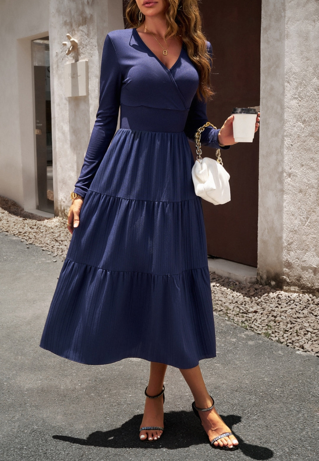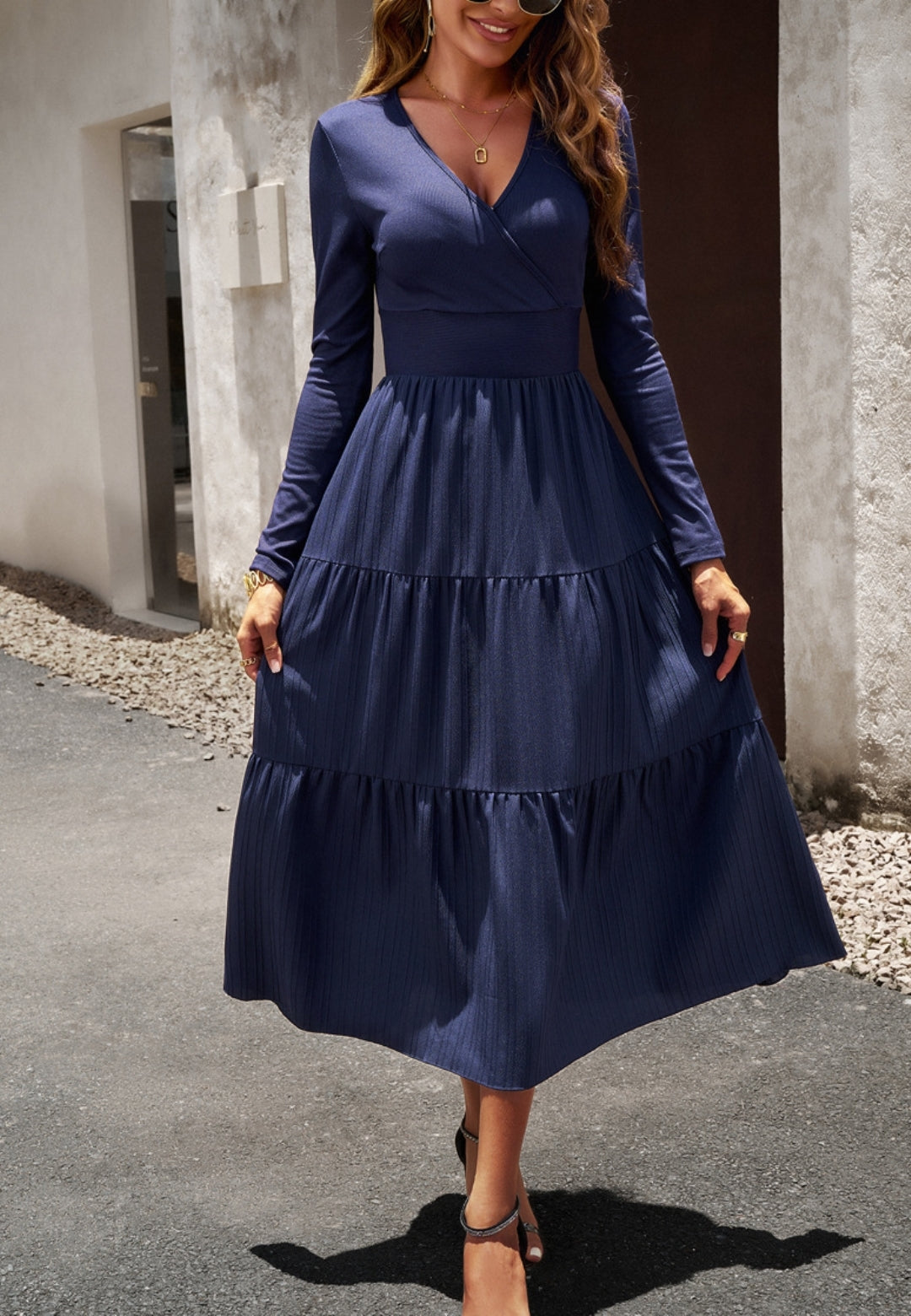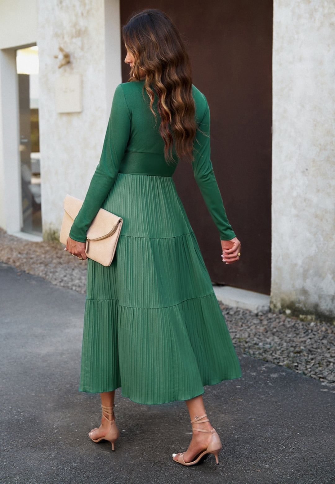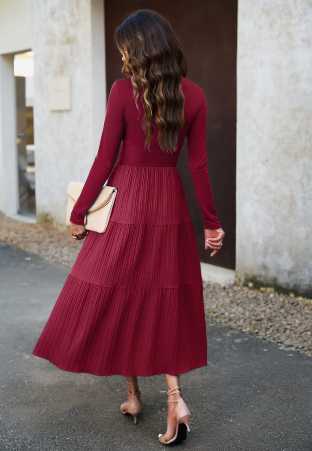 El vestido tiene una impresionante falda plisada con capas. Tiene un color liso, escote cruzado, mangas largas y largo hasta la mitad de la pantorrilla. Combínalo con un clutch y tacones para lograr un hermoso look.