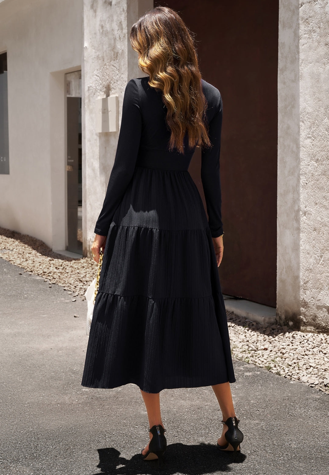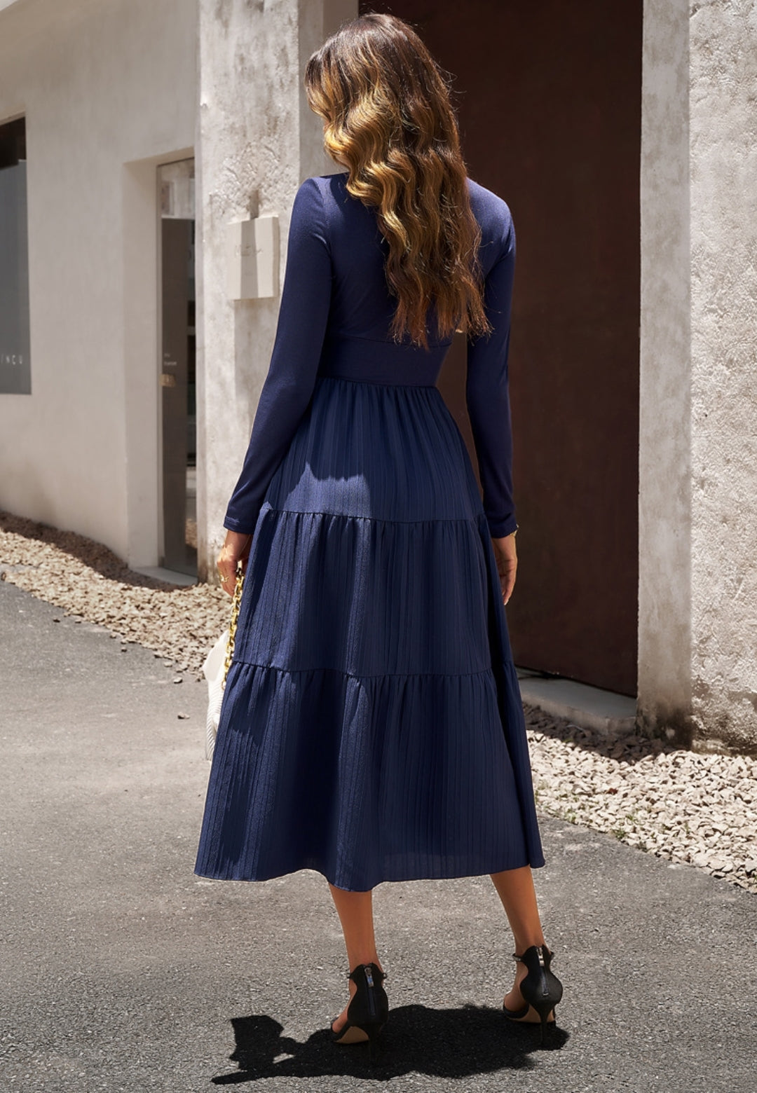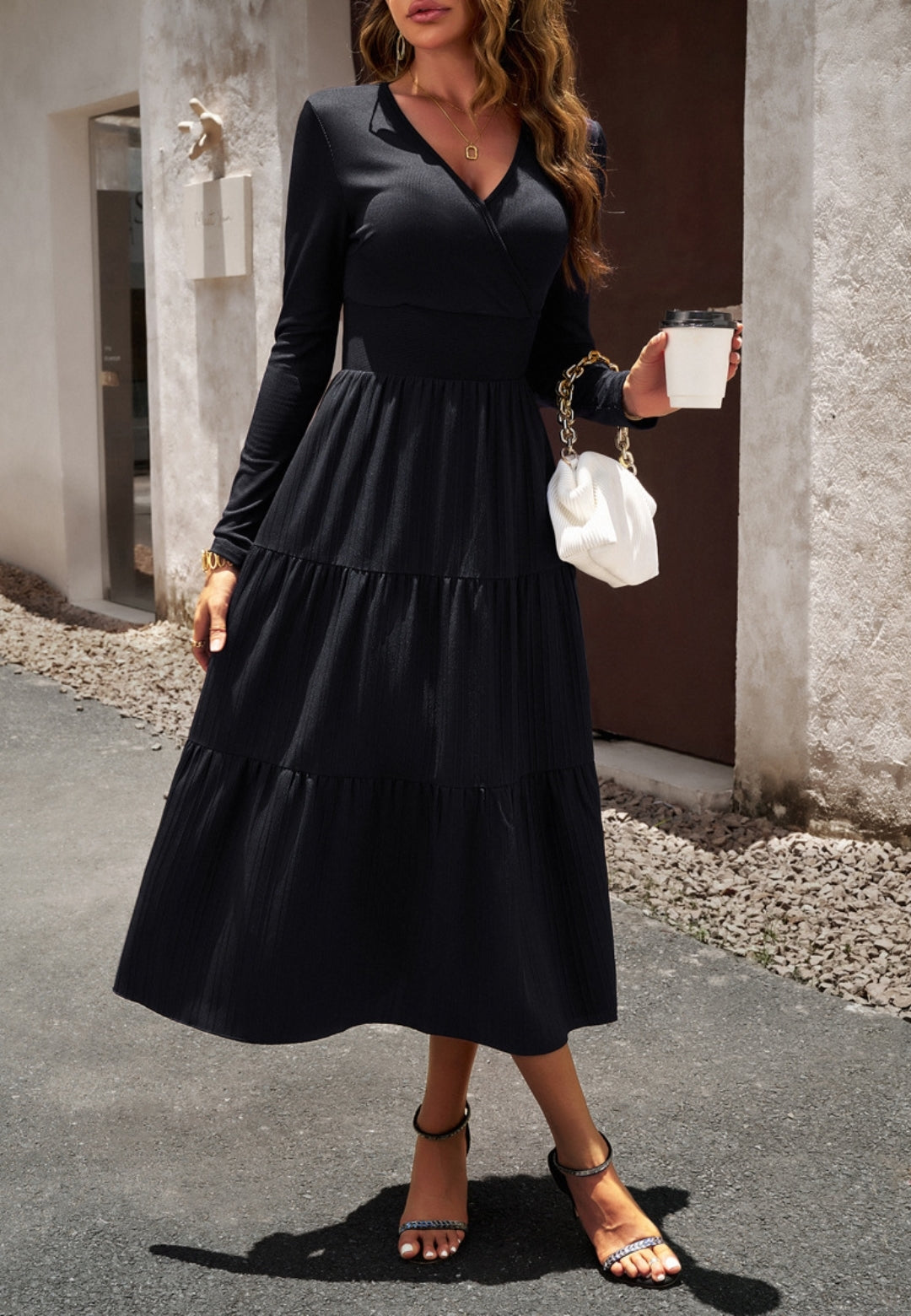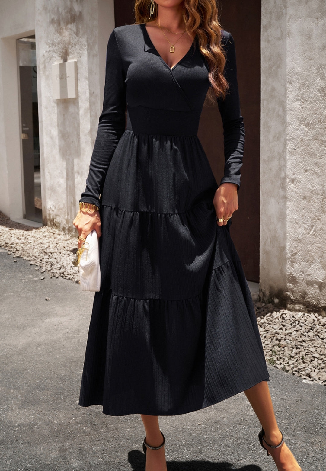 El vestido tiene una impresionante falda plisada con capas. Tiene un color liso, escote cruzado, mangas largas y largo hasta la mitad de la pantorrilla. Combínalo con un clutch y tacones para lograr un hermoso look.