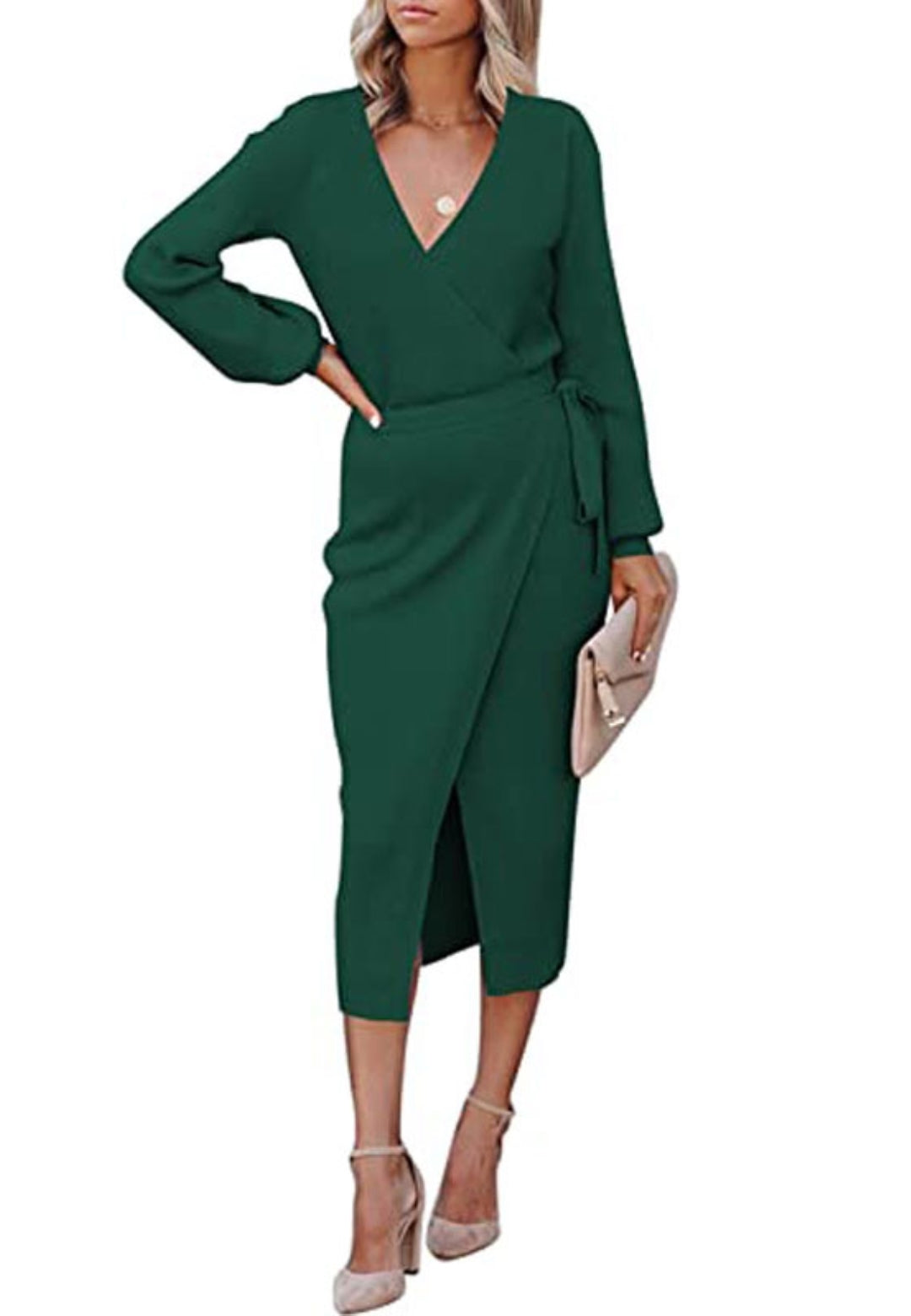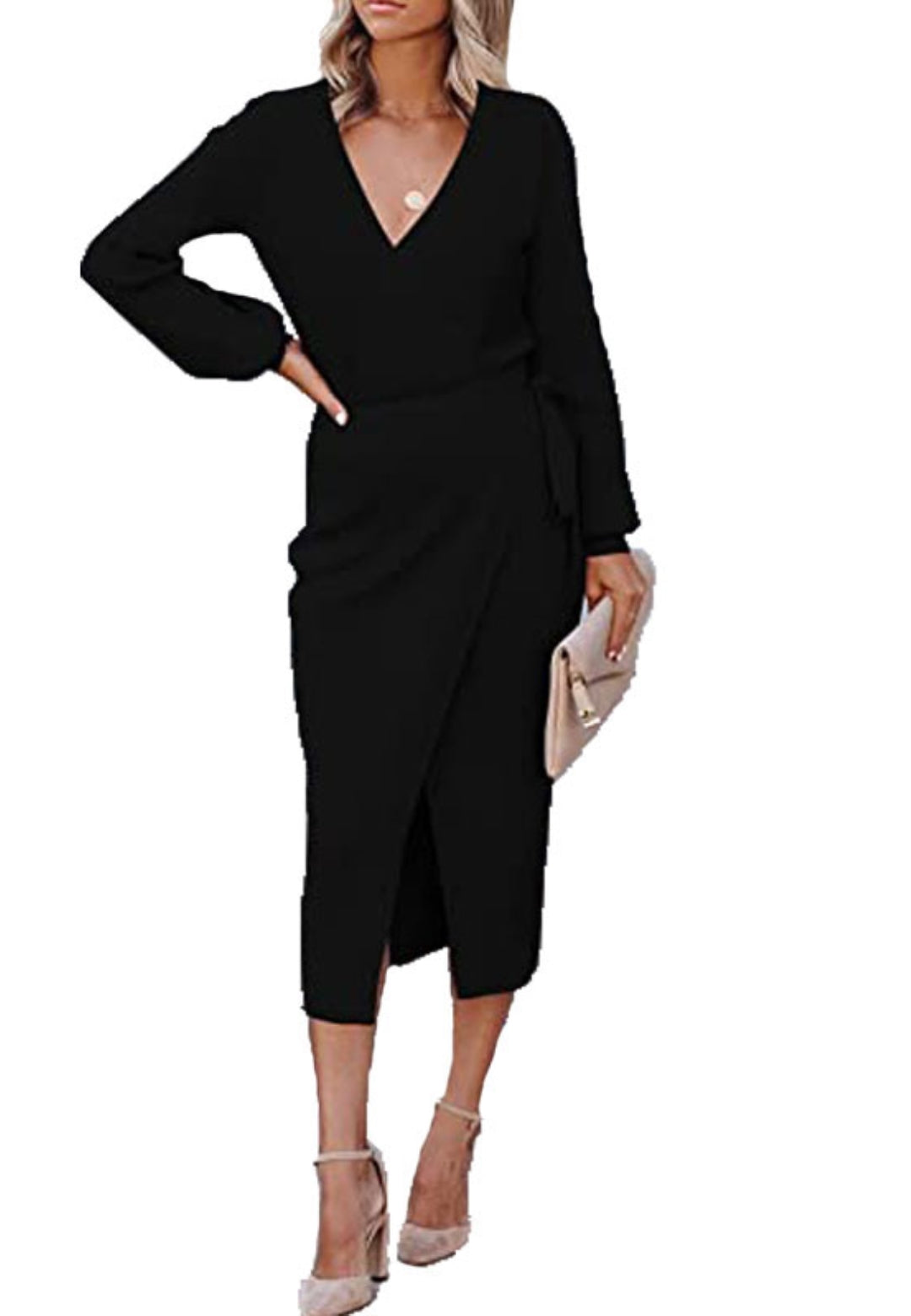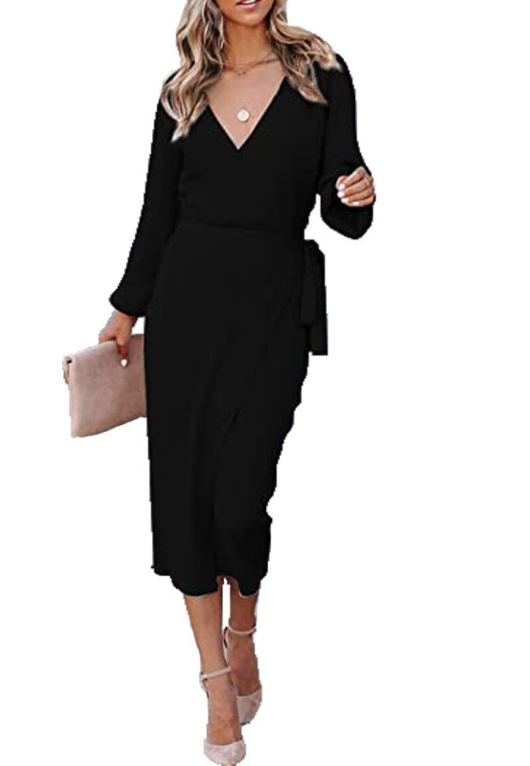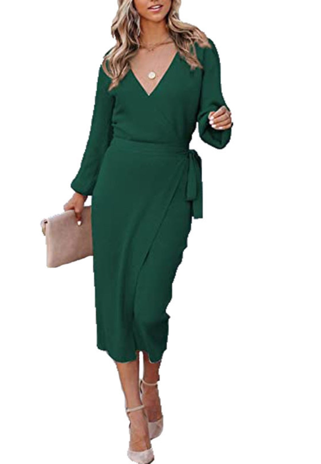 El vestido tiene un bonito estilo cruzado. Es de color liso, tiene escote cruzado, mangas largas y largo hasta la mitad de la pantorrilla. Combínalo con un clutch y tacones para lograr un look sofisticado.