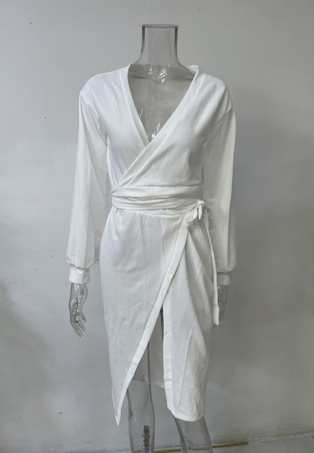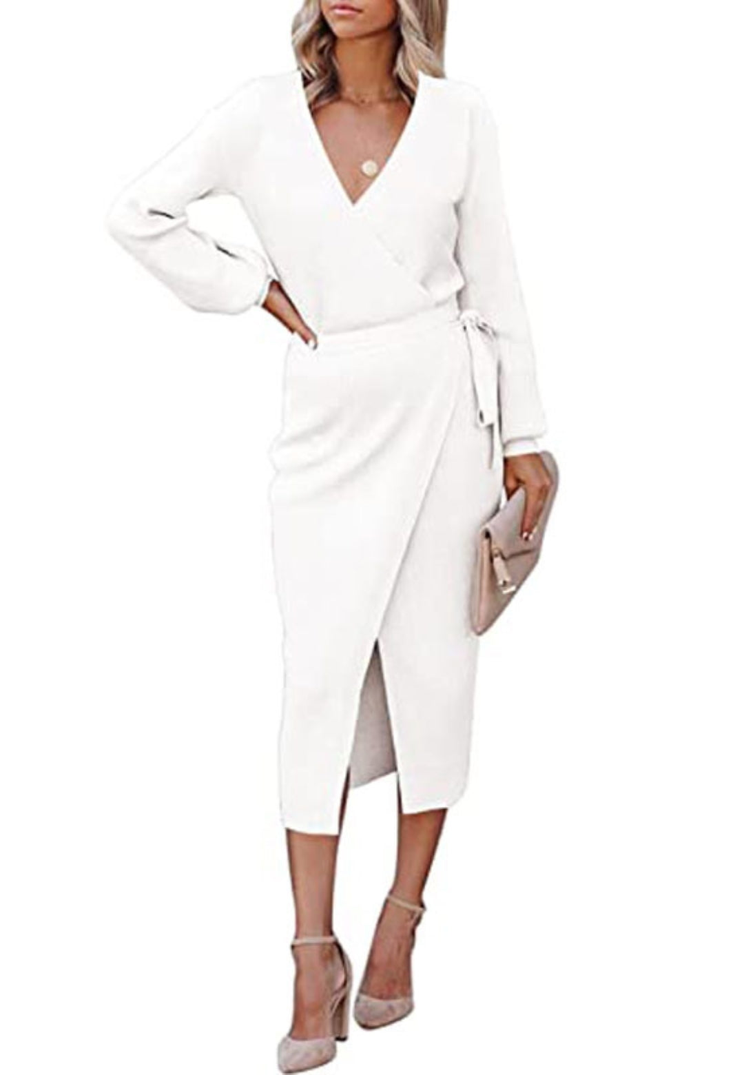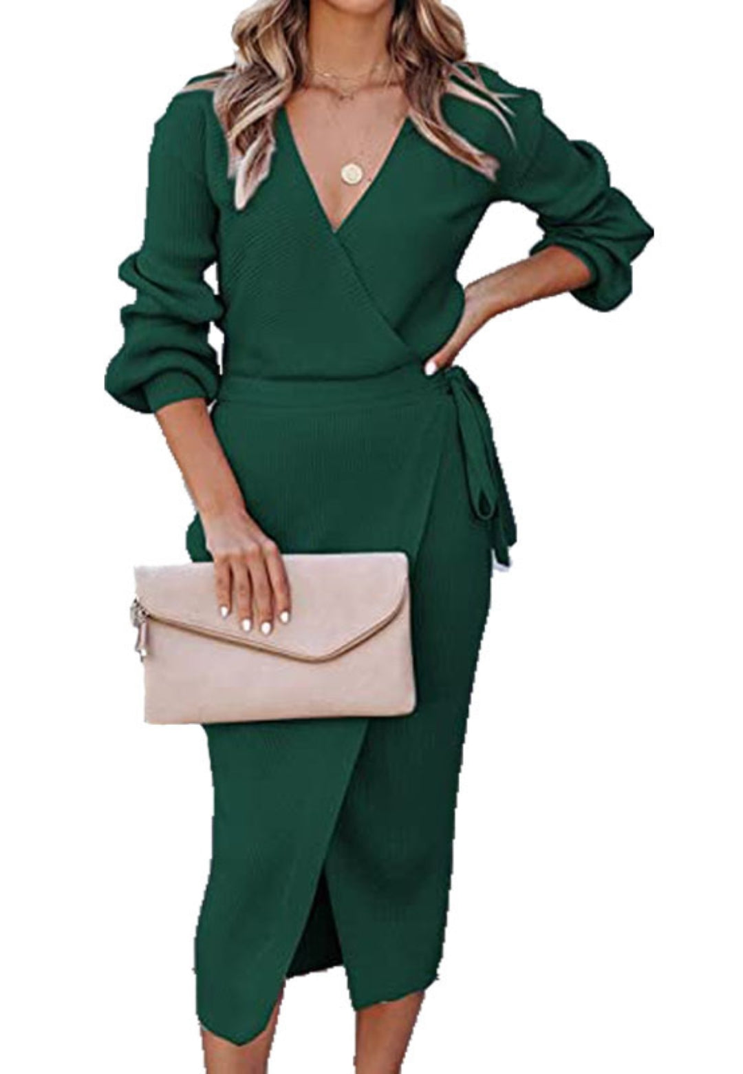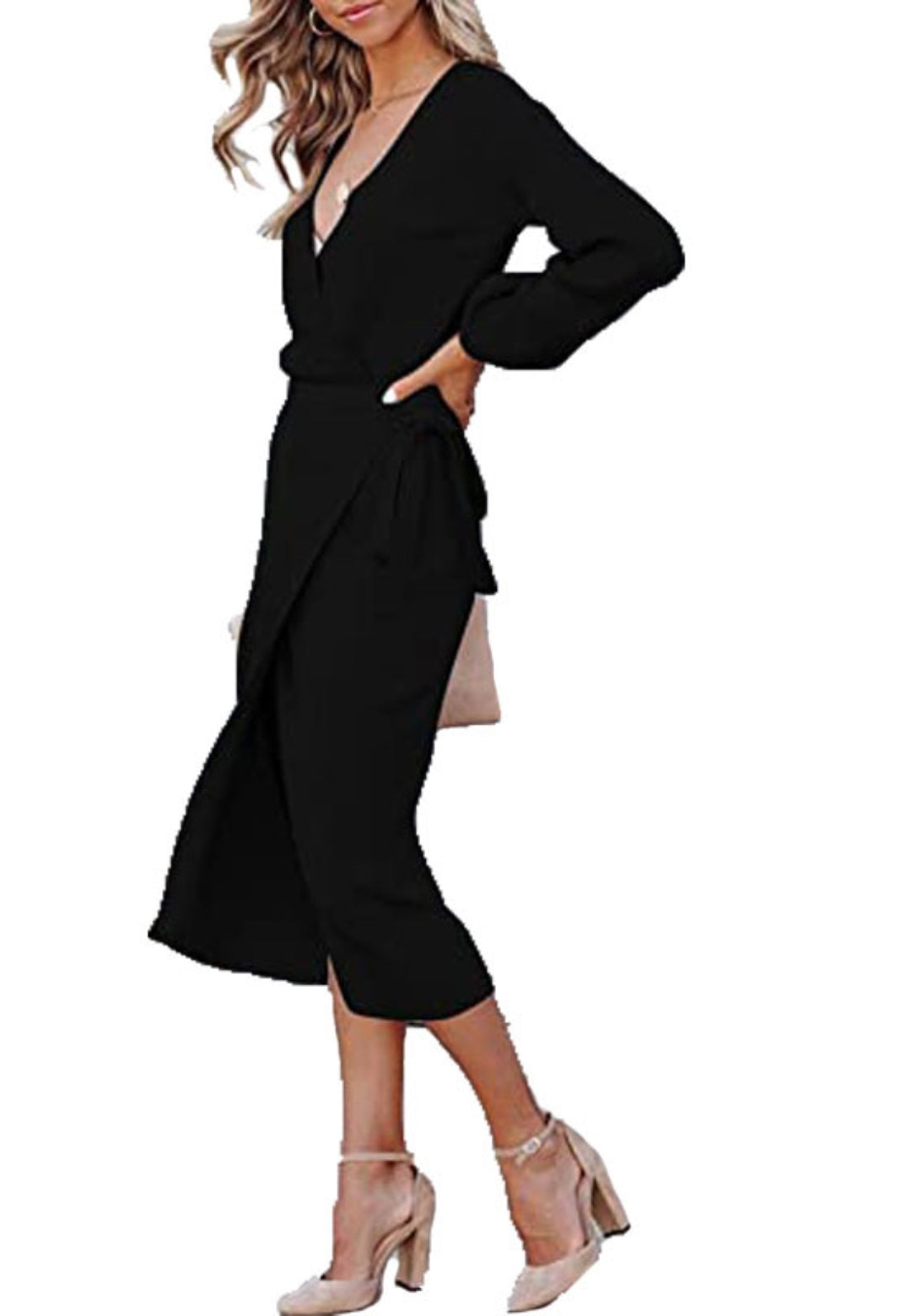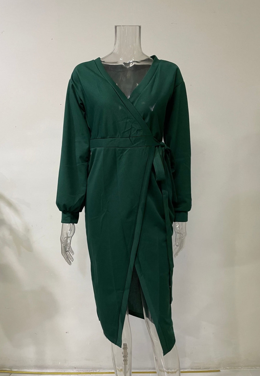 El vestido tiene un bonito estilo cruzado. Es de color liso, tiene escote cruzado, mangas largas y largo hasta la mitad de la pantorrilla. Combínalo con un clutch y tacones para lograr un look sofisticado.