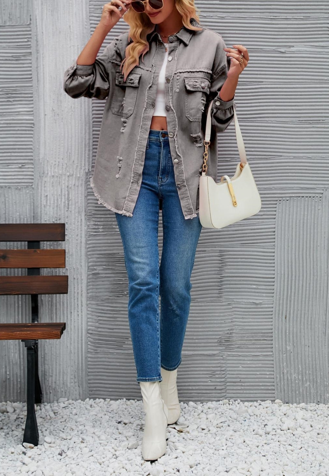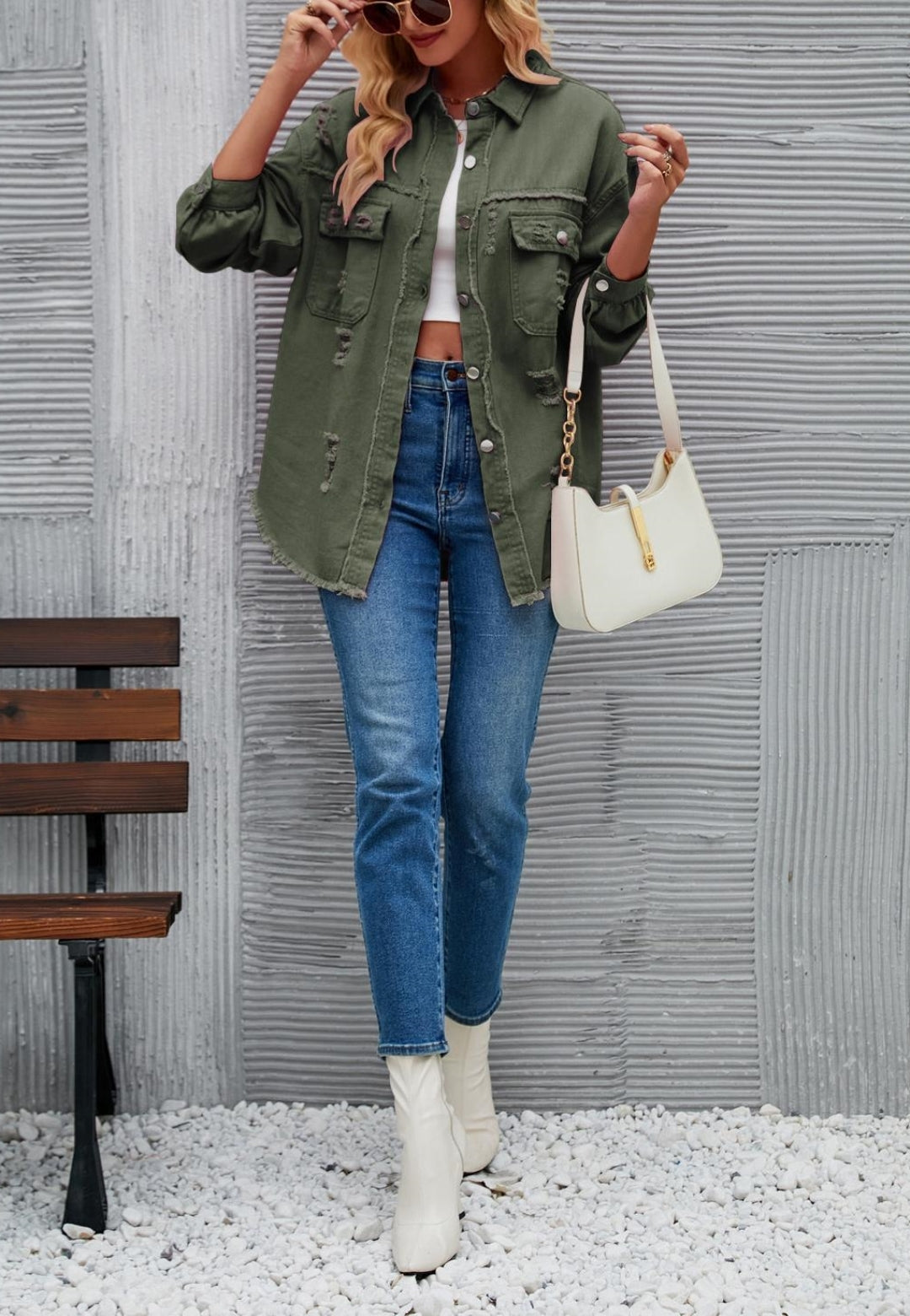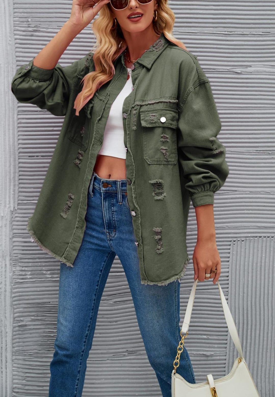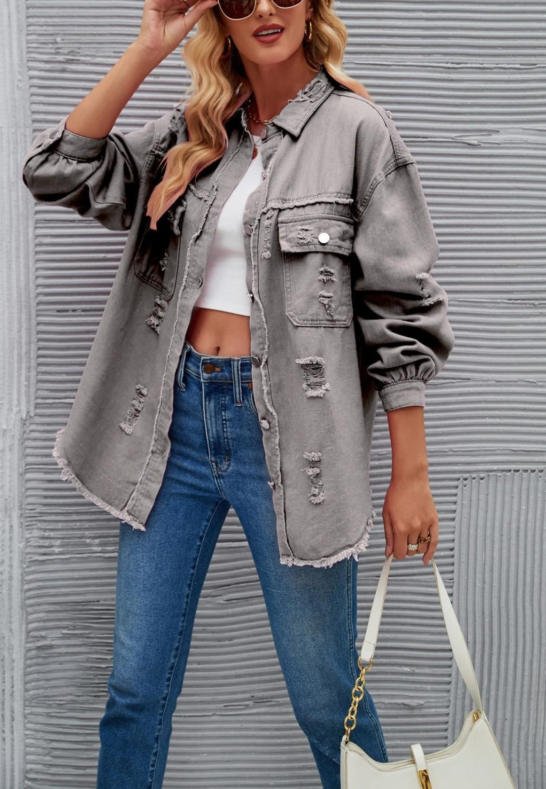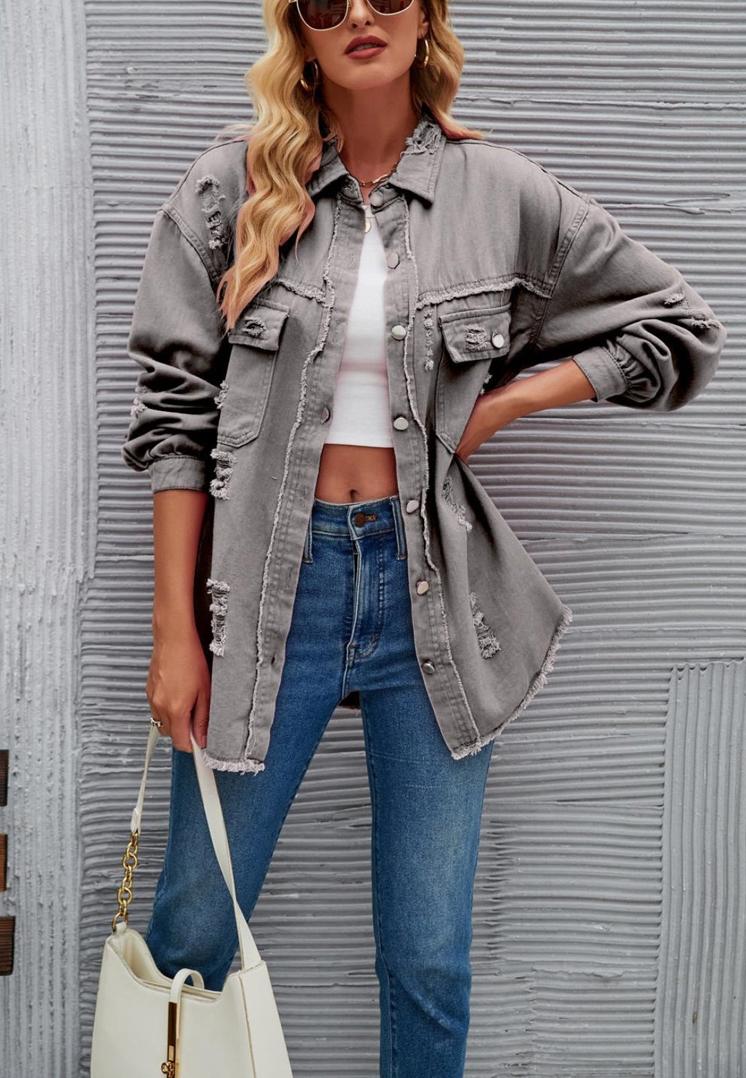 La chaqueta tiene un diseño desgastado y atrevido. Tiene un color liso, cuello, cierre con botones, mangas largas y un corte holgado. Llévala encima de una camiseta y unos jeans para lograr un look divertido.