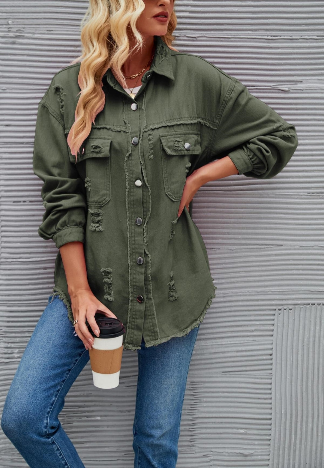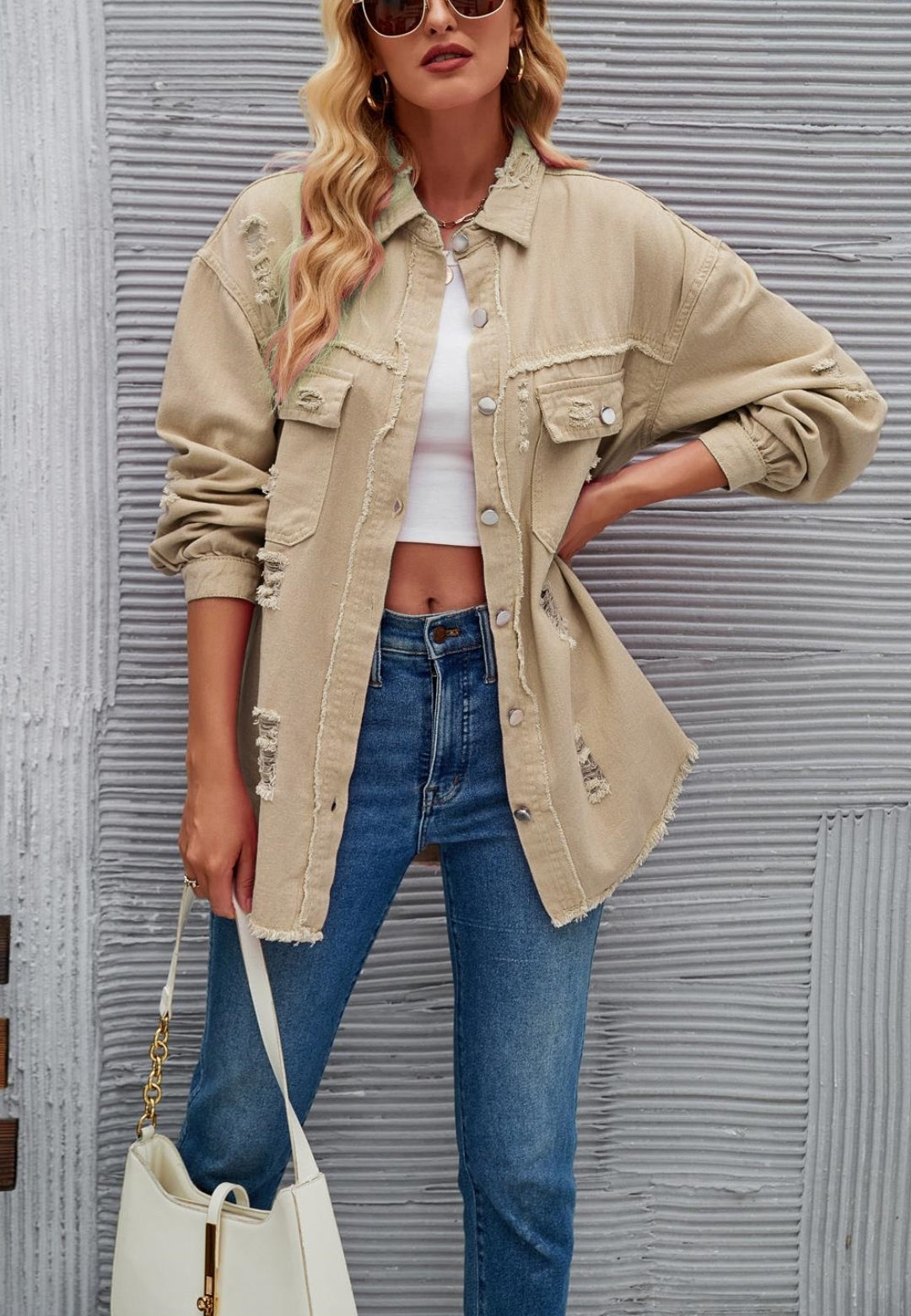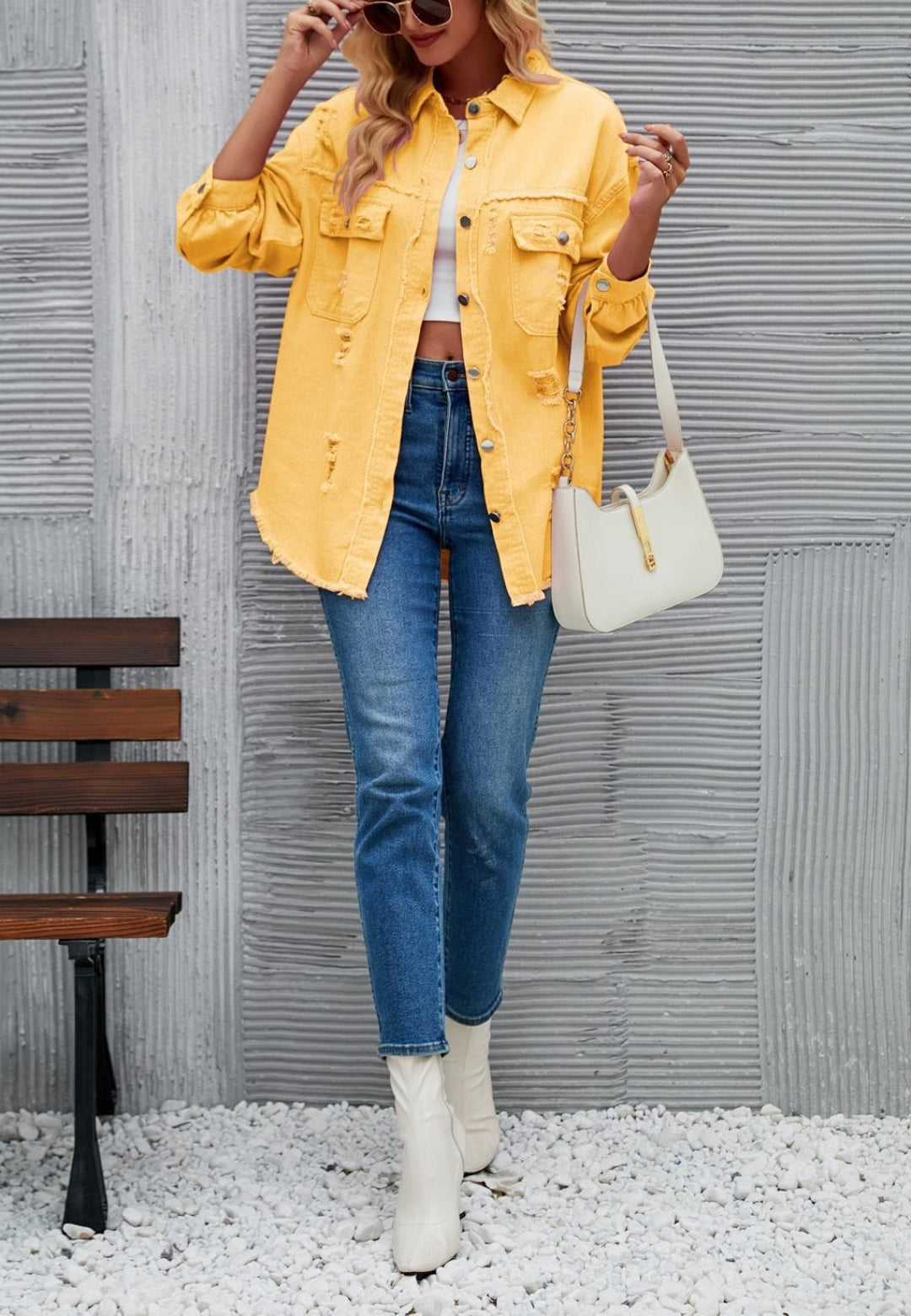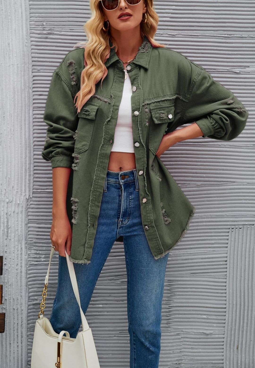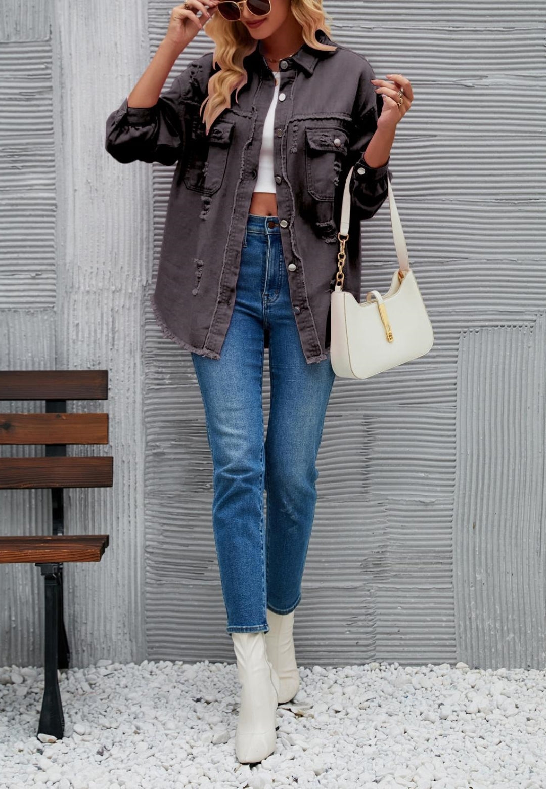 La chaqueta tiene un diseño desgastado y atrevido. Tiene un color liso, cuello, cierre con botones, mangas largas y un corte holgado. Llévala encima de una camiseta y unos jeans para lograr un look divertido.