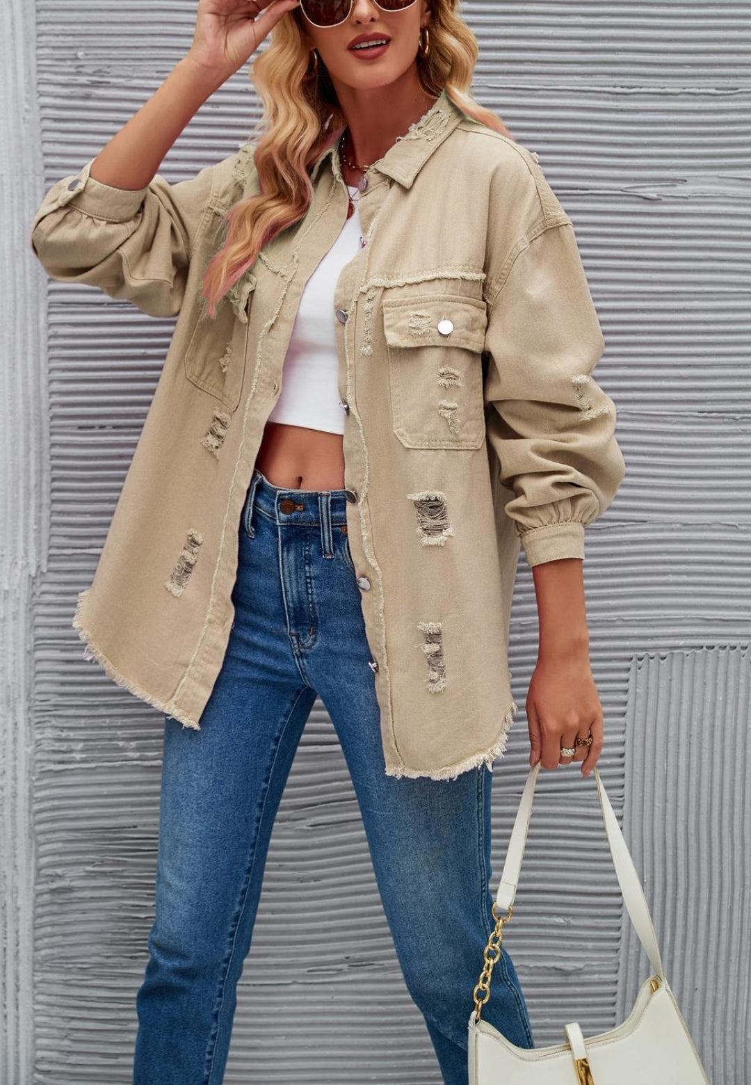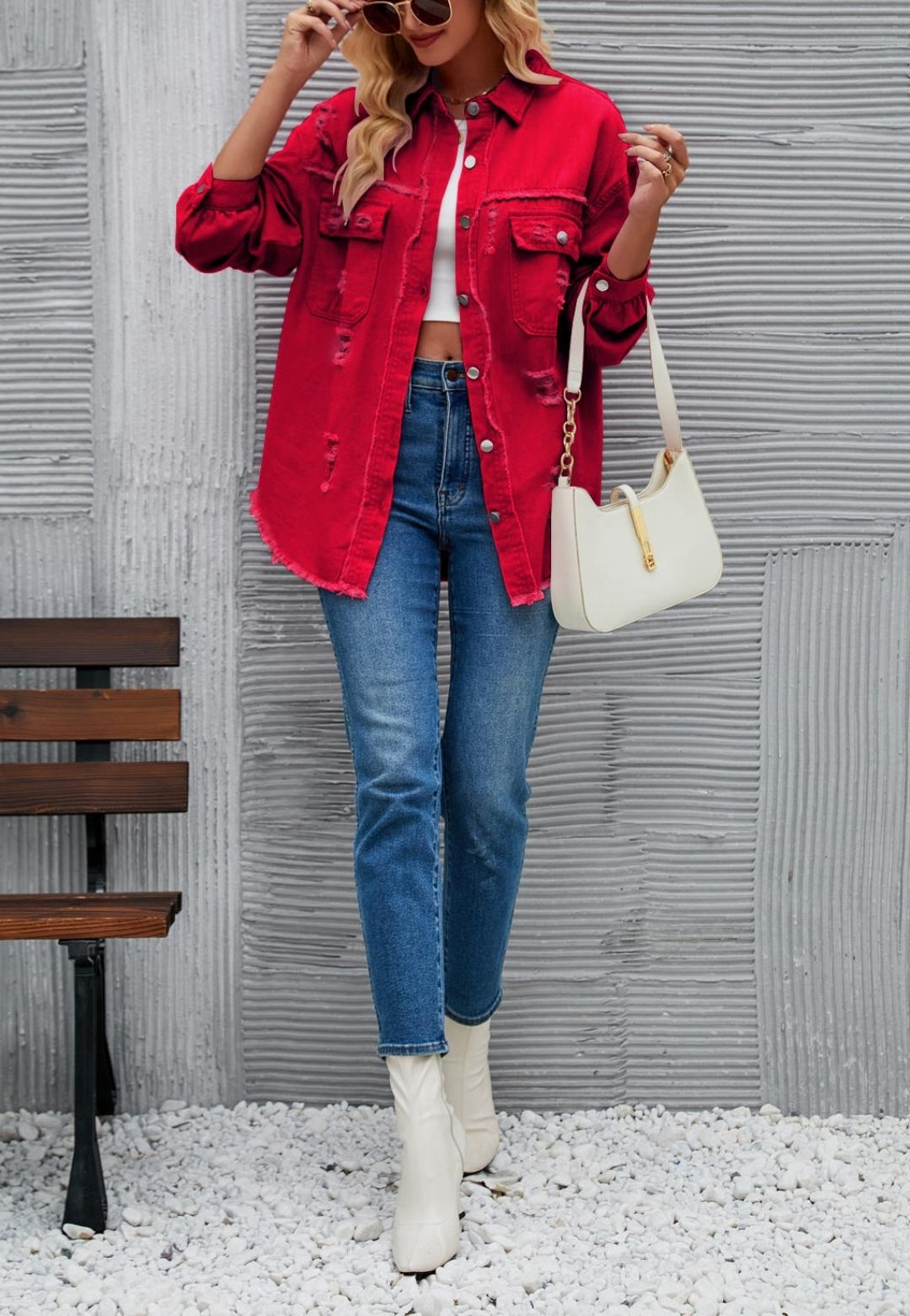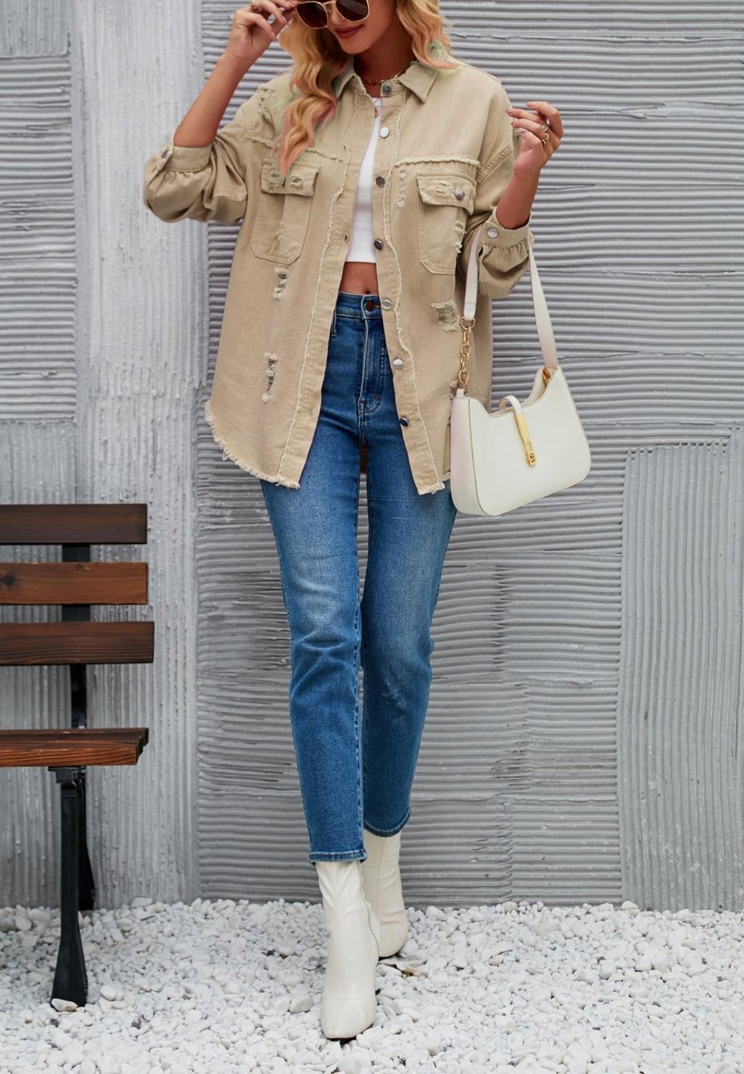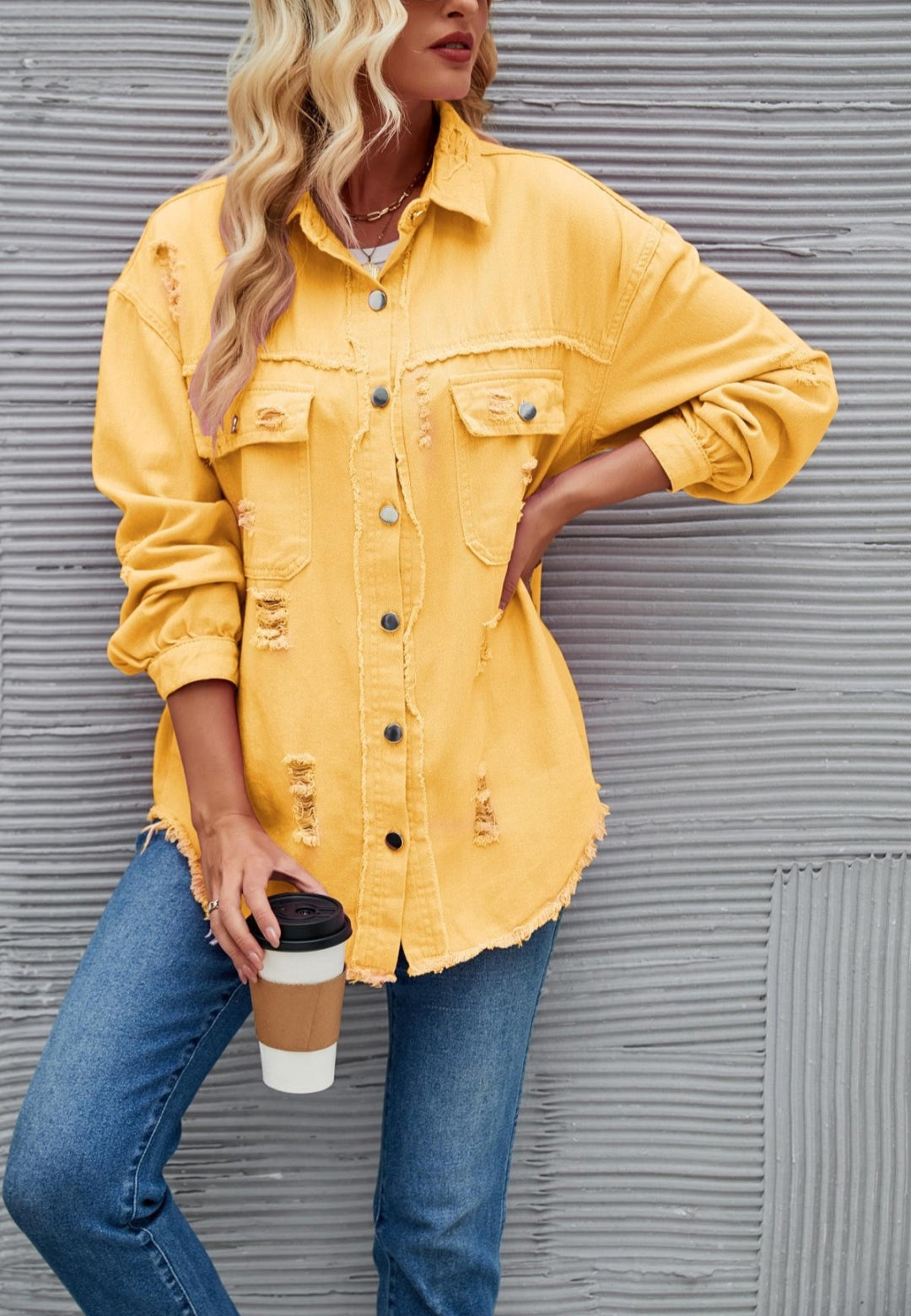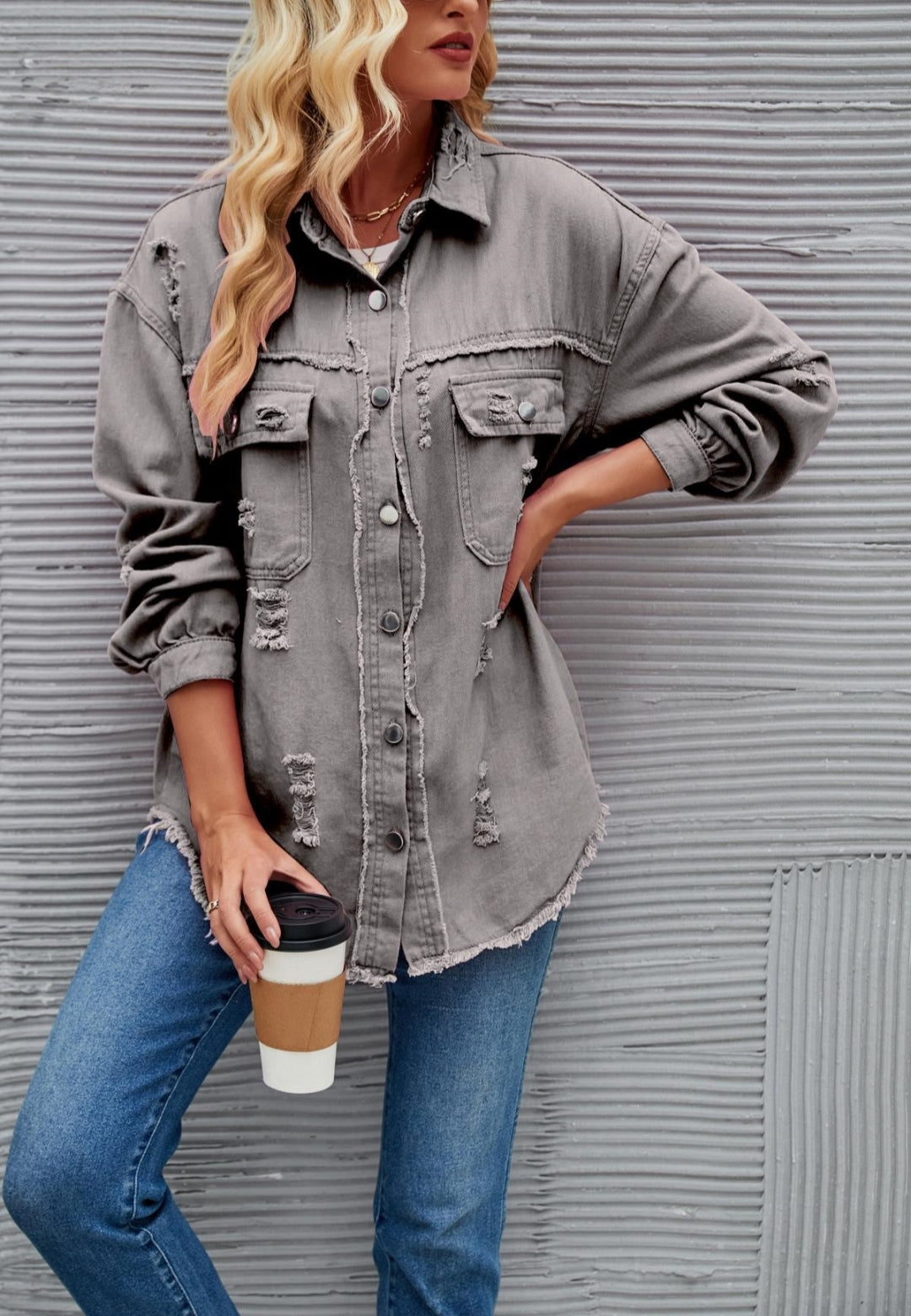 La chaqueta tiene un diseño desgastado y atrevido. Tiene un color liso, cuello, cierre con botones, mangas largas y un corte holgado. Llévala encima de una camiseta y unos jeans para lograr un look divertido.