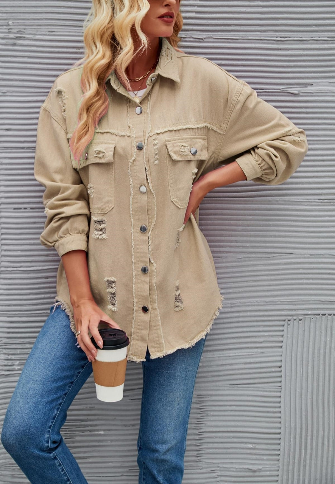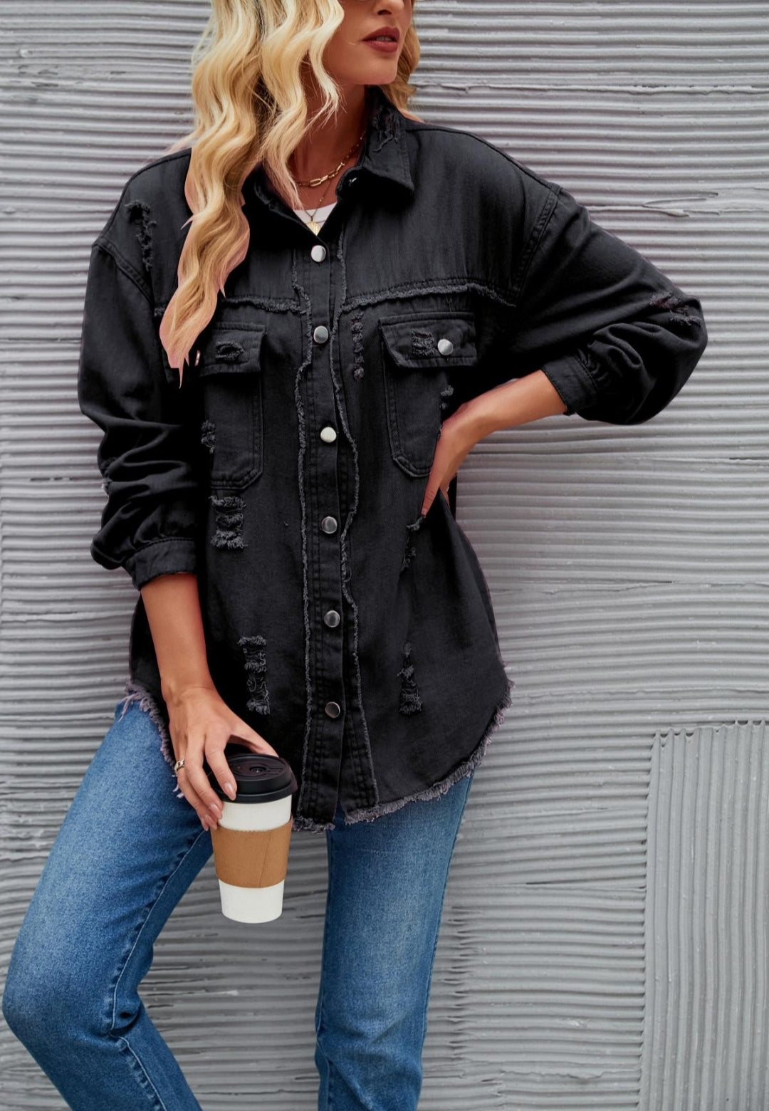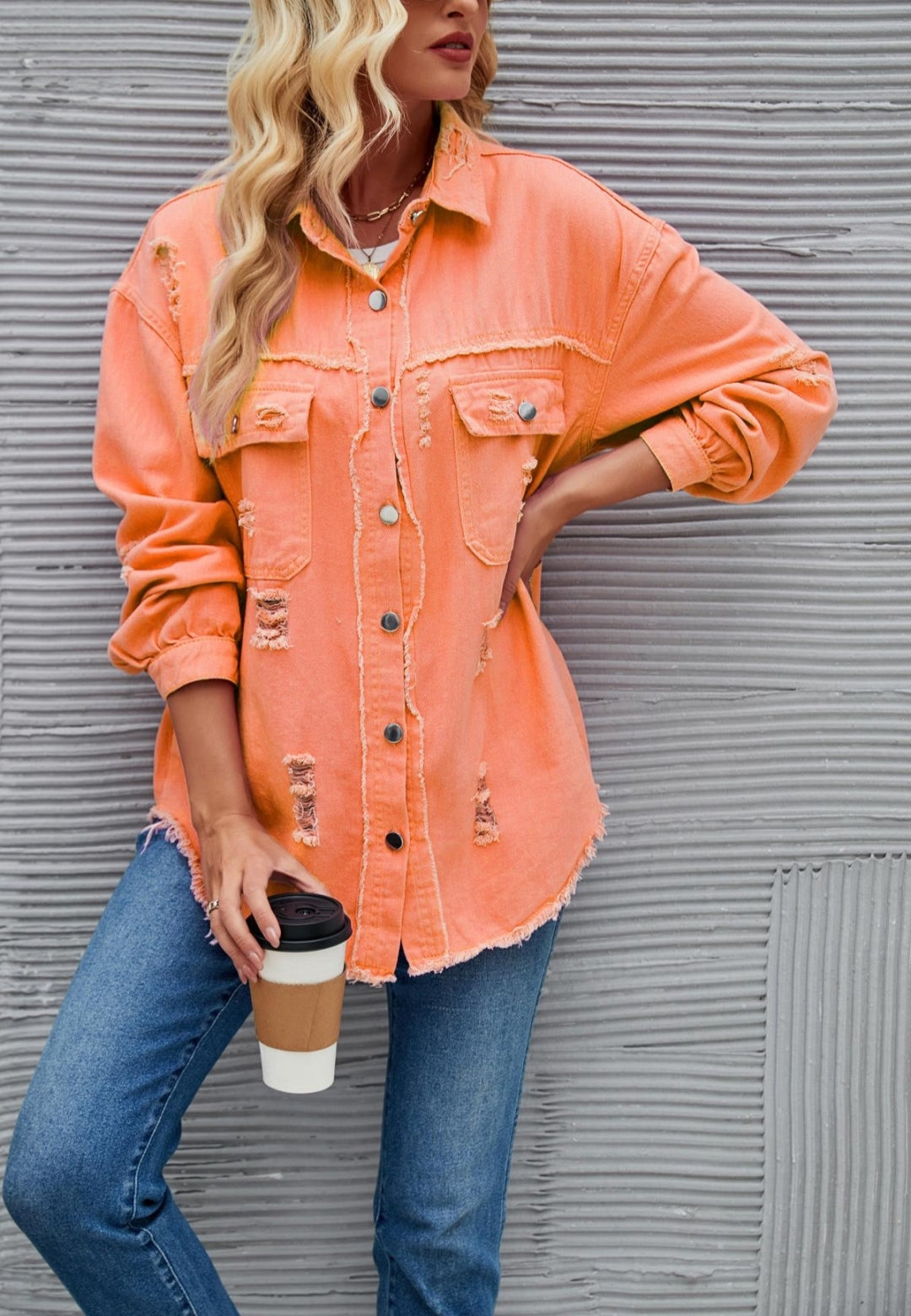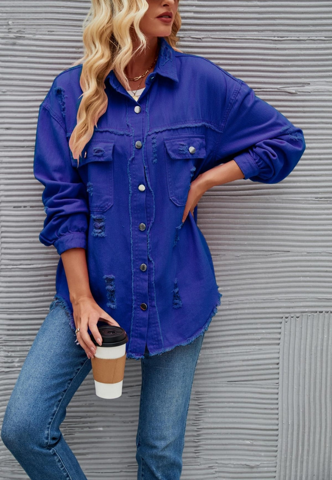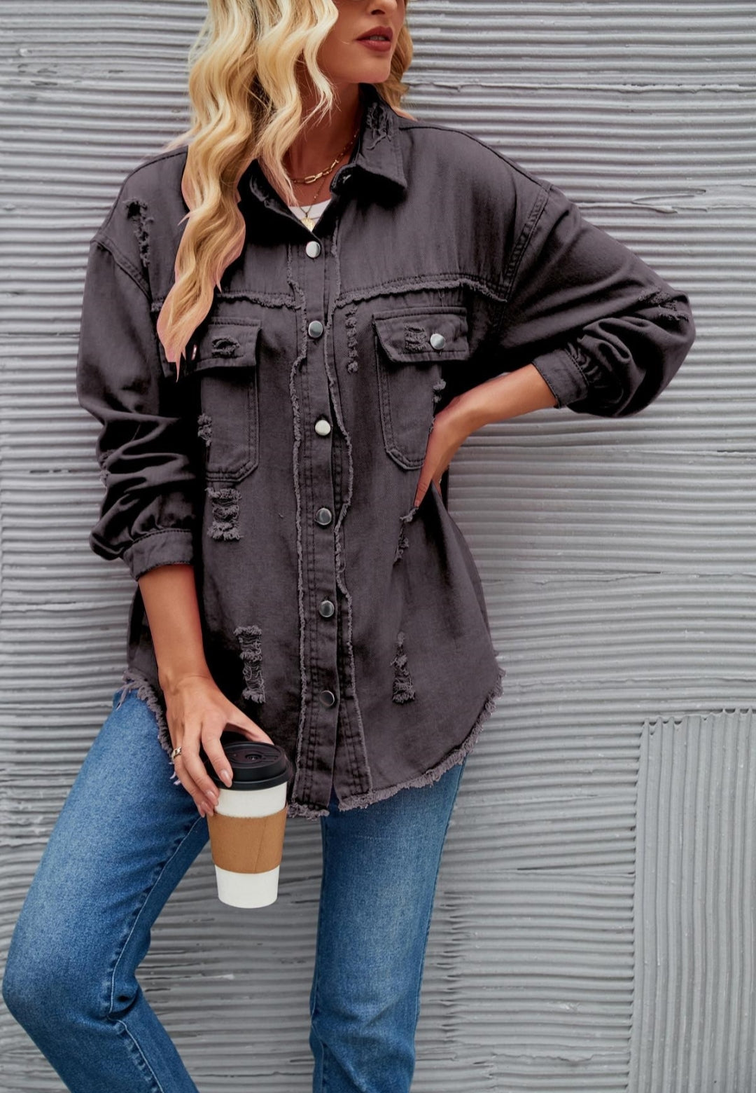 La chaqueta tiene un diseño desgastado y atrevido. Tiene un color liso, cuello, cierre con botones, mangas largas y un corte holgado. Llévala encima de una camiseta y unos jeans para lograr un look divertido.