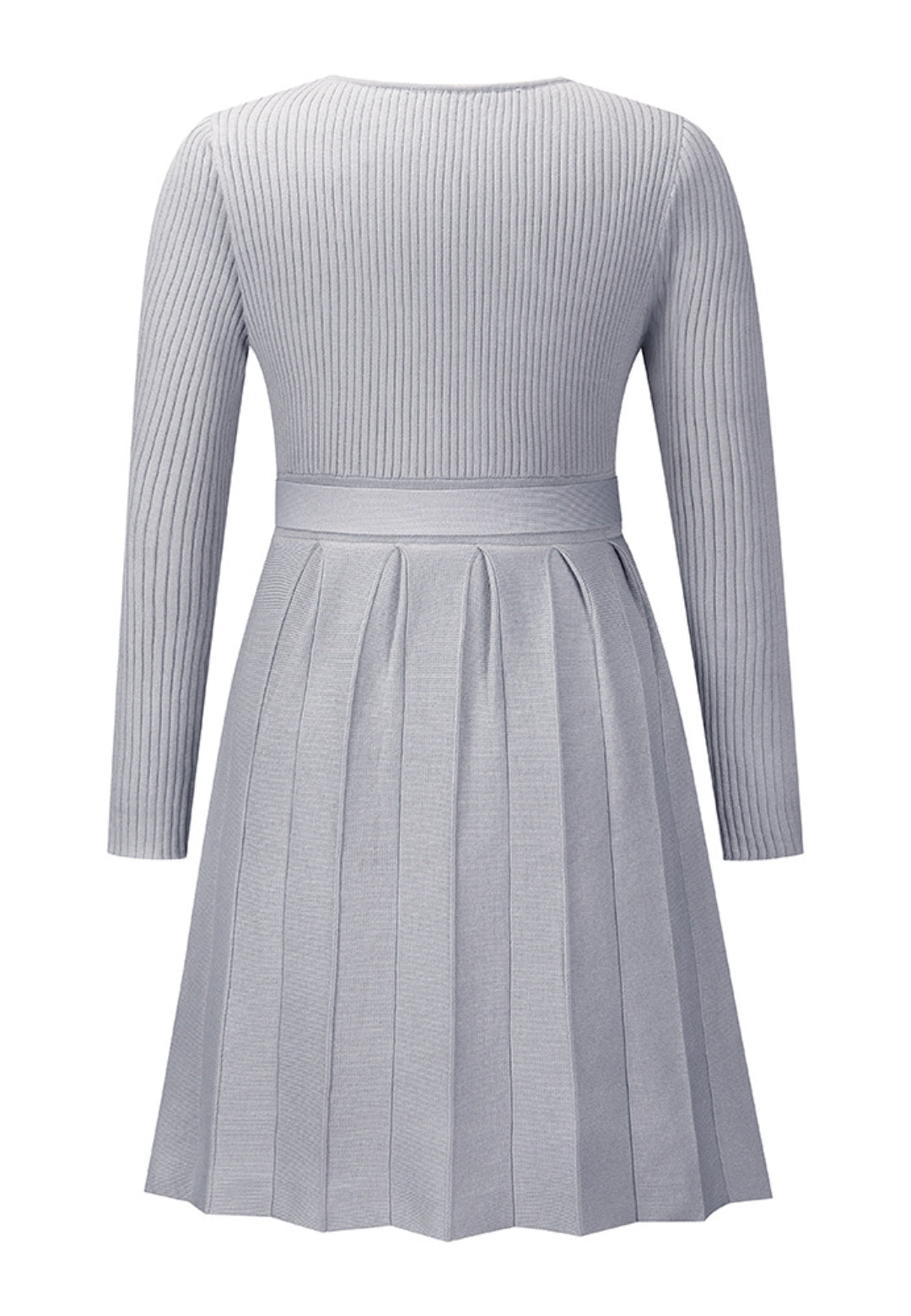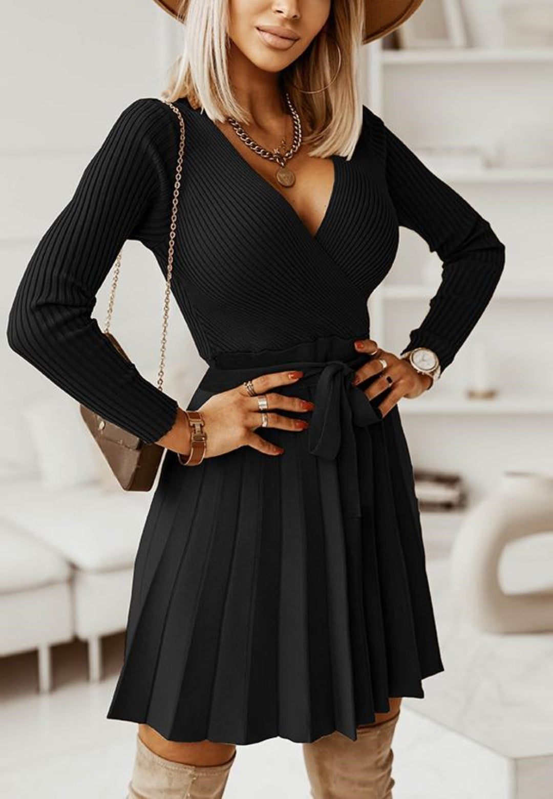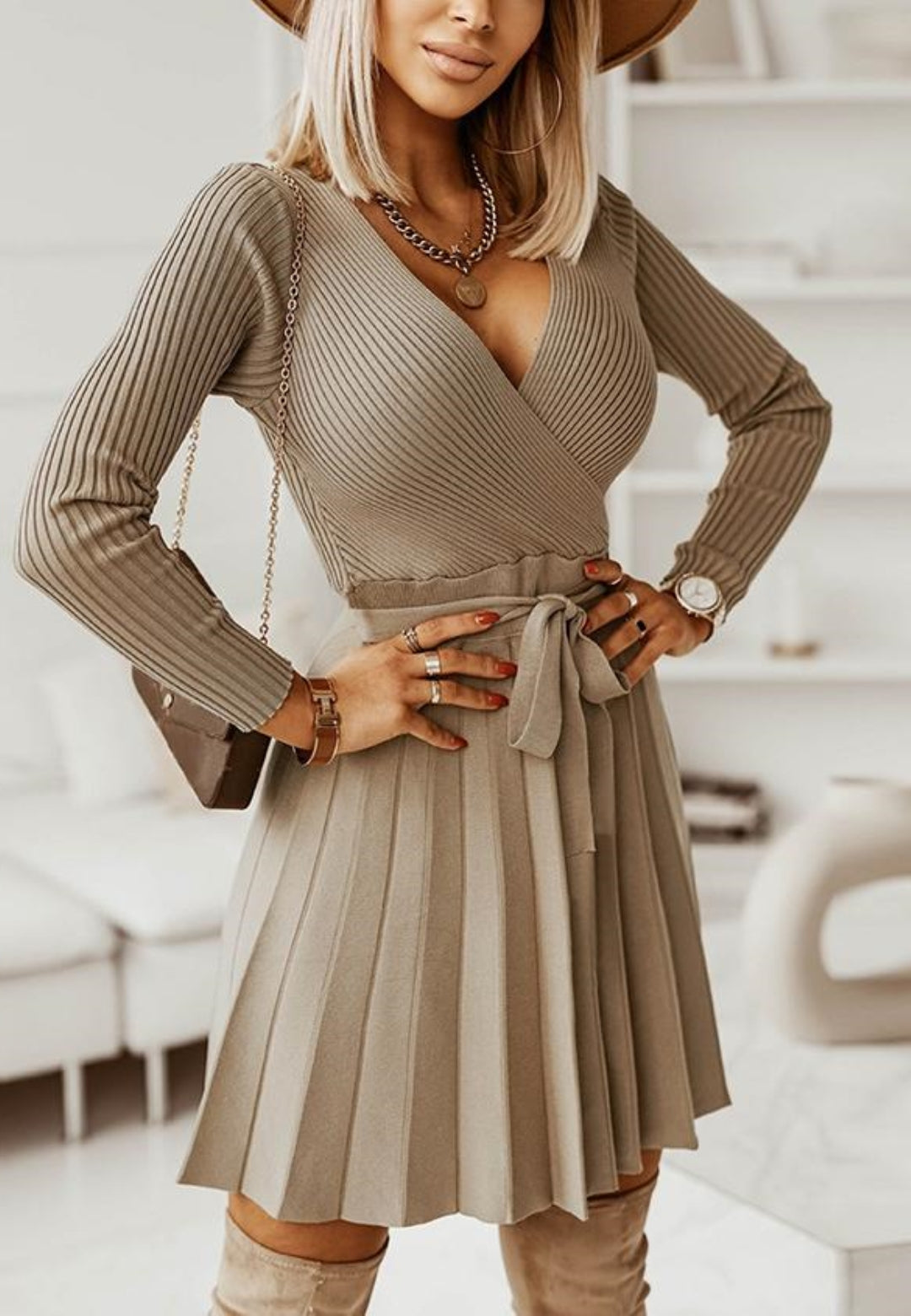 El vestido tiene una bonita falda plisada. Tiene tejido de punto acanalado, escote cruzado, mangas largas y largo por encima de la rodilla. Combínalo con un sombrero y botas para lograr un look elegante.