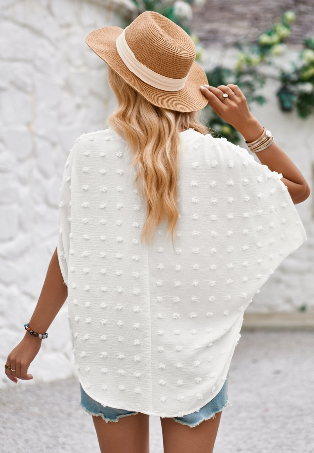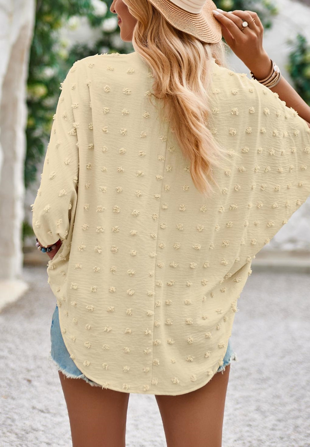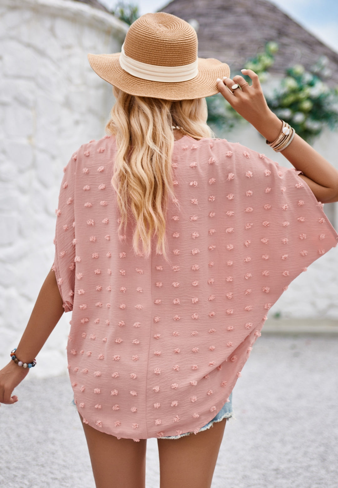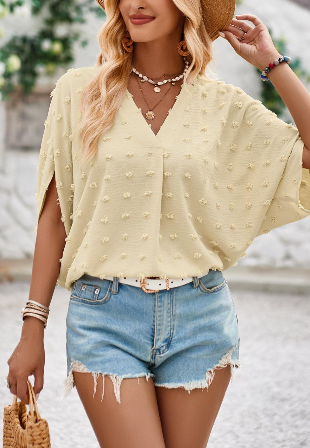 La blusa tiene mangas de murciélago únicas. Tiene escote en V, tela de lunares y corte holgado. Combínala con una falda y sandalias para lograr un estilo lindo.