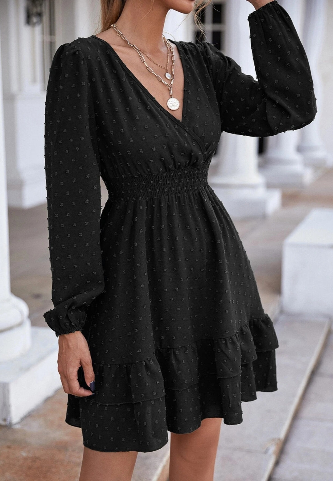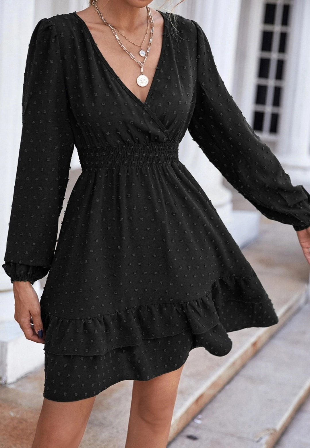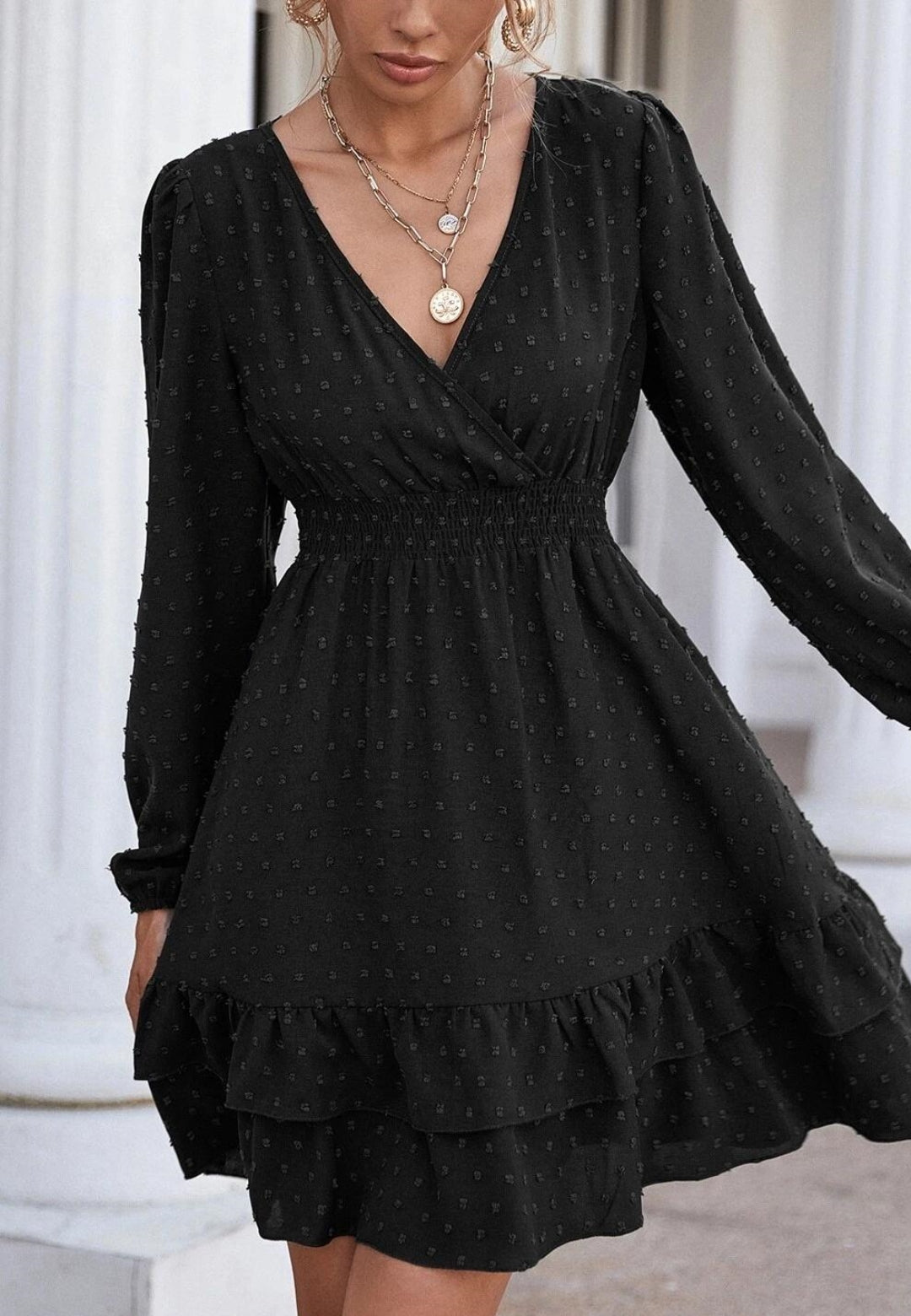 El vestido tiene un bonito dobladillo con volados escalonados. Tiene un tejido de lunares, escote cruzado, mangas largas y largo por encima de la rodilla. Combínalo con collares y tacones para lograr un look encantador.