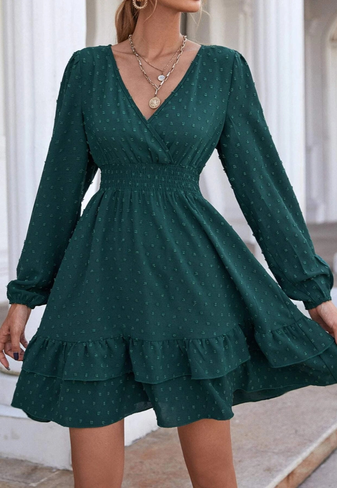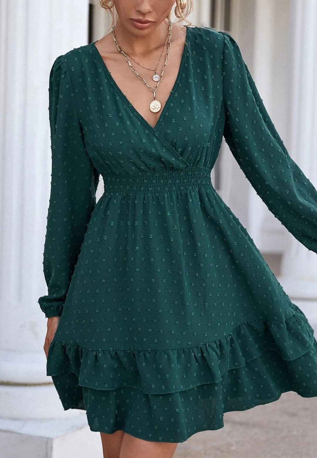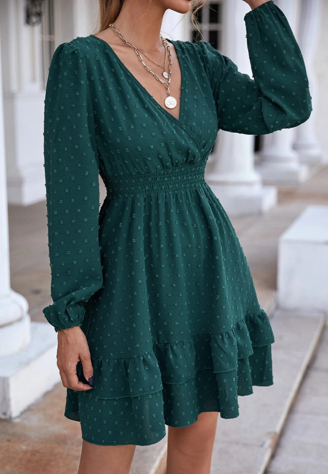 El vestido tiene un bonito dobladillo con volados escalonados. Tiene un tejido de lunares, escote cruzado, mangas largas y largo por encima de la rodilla. Combínalo con collares y tacones para lograr un look encantador.