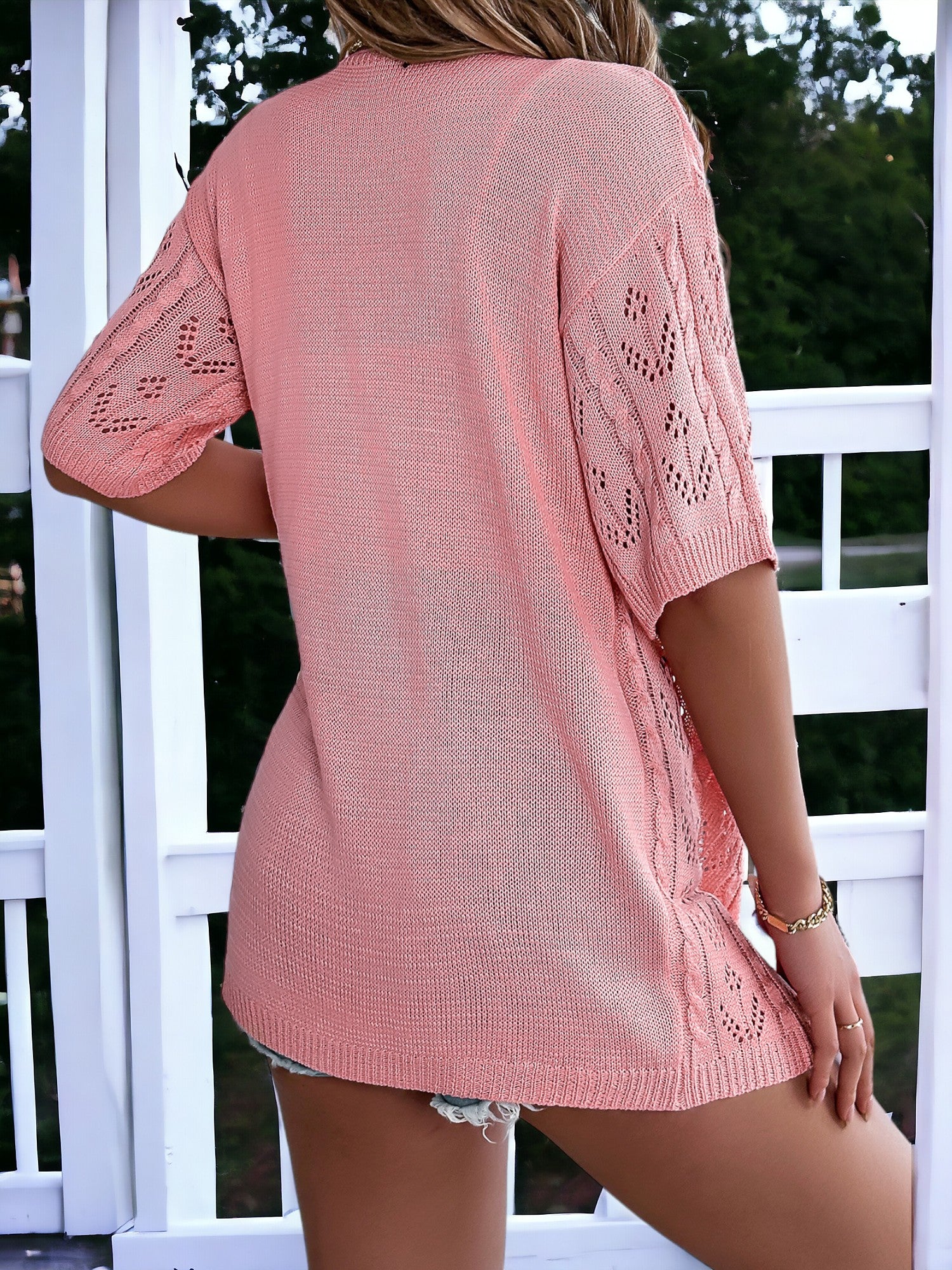 Descubra el estilo sencillo con nuestro cárdigan de punto de manga corta. Confeccionado teniendo en cuenta la comodidad y la versatilidad, este básico ligero añade un toque de elegancia a cualquier conjunto. Perfecto para llevar en capas o solo, su diseño atemporal promete comodidad y sofisticación. ¡Mejore su guardarropa con esta prenda imprescindible hoy mismo!