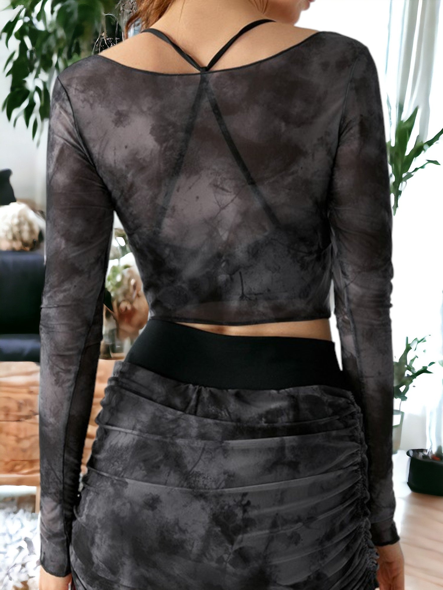 Top de fitness para yoga de malla ceñida con mangas largas y estampado