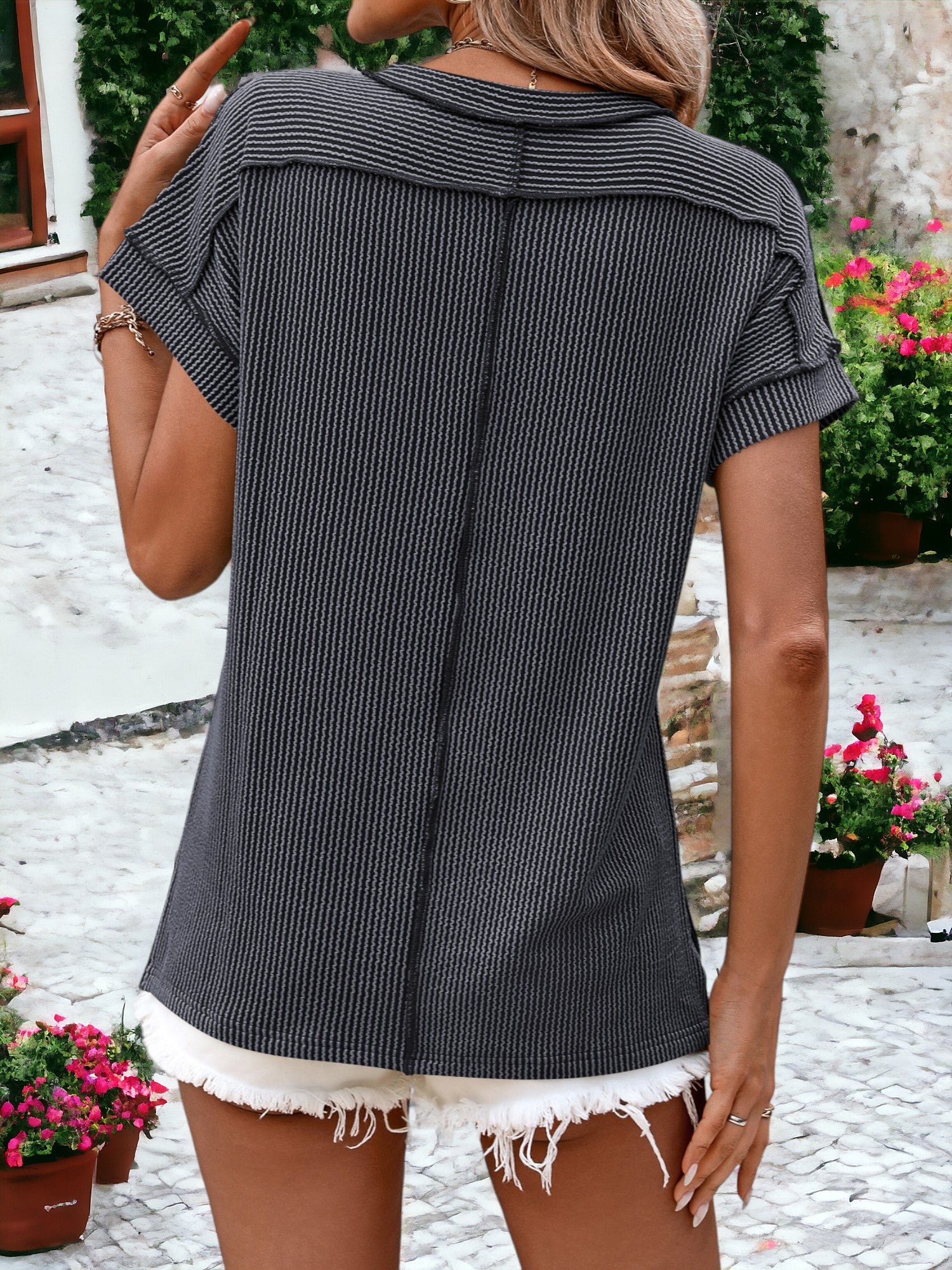 Camiseta de manga corta con cuello redondo y bordes expuestos con textura a rayas
