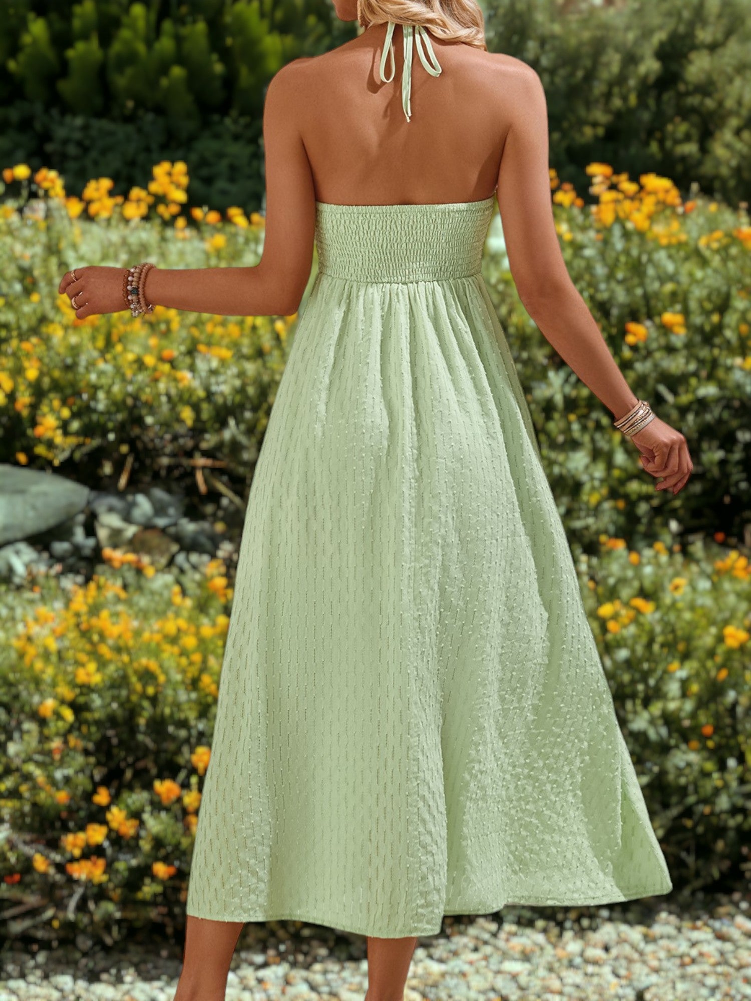 Vestido midi con cuello halter y tirantes finos cruzados de lunares suizos